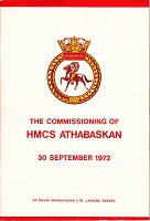 Third of her class, and built by the Davie Shipbuilding Co., Lauzon, ATHABASKAN was commissioned on 30 Sep 1972. On 26 Nov 1981, she was dispatched, along with Algonquin and Preserver, to the aid of the M.V. Euro Princess, which was badly holed and drifting down on the drill-rig Rowan Juneau, off Sable Island. Rescue helicopters took off the ship's crew, while ATHABASKAN’s Sea King evacuated 44 from the drill-rig despite 60-knot winds. This procedure had to be done “free-deck” at both ends, owing to a malfunction of her Beartrap. The abandoned merchant ship was recovered by CGS Alert.