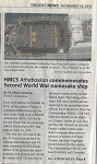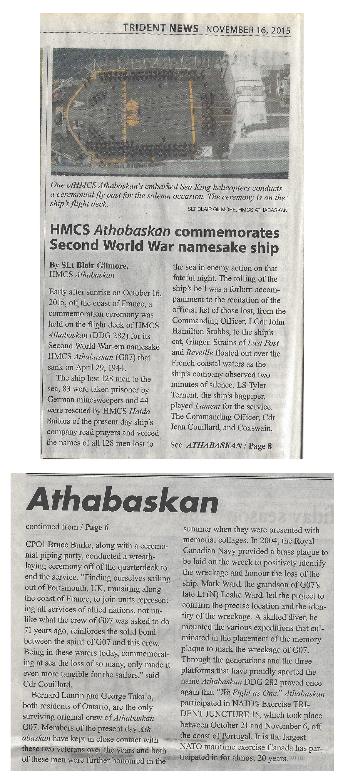 (ATHB023) HMCS ATHABASKAN 282 phone directory // From the collection of Steven Whyte (ATBH024) Newspaper article from the Trident Magazine on a memorial service conducted on HMCS ATHABASKAN 282 on 16 Oct 2015, off the coast of France, for those lost on HMCS ATHABASKAN G07 by SLt Blair Gilmore, HMCS ATHABASKAN // Courtesy of Blair Gilmore (ATHB025) Three Sea Kings do a fly past during HMCS ATHABASKAN'S final sail past - 10 Mar 2017 // Photographer John Floyd // © John Floyd 2017