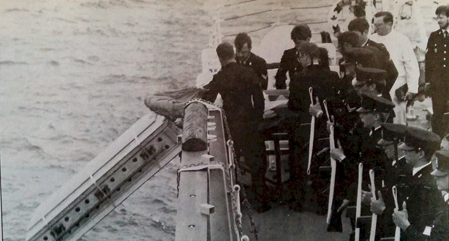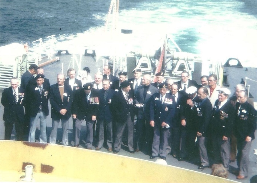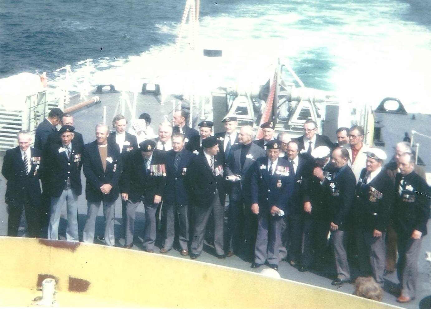 Surviving crew members for HMCS ATHABASKAN G07 onboard HMCS ATHABASKAN 282 in the English Channel near where HMCS ATHABASKAN G07 was sunk - 1974 Click on the above photo to view a larger image