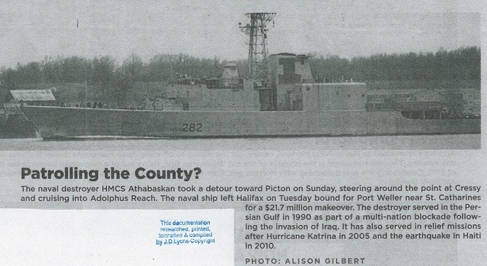 (ATHB018) Newspaper article on the visit of HMCS ATHABASKAN 282 to Picton, Ont. // The Wellington Times, 28 Mar 2012 // Courtesy of John Lyons (ATHB019) HMCS ATHABASKAN celebrated her 40th and 41st birthday during a dependent day sail on 04 Oct 2013 // They couldn't celebrate the 40th properly due to refit last year // Courtesy of Rejean Trudeau (ATHB020) HMCS ATHABASKAN 282 - Exercise Joint Warrior - 2015 // Courtesy of Scott Murphy (ATHB021) HMCS ATHABASKAN 282 participating in the sail past at Halifax at the start of Exercise Cutlass Fury - 12 Sep 2016 // Courtesy of Clarence Hemeon (ATHB022) HMCS ATHABASKAN 282 during transit to participate in the Sub Commanders Course in the Caribbean, on November 9, 2016 // Photographer: Cpl Tony Chand, Formation Imaging Services, HS05-2016-1056-2870 // © DND Crown Copyright 2016