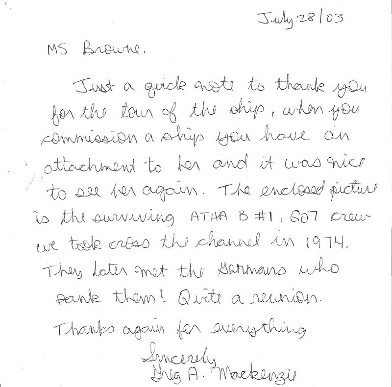 In 2003, Greg Mackenzie, a commissioning crew member for HMCS ATHABASKAN 282, received a tour of HMCS ATHABASKAN 282 from MS David Brown. Greg sent David a thank you letter for the tour and sent him the above photo with the letter.