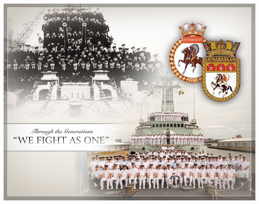 Montage that was presented to Mr. Ernie Takalo, a survivor of the sinking of HMCS ATHABASKAN G07, onboard HMCS HAIDA during a Remembrance Ceremony for the crew of ATHABASKAN G07. The montage has the last crew photo taken of HMCS ATHABASKAN G07 and a crew photo from HMCS ATHABASKAN 282