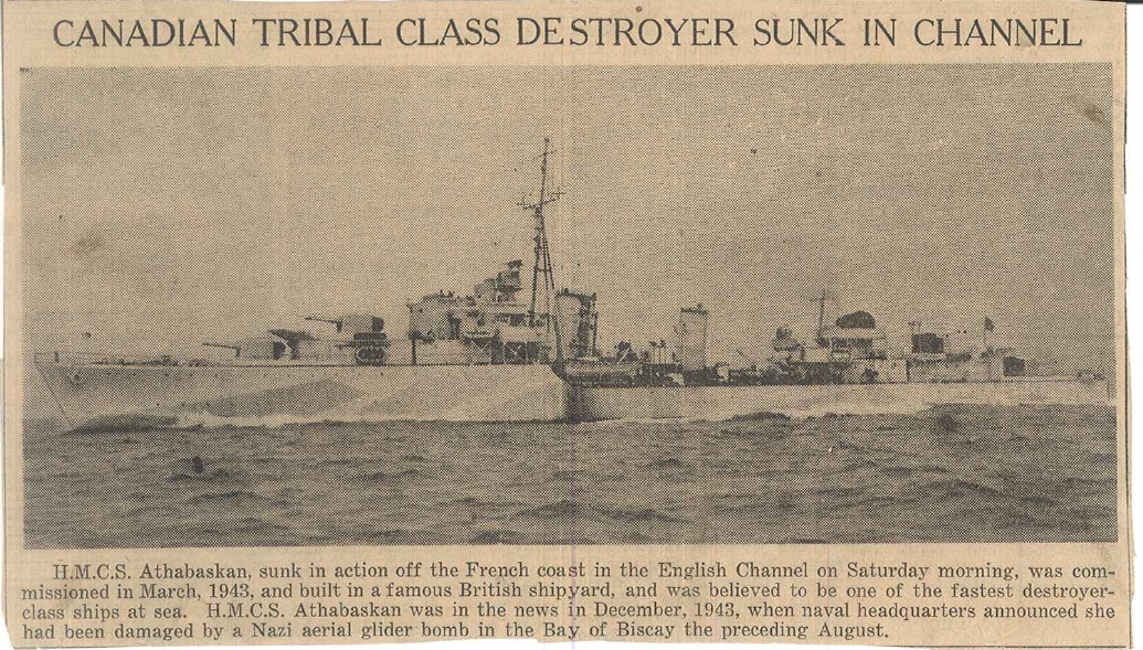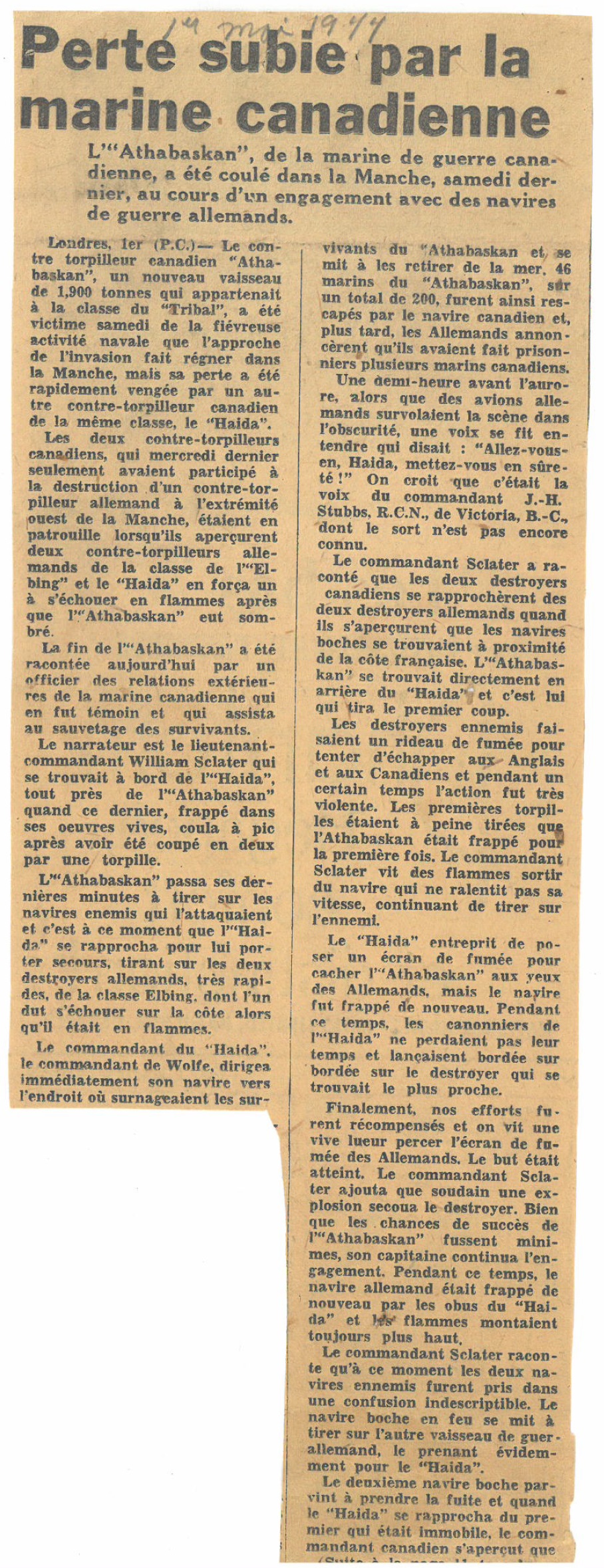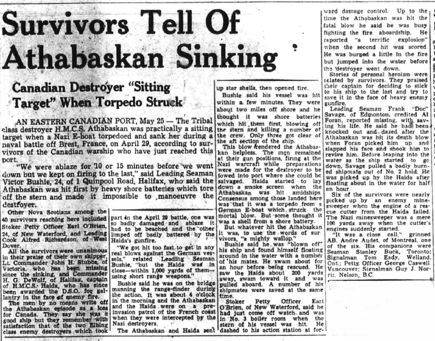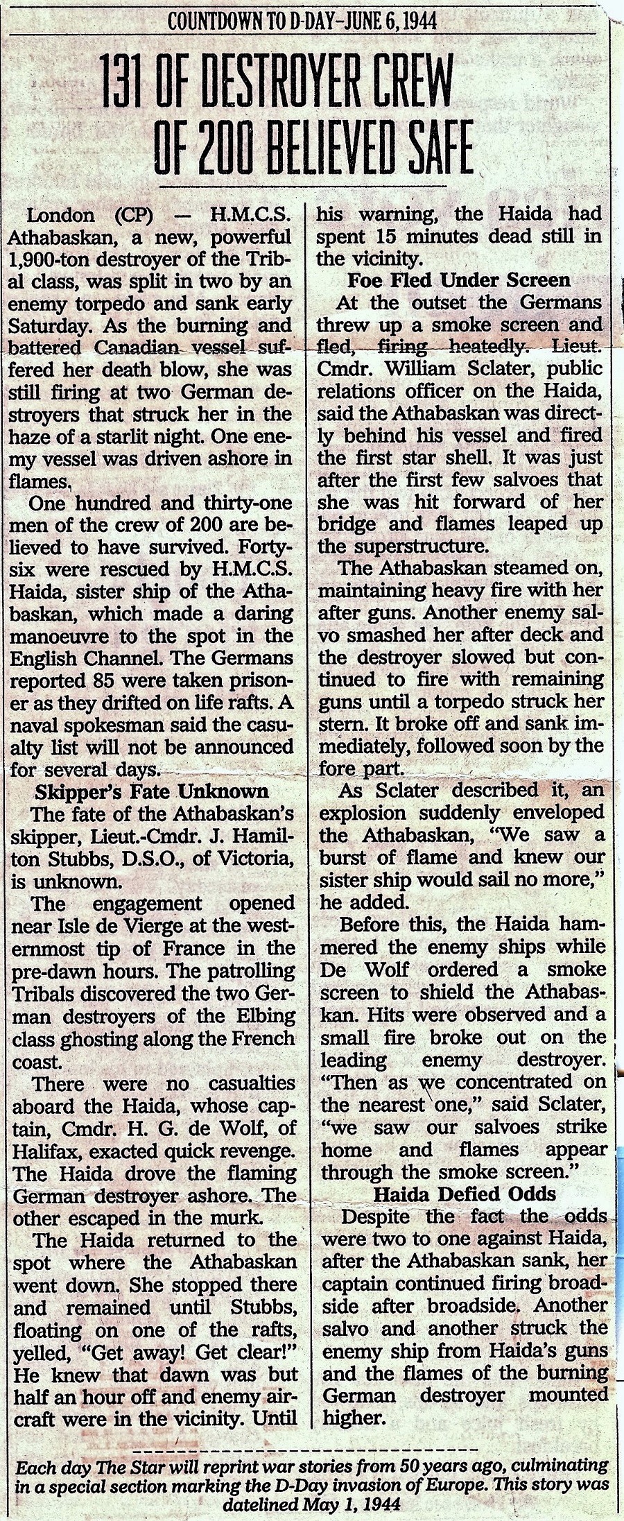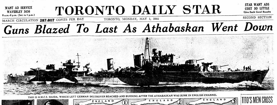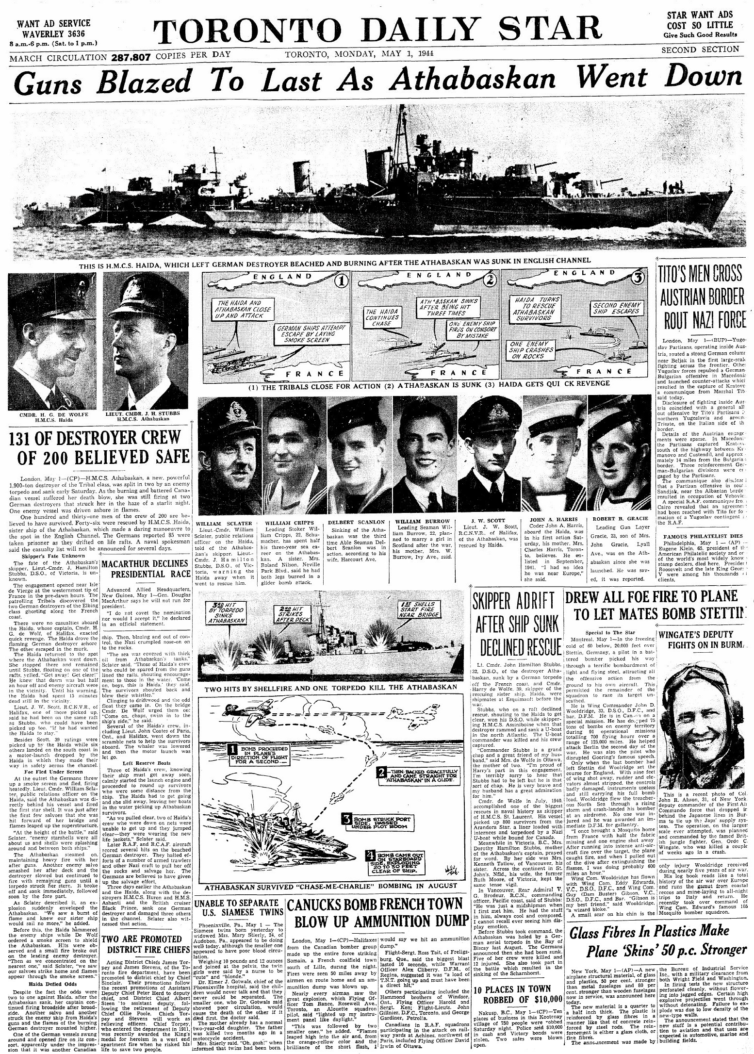 Front page article on the loss of the ATHABASKAN Toronto Daily Star, Monday 01 May 1944 Click on the above image to view the full front page