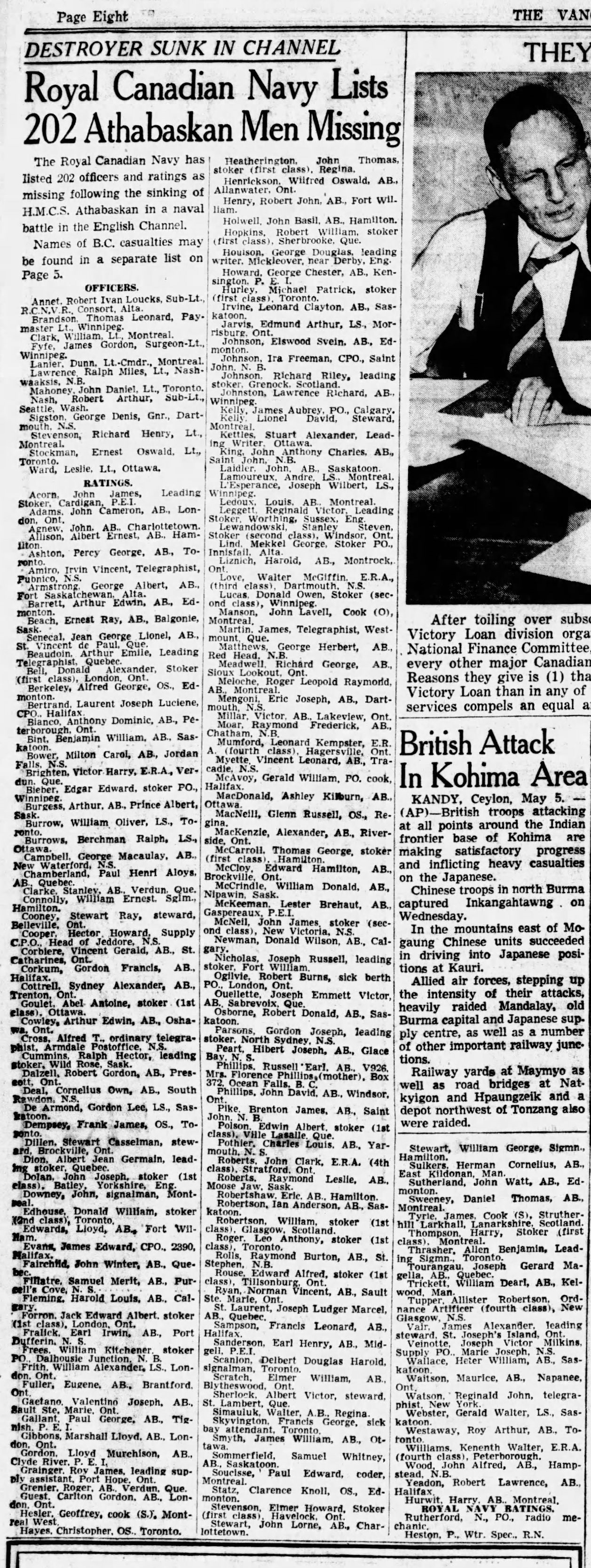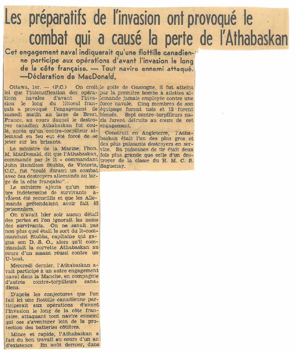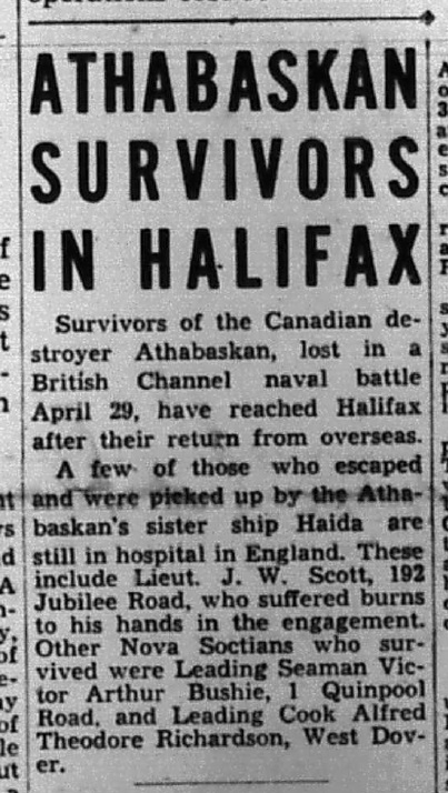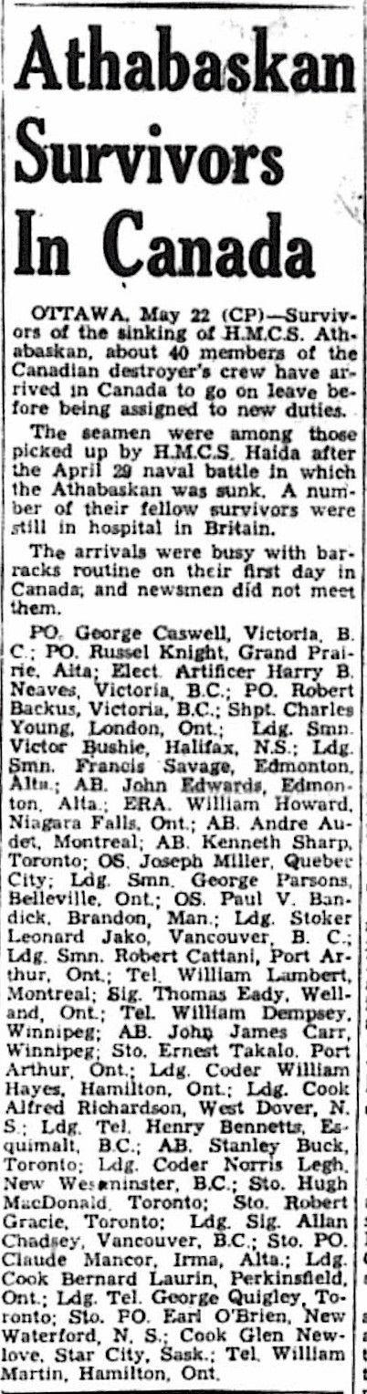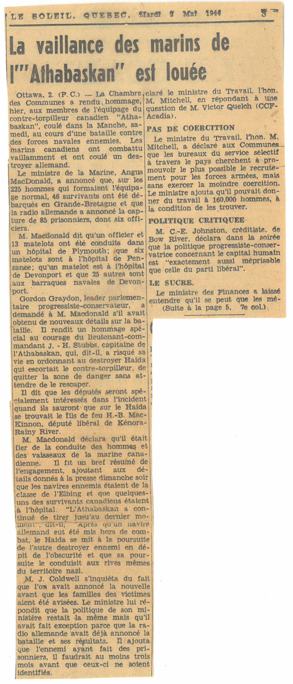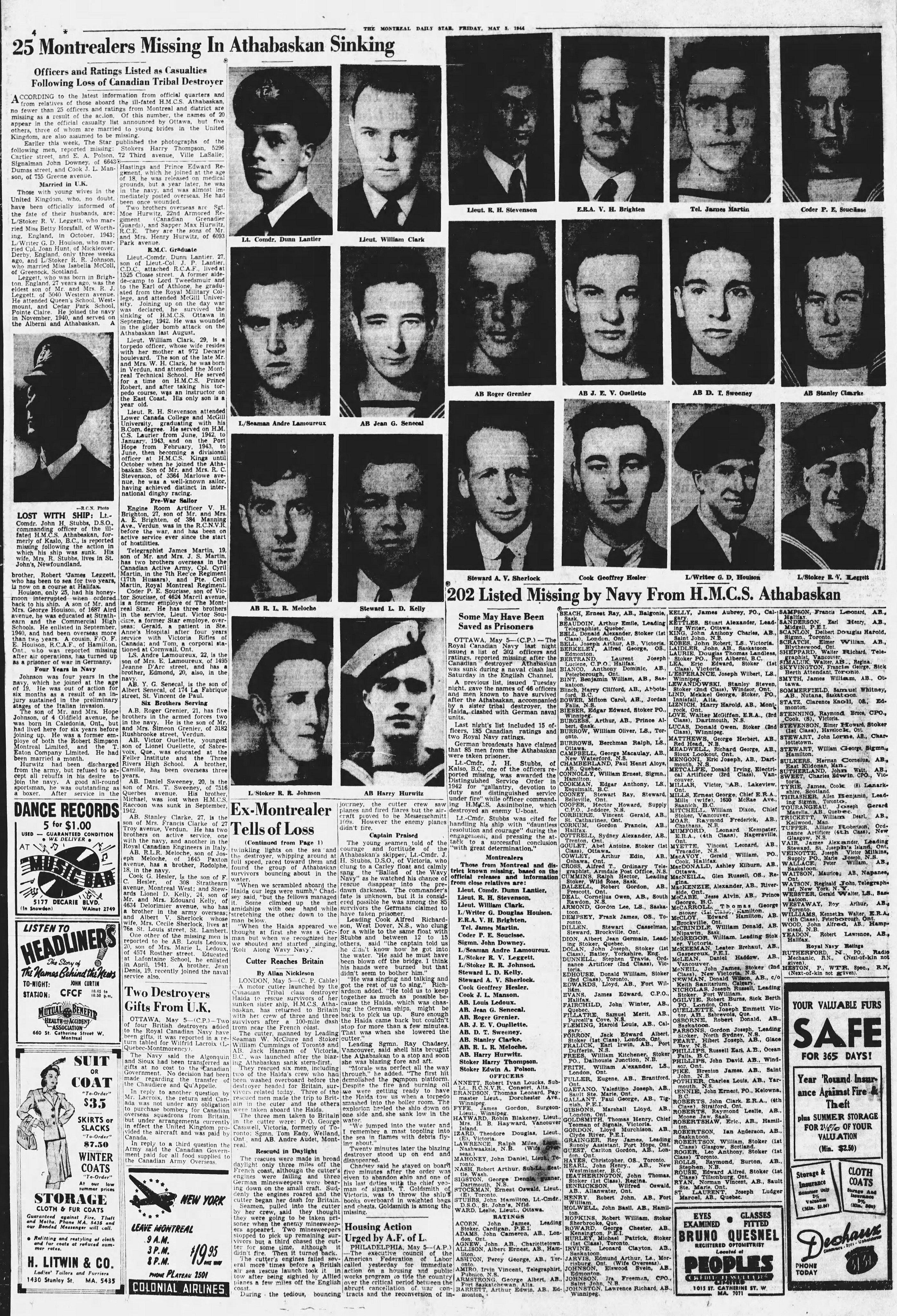 Front page article on the loss of the ATHABASKAN Toronto Daily Star, Monday 01 May 1944 Click on the above image to view the full front page