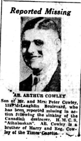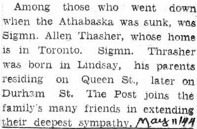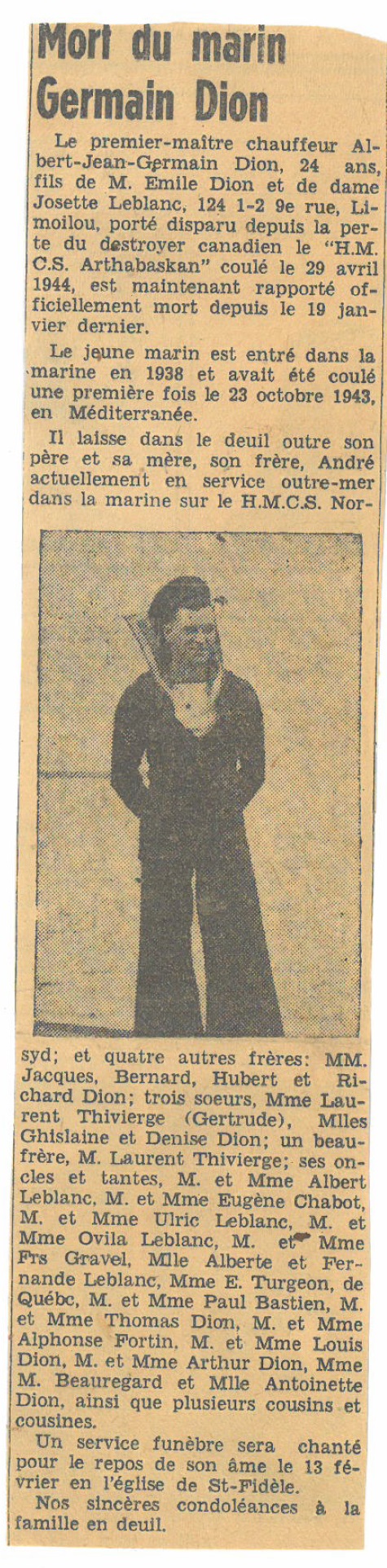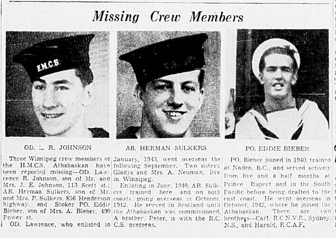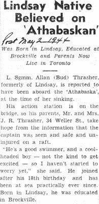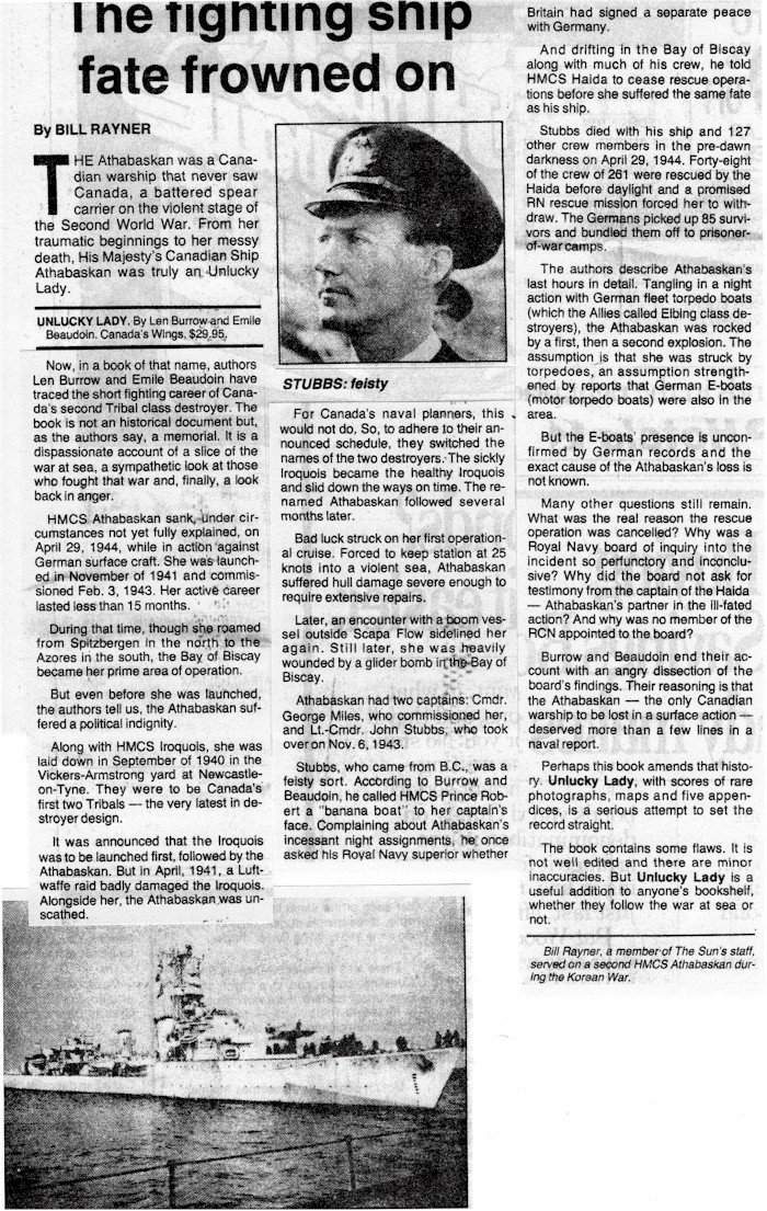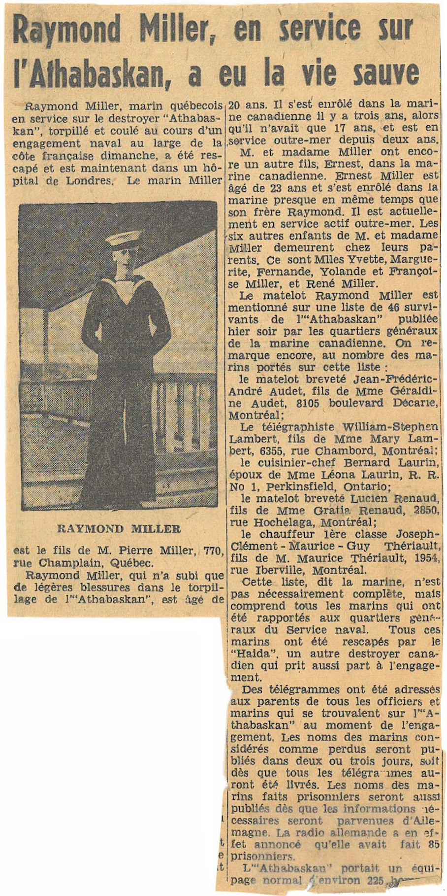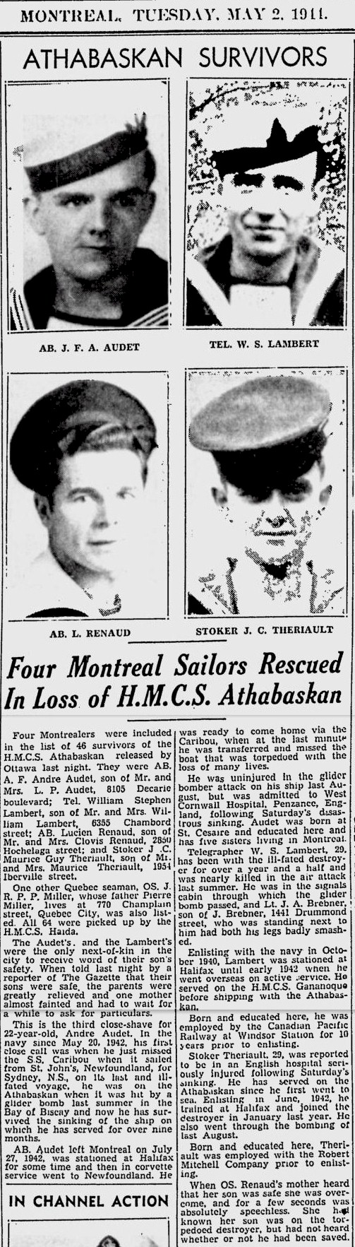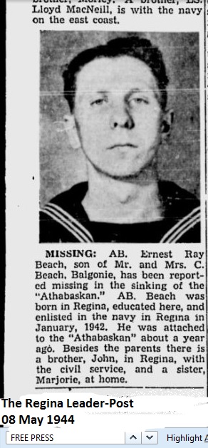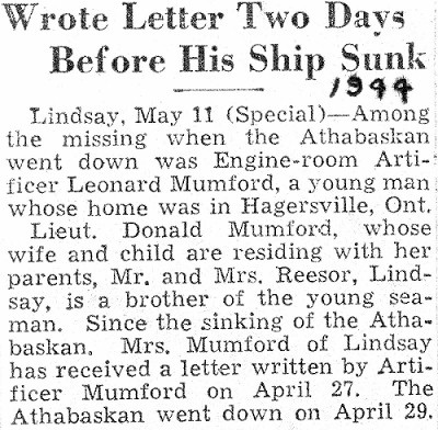 Front page article on the loss of the ATHABASKAN Toronto Daily Star, Monday 01 May 1944 Click on the above image to view the full front page