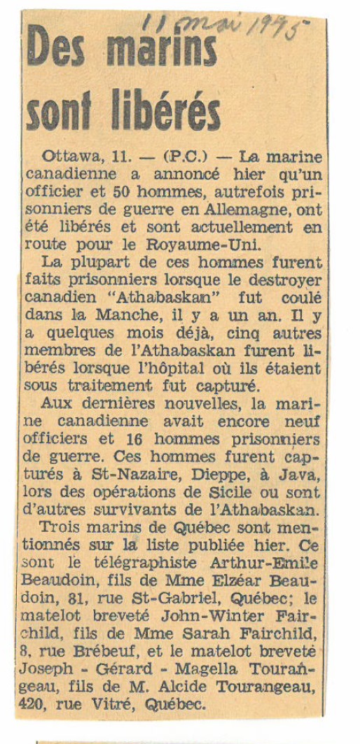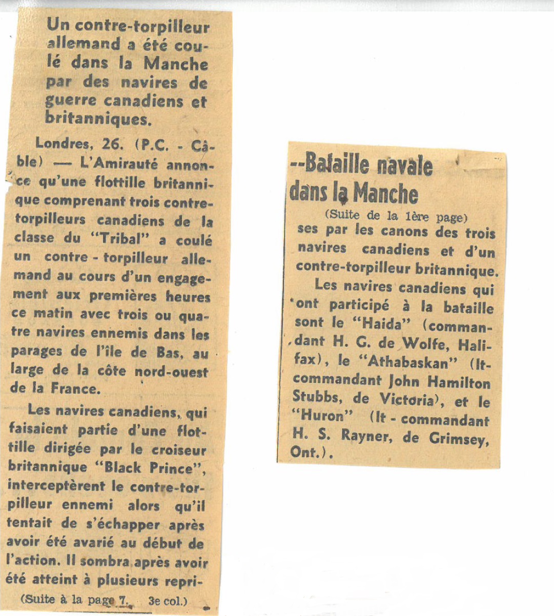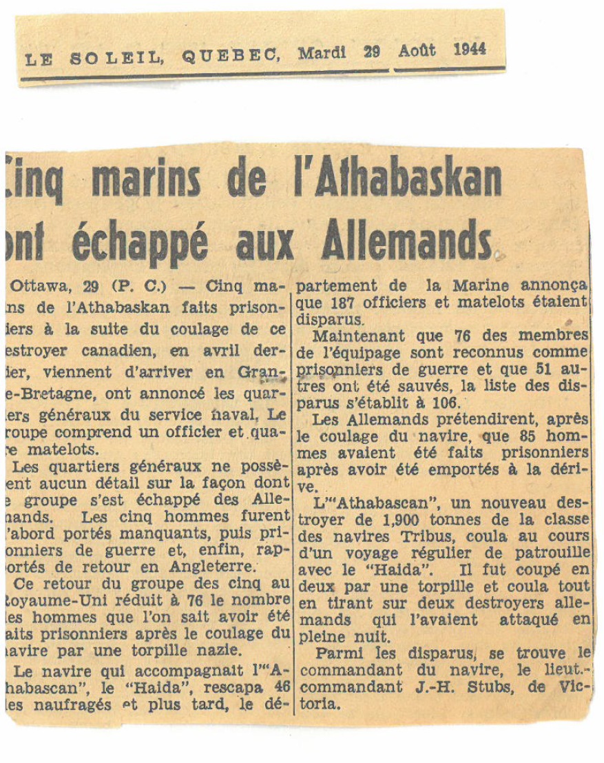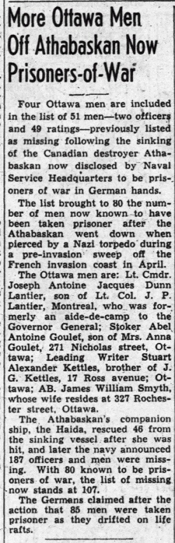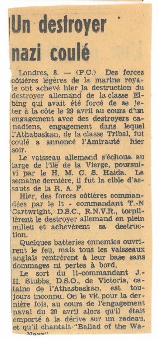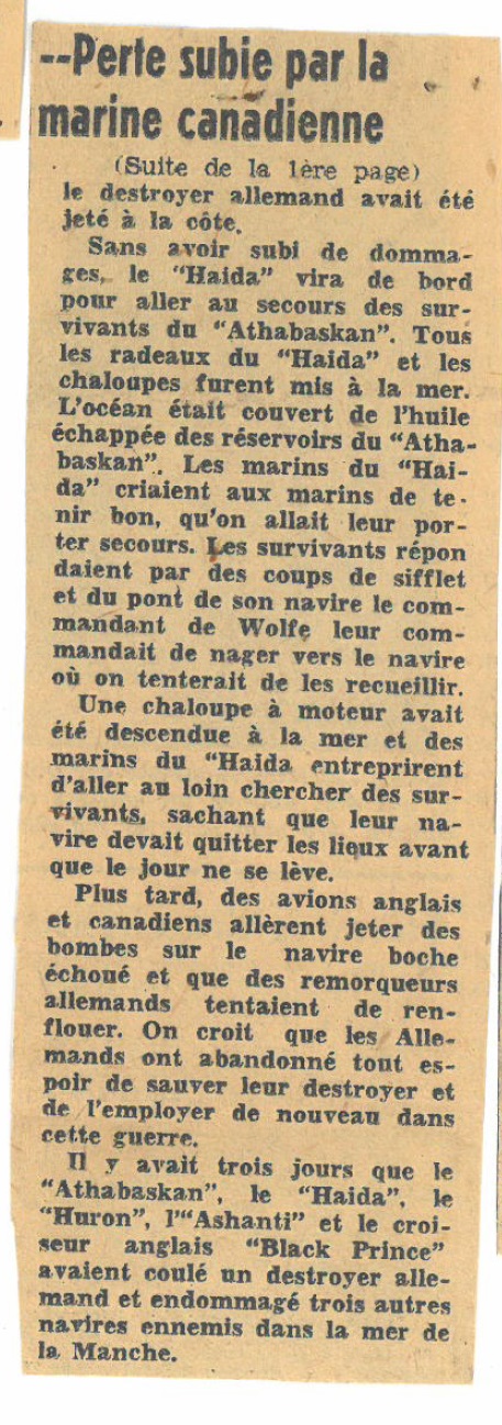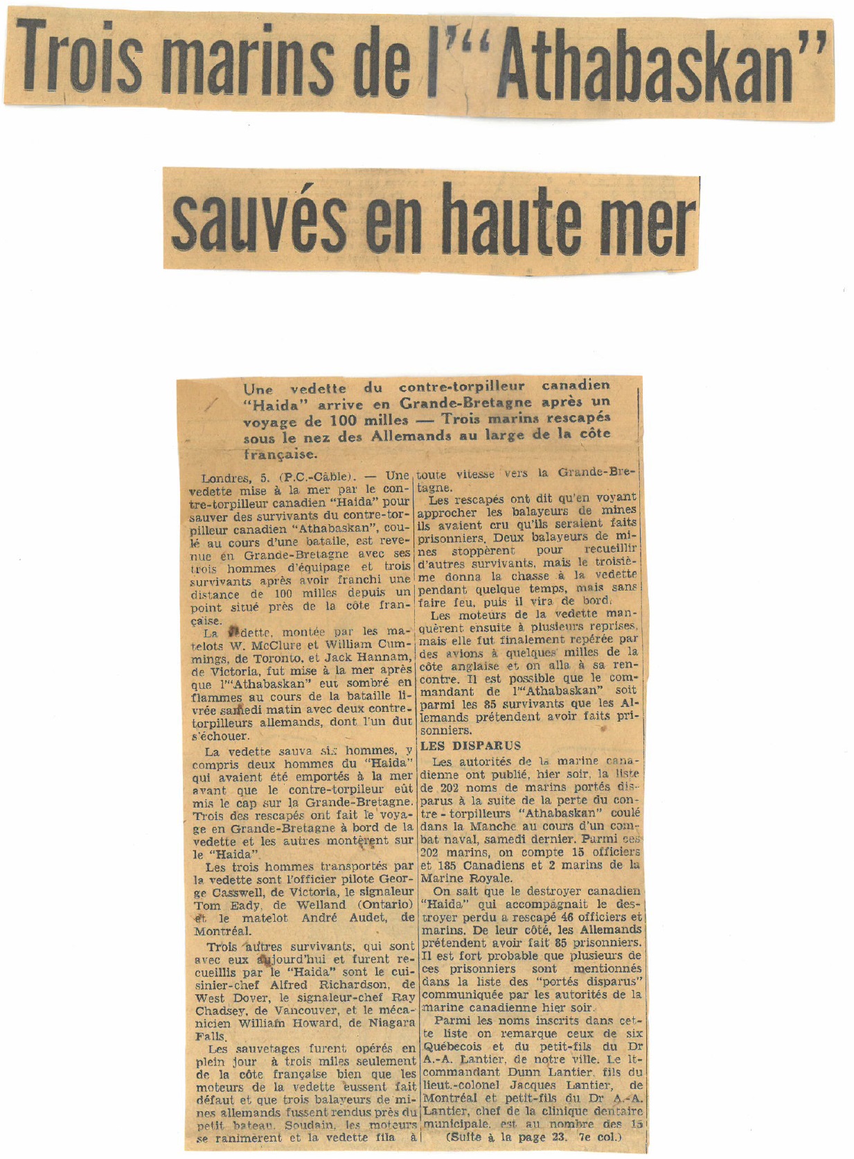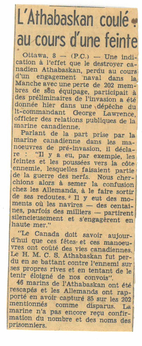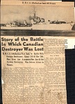 (JA12) Newspaper article of the battle in which HMCS ATHABASKAN G07 was lost // HMCS ATHABASKAN Was Sunk In Battle With German Destroyers. About 130 Of Her 200-Man Crew Are Accounted For. One Of the German Destroyers Was Driven Ashore in Flames (JA13-JA16) Newspaper articles on HMCS ATHABASKAN'S POWs
