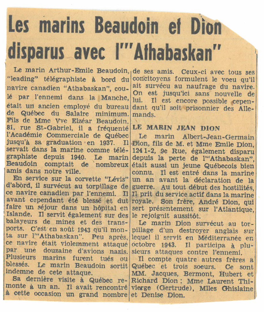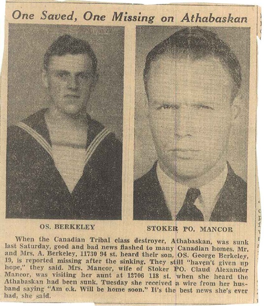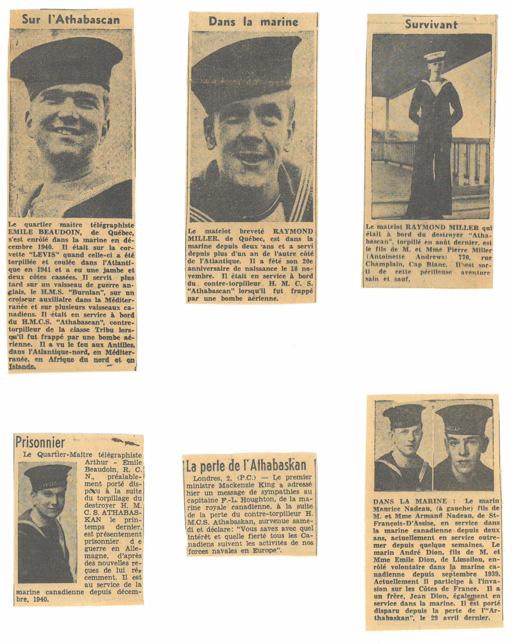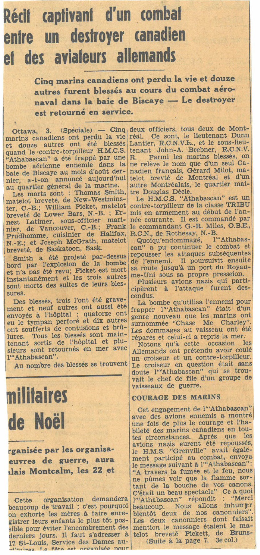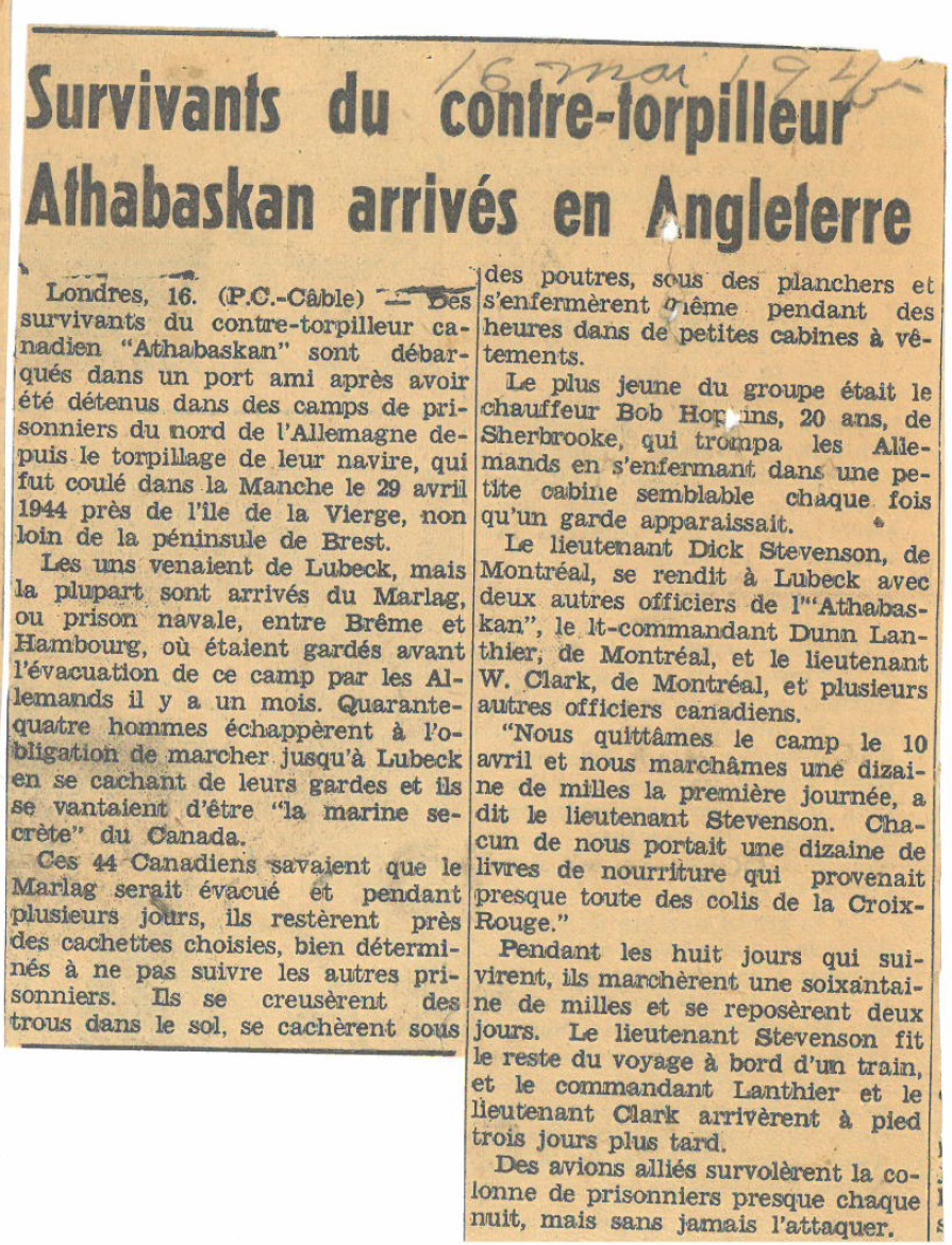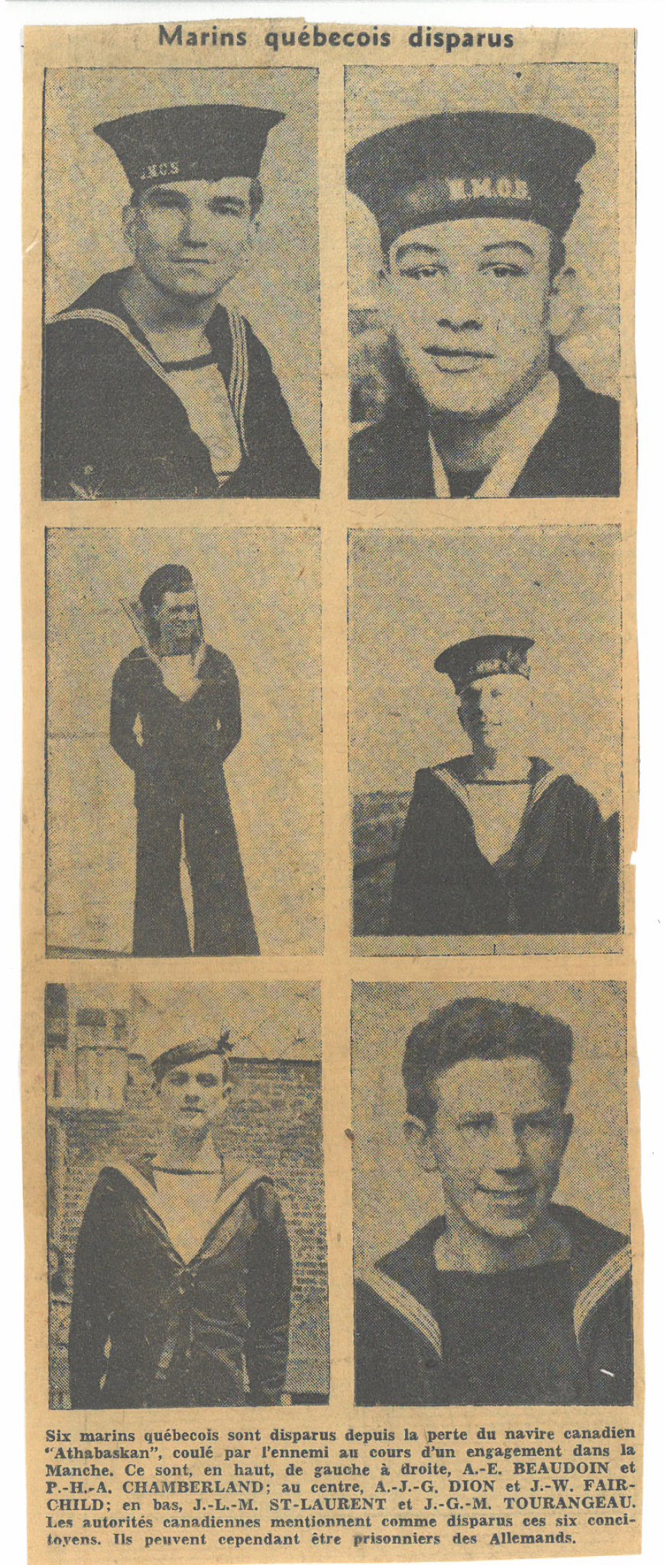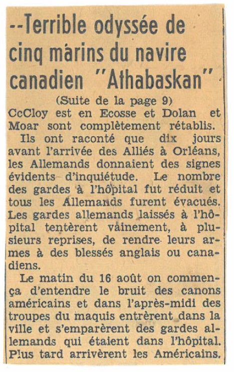 (JA12) Newspaper article of the battle in which HMCS ATHABASKAN G07 was lost // HMCS ATHABASKAN Was Sunk In Battle With German Destroyers. About 130 Of Her 200-Man Crew Are Accounted For. One Of the German Destroyers Was Driven Ashore in Flames (JA13-JA16) Newspaper articles on HMCS ATHABASKAN'S POWs