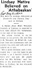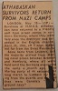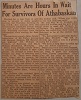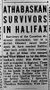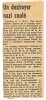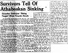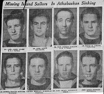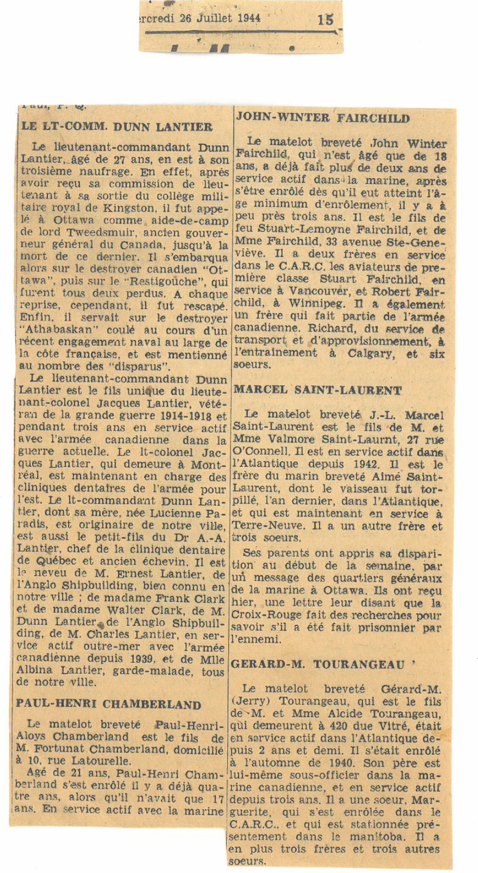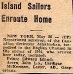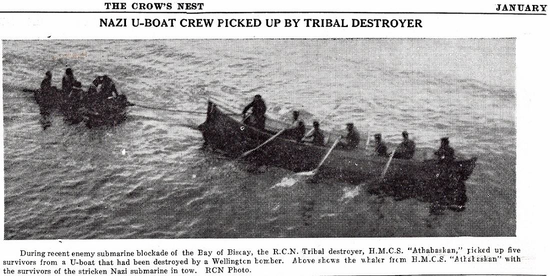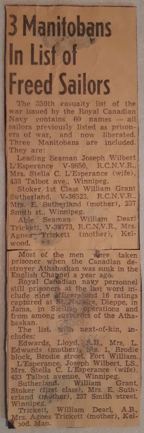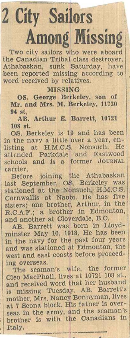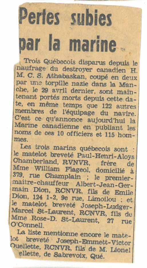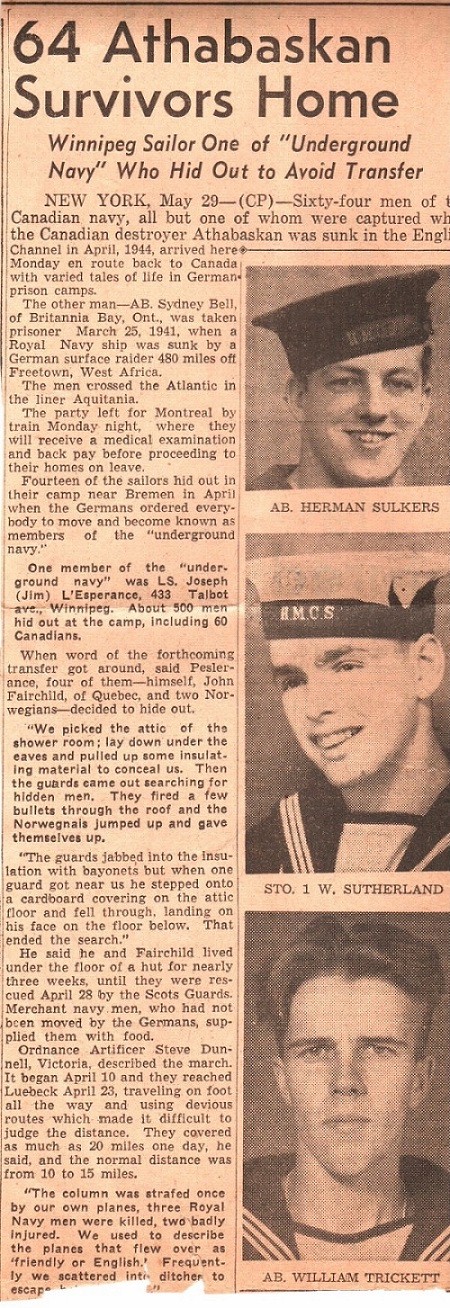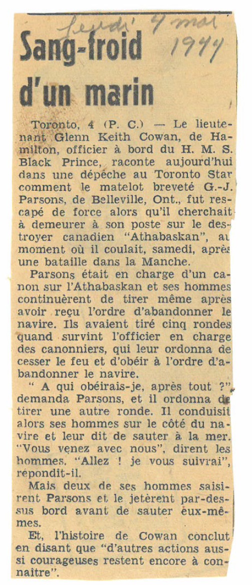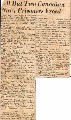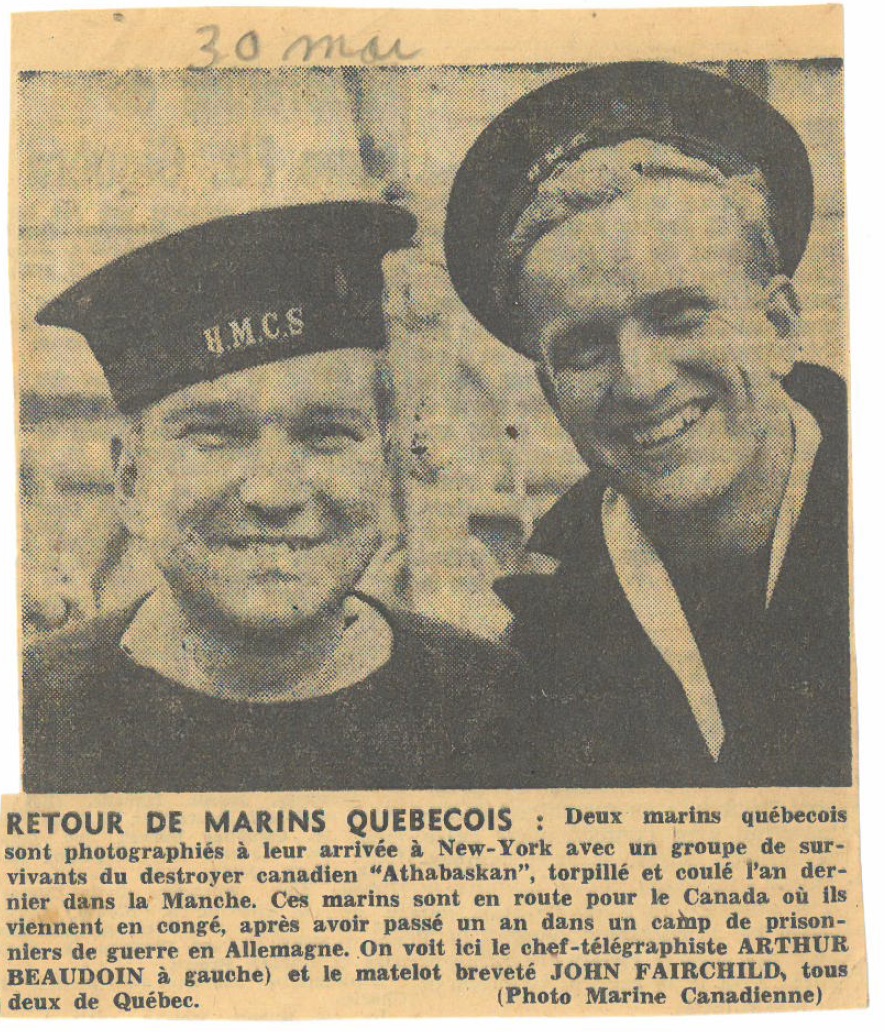 (JA12) Newspaper article of the battle in which HMCS ATHABASKAN G07 was lost // HMCS ATHABASKAN Was Sunk In Battle With German Destroyers. About 130 Of Her 200-Man Crew Are Accounted For. One Of the German Destroyers Was Driven Ashore in Flames (JA13-JA16) Newspaper articles on HMCS ATHABASKAN'S POWs