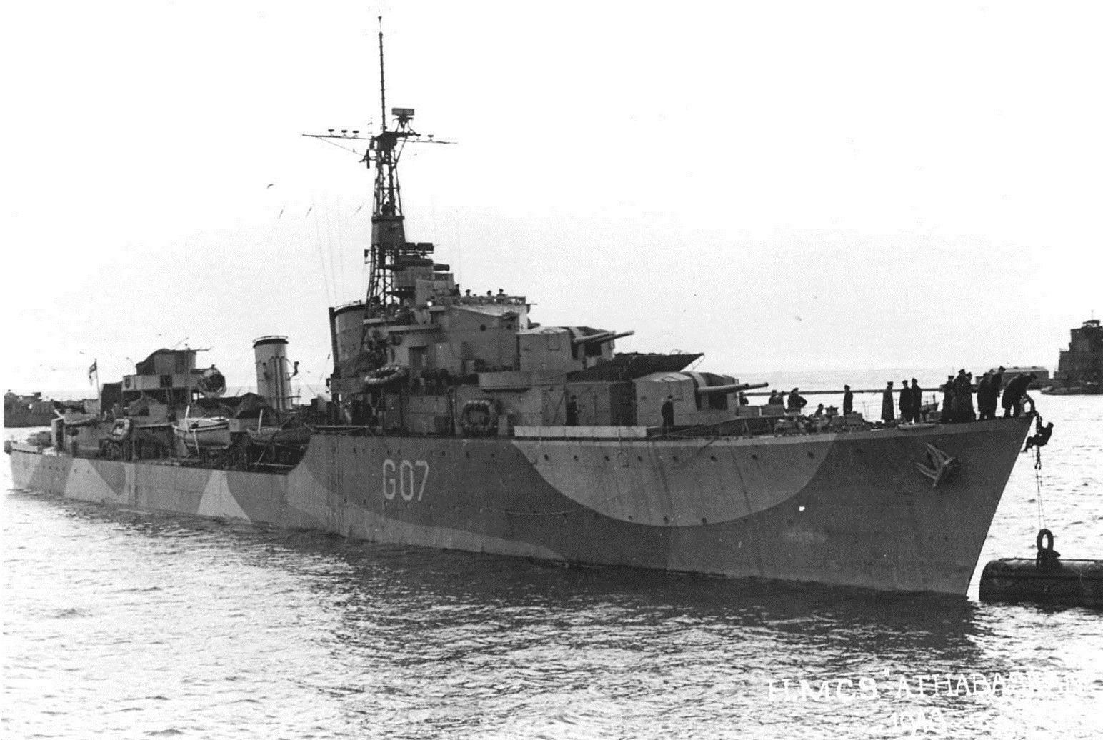 Commissioned on 03 Feb 1943 at Newcastle-on-Tyne and assigned to the British Home Fleet, ATHABASKAN left on 29 Mar 1943 to patrol the Iceland-Faeroes Passage for blockade runners. Stress of weather caused hull damage that required five weeks' repairs at South Shields, U.K., following which, in Jun 1943, she took part in Operation Gearbox III, the relief of the garrison at Spitsbergen. On 18 Jun 1943 she collided with the boom defence vessel Bargate at Scapa Flow, occasioning a month's repair at Devonport. In Jul and Aug 1943 she was based at Plymouth, carrying out A/S patrols in the Bay of Biscay, and on 27 Aug 1943 was hit by a glider bomb off the Spanish coast. She managed to reach Devonport, where she remained under repair until 10 Nov 1943; returning to Scapa Flow in Dec 1943.