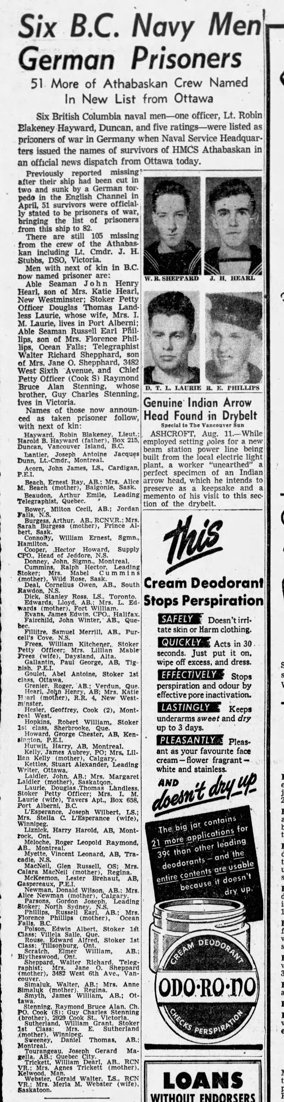 (SH) - Survived the sinking of HMCS ATHABASKAN G07. Rescued by HAIDA (SC) - Survived the sinking of HMCS ATHABASKAN G07. Rescued by HAIDA'S cutter (SP) - Survived the sinking of HMCS ATHABASKAN G07. Captured, became a POW A