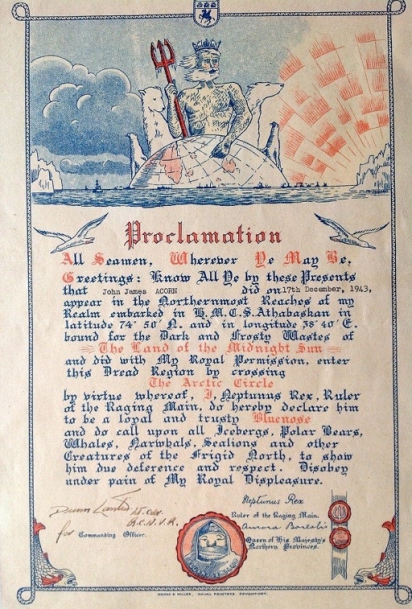 (JA11) Crossing the Line certificate (Arctic Circle) for John James Acorn while onboard HMCS ATHABASKAN G07, 17 December 1943