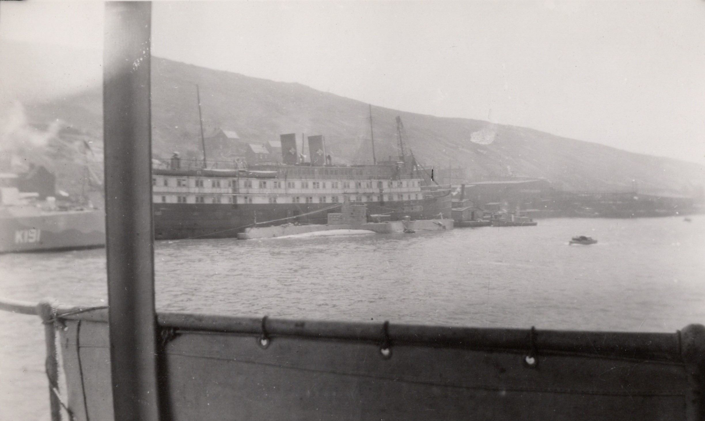 HMCS AVALON II with Royal Navy sub P554 alongside and the corvette HMCS MAYFLOWER K191 astern at St. John's, Newfoundland