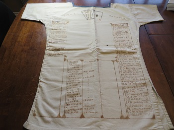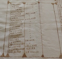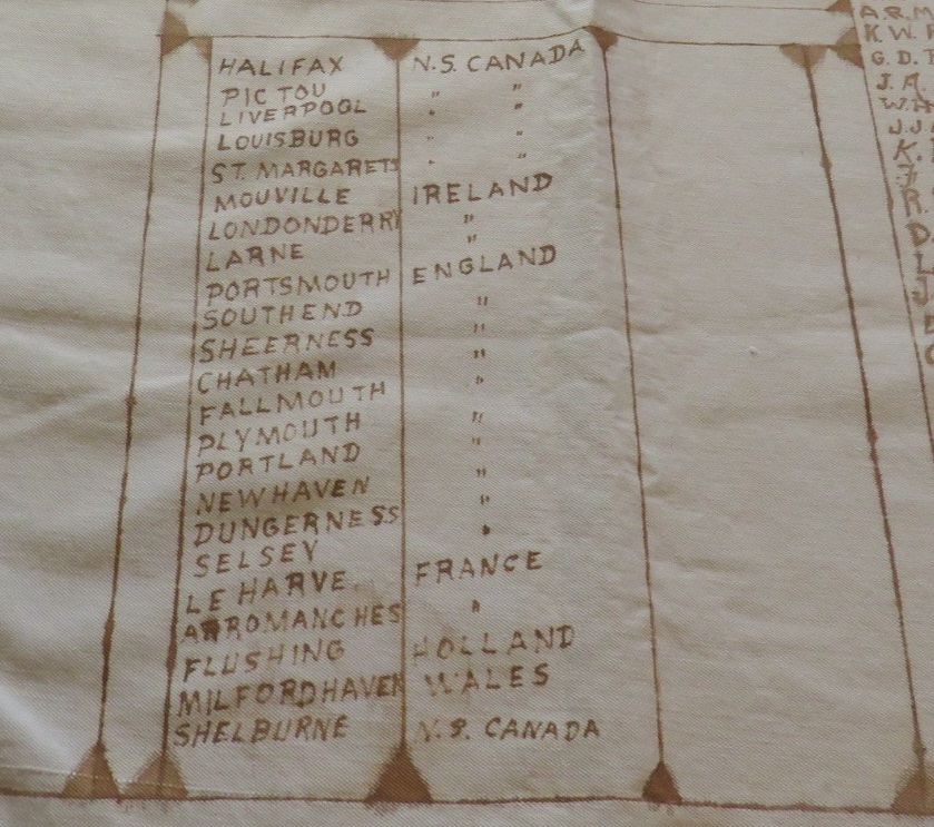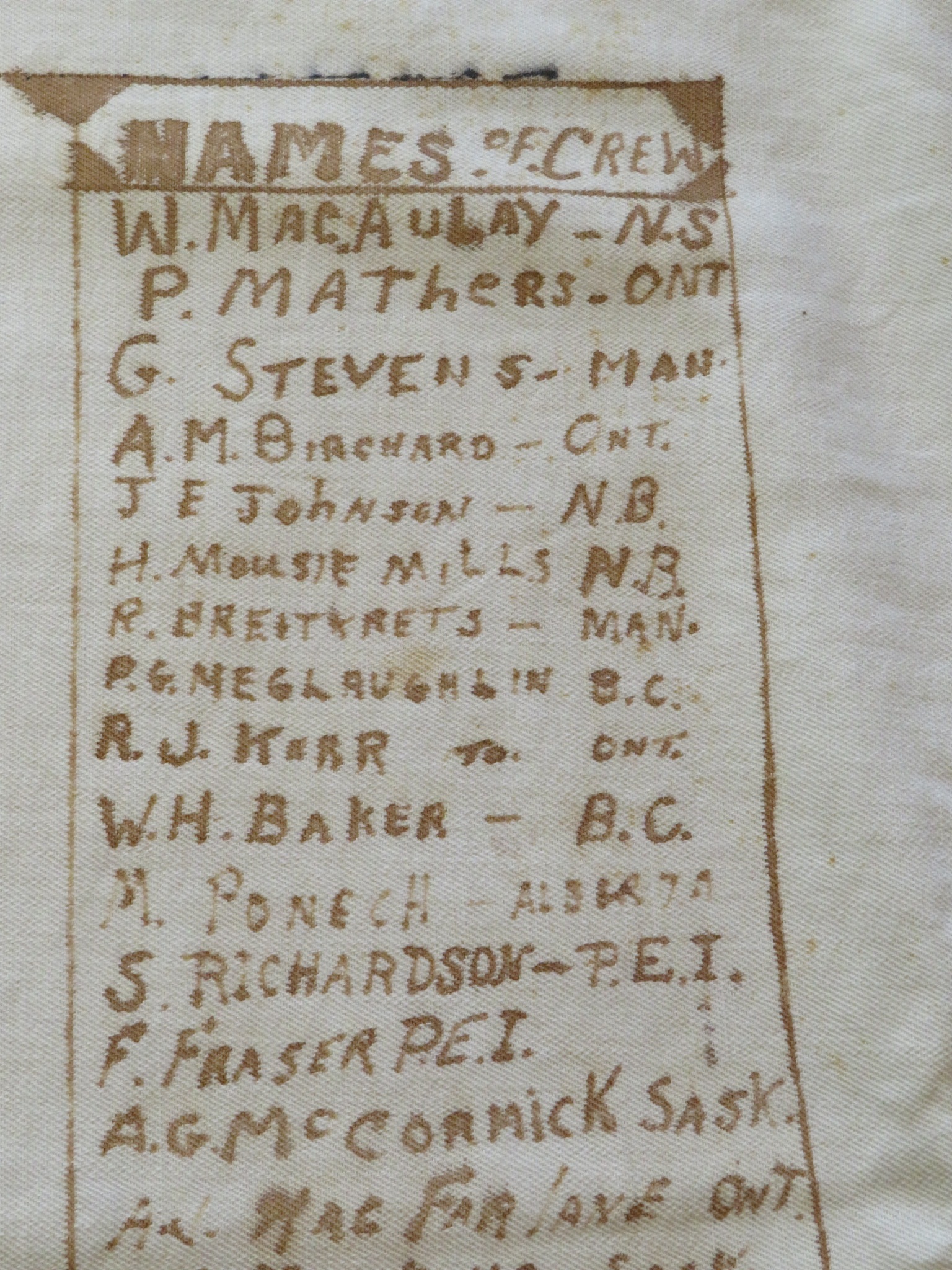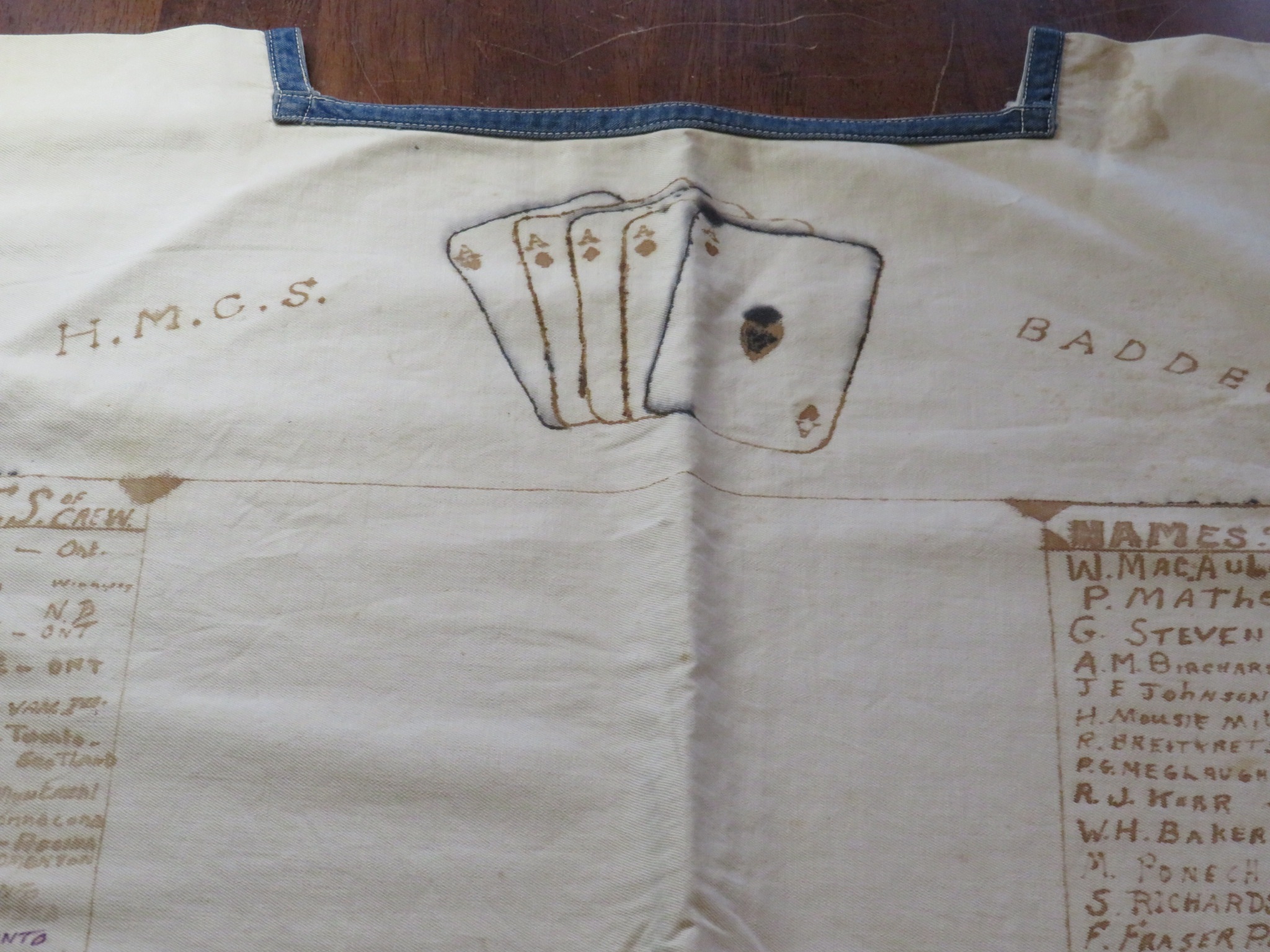 (FF01) HMCS BADDECK crew list written on a gunshirt. Close-ups of each section below