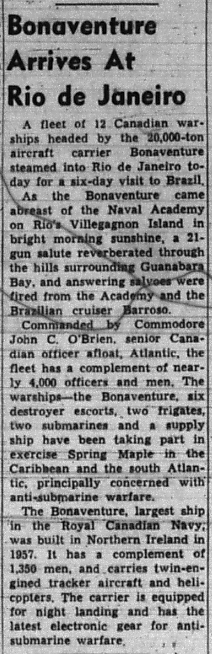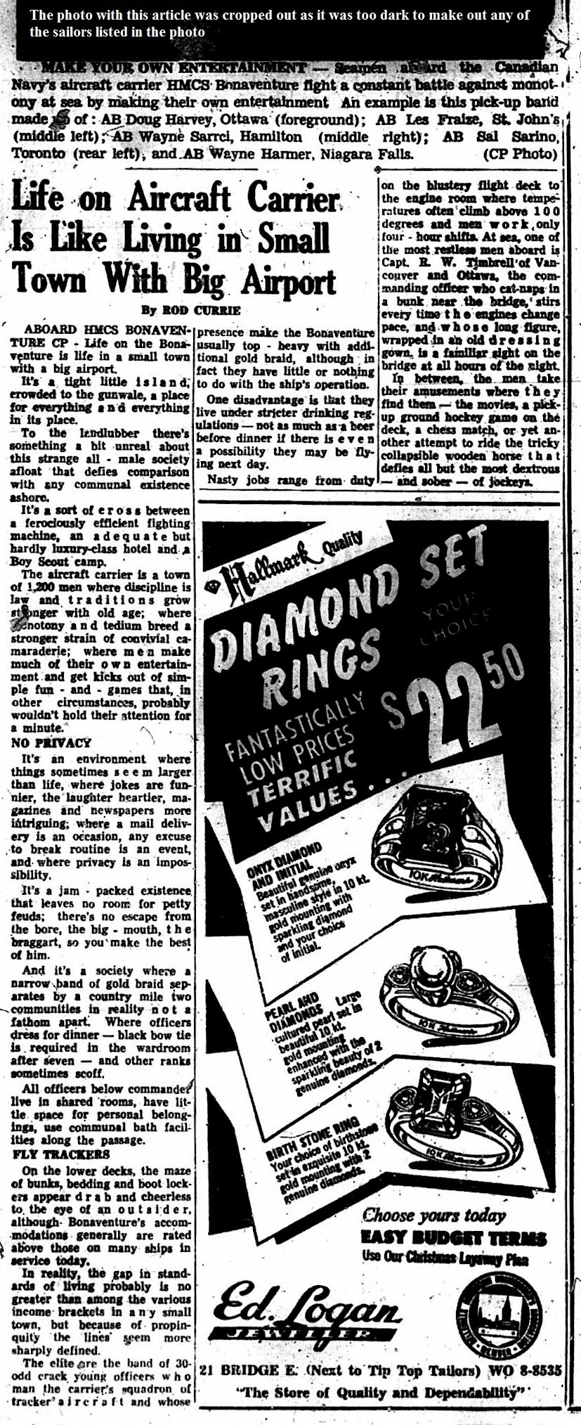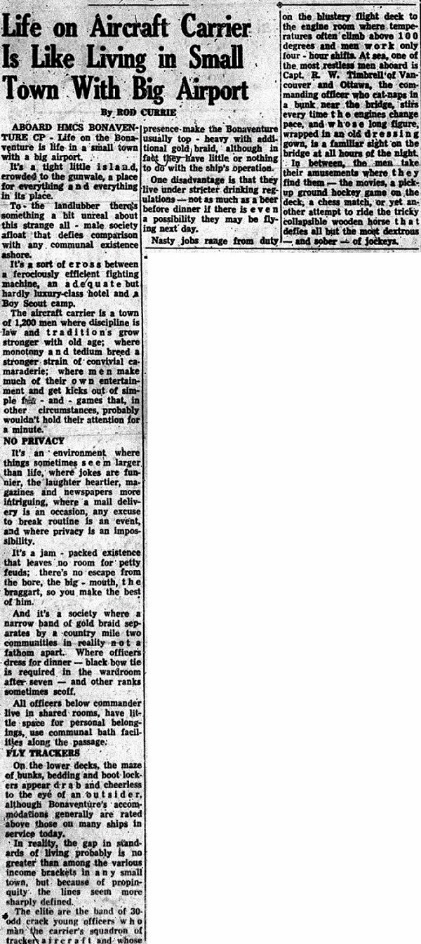 (BVN025) Article on the Tracker that crashed on 11 Jun 1963 // The Halifax Chronicle Herald - 12 Jun 1963 (BVN026) Life on Aircraft Carrier Is Like Living in Small Town With Big Airport // From the Belleville Intelligencer, 27 Nov 1963 // Sailors listed in the photo: AB Doug Harvey of Ottawa; AB Les Fraize of St. John's; AB Wayne Sarrel of Hamilton; AB Sal Sarino of Toronto; and AB Wayne Harmer of Niagara Falls // Source: Belleville Public Library microfilm collection // Researched by / © 2019 John Lyons (BVN027) BONAVENTURE Adventure // From the Belleville Intelligencer, 28 Nov 1963 // Source: Belleville Public Library microfilm collection // Researched by / © 2015 John Lyons (BVN028) Life on the BONAVENTURE // From the Belleville Intelligencer, 29 Nov 1963 // Source: Belleville Public Library microfilm collection // Researched by / © 2019 John Lyons (BVN029) BONAVENTURE Adventure // NATO's War Languages Are English and French // From the Belleville Intelligencer, 29 Nov 1963 // Source: Belleville Public Library microfilm collection // Researched by / © 2015 John Lyons