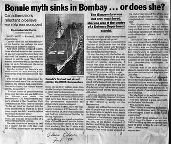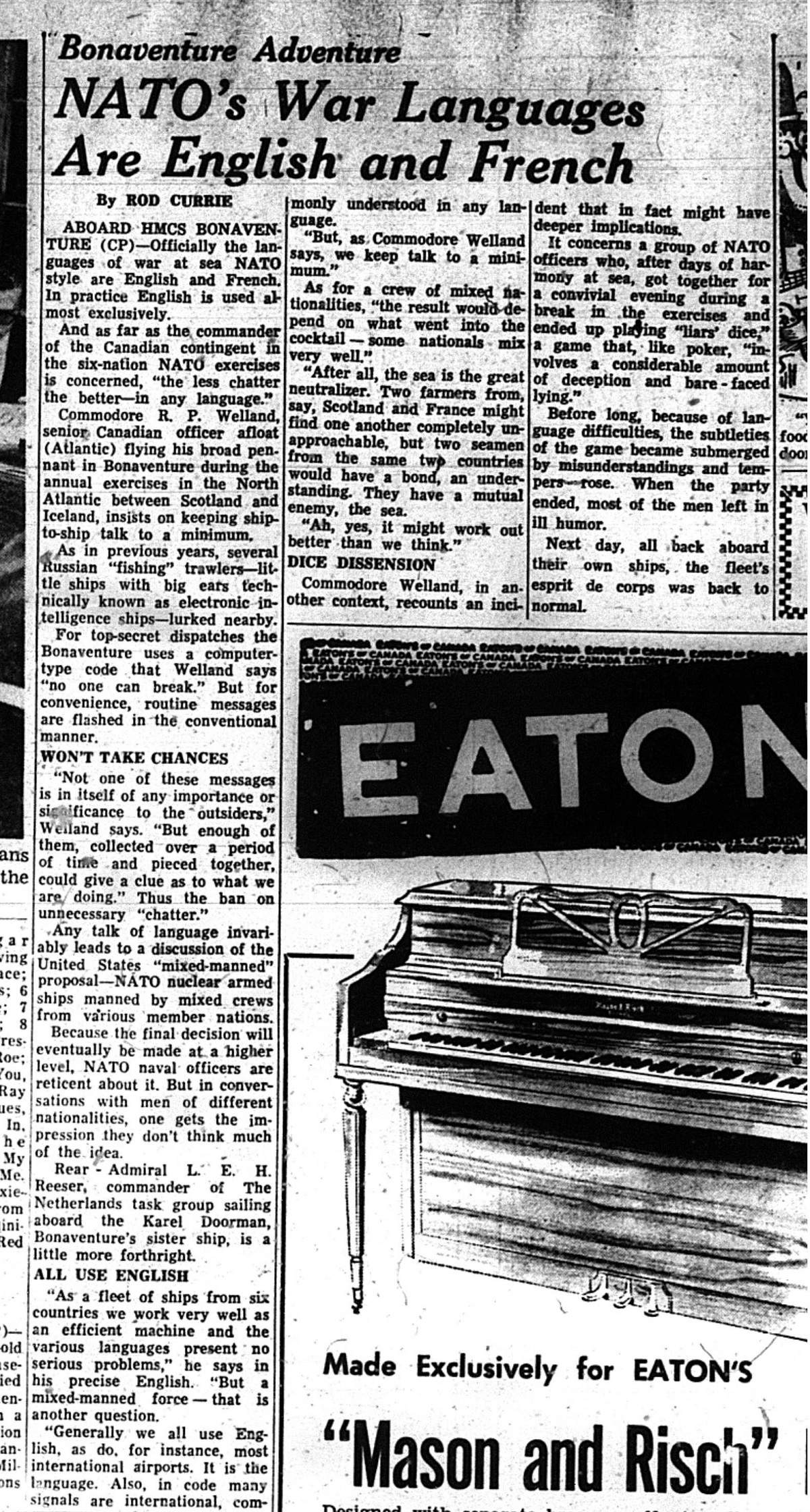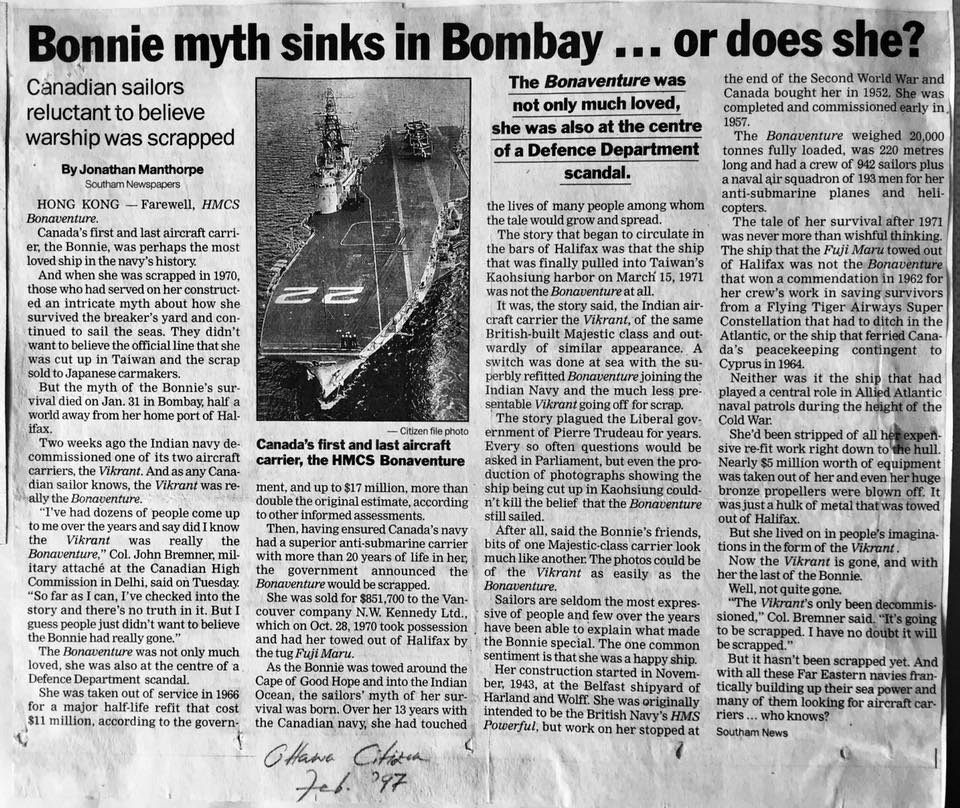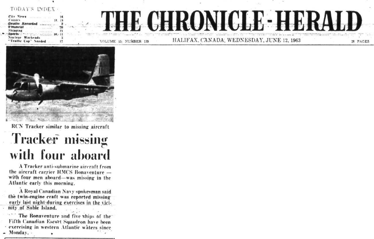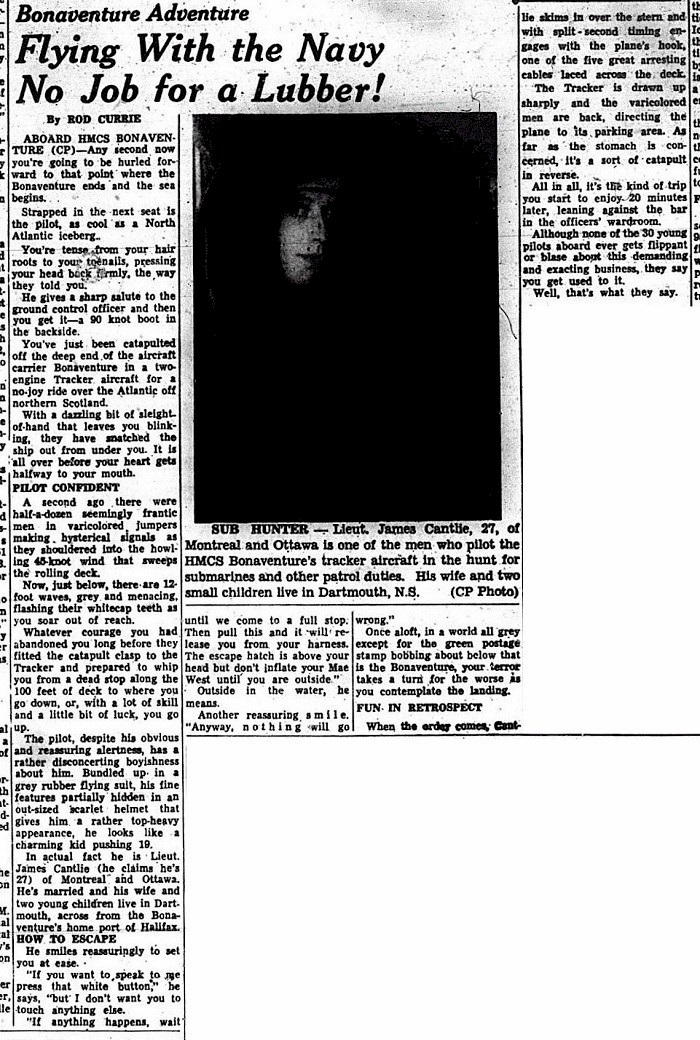 (BVN025) Article on the Tracker that crashed on 11 Jun 1963 // The Halifax Chronicle Herald - 12 Jun 1963 (BVN026) Life on Aircraft Carrier Is Like Living in Small Town With Big Airport // From the Belleville Intelligencer, 27 Nov 1963 // Sailors listed in the photo: AB Doug Harvey of Ottawa; AB Les Fraize of St. John's; AB Wayne Sarrel of Hamilton; AB Sal Sarino of Toronto; and AB Wayne Harmer of Niagara Falls // Source: Belleville Public Library microfilm collection // Researched by / © 2019 John Lyons (BVN027) BONAVENTURE Adventure // From the Belleville Intelligencer, 28 Nov 1963 // Source: Belleville Public Library microfilm collection // Researched by / © 2015 John Lyons (BVN028) Life on the BONAVENTURE // From the Belleville Intelligencer, 29 Nov 1963 // Source: Belleville Public Library microfilm collection // Researched by / © 2019 John Lyons (BVN029) BONAVENTURE Adventure // NATO's War Languages Are English and French // From the Belleville Intelligencer, 29 Nov 1963 // Source: Belleville Public Library microfilm collection // Researched by / © 2015 John Lyons