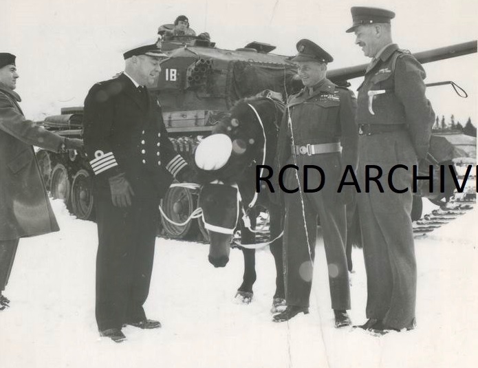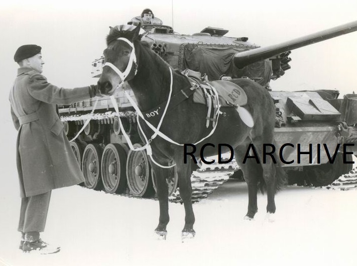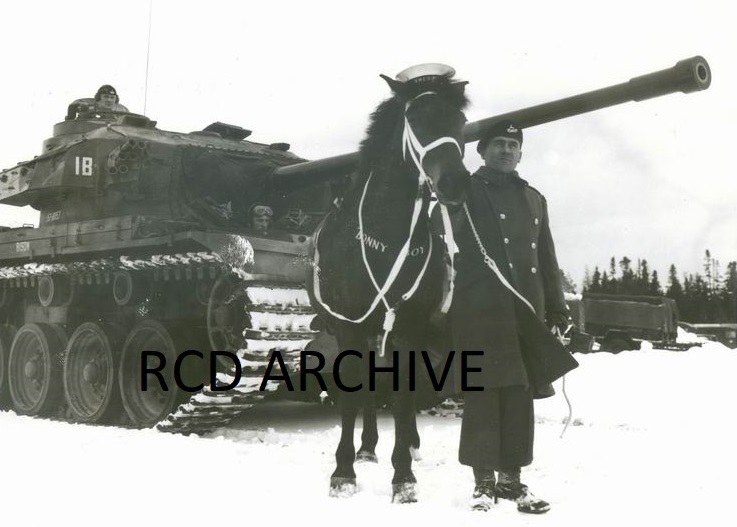 (BVN014-BVN016) Trooper Bonnie - "In the late 1950's, early 1960's, a friendship had developed between the members of The Royal Canadian Dragoons in CFB Gagetown and the crew of the HMCS BONAVENTURE. On a visit to the Regiment in Gagetown, the crew of the BONAVENTURE transferred to the Regiment a member of their crew. Documents detailing the transfer are in the Regimental Archives, along with photos, of one of the first inter-service Occupational Transfers to take place, prior to Unification. The gaining unit, The Royal Canadian Dragoons now had a new member, 'Tpr Bonnie'; a horse, complete with Dog Tags, Attestation Papers, and Qualifications." // Photo Credit: Royal Canadian Dragoon's Archives // Webmaster's note: This apparently took place in the Jan-Mar 1960 time frame