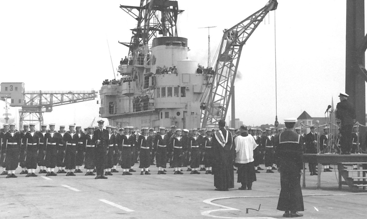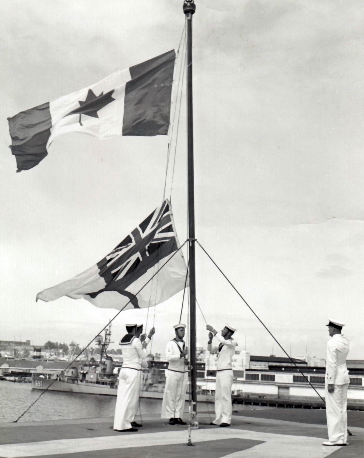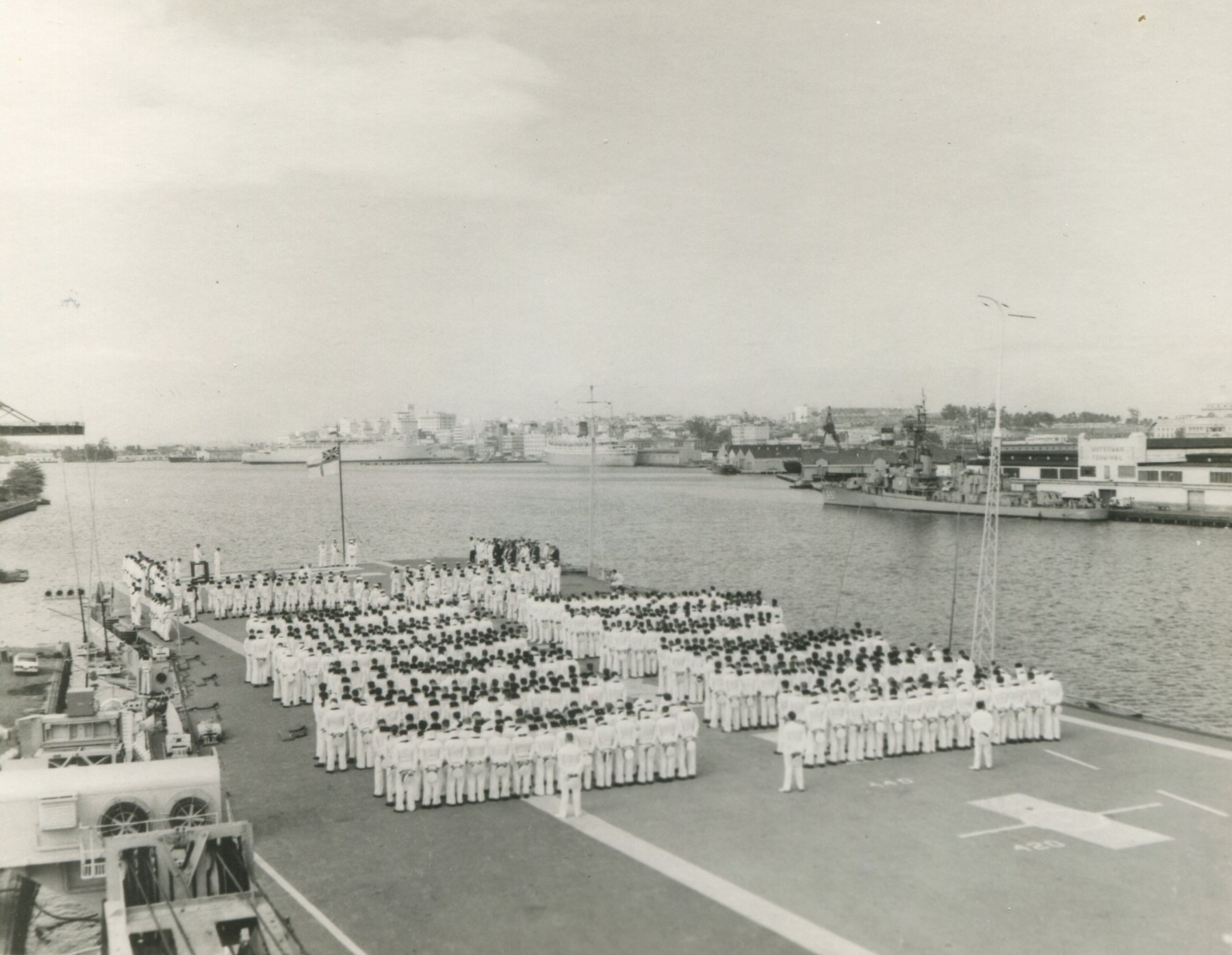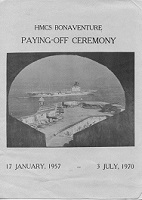 BONAVENTURE was officially decommissioned on 3rd July 1970 with VAdm J.C. O'Brien presiding. For the final three months, BONAVENTURE was banished from Jetty 4 to Pier 8 and only the Deck Dept remained to prepare the ship for final disposal. This was actually hard work with much equipment being shifted, immobilized or made safe. It fell to Slt Richard Neveu to turn off the last light.