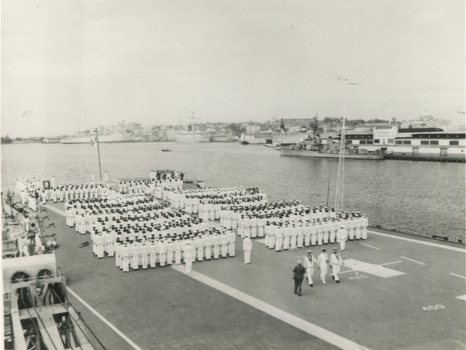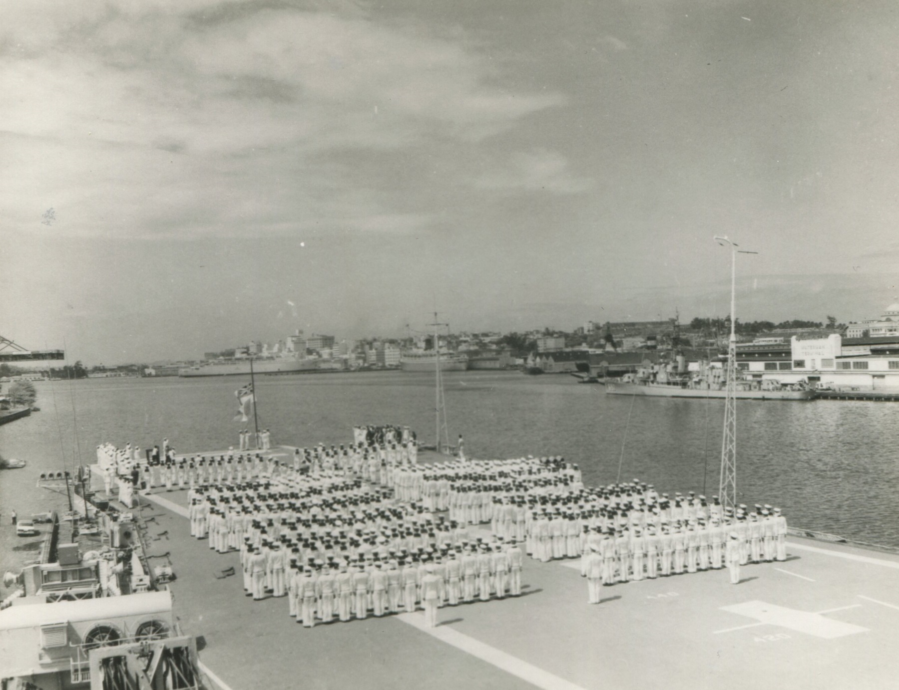 (EM22) HMCS BONAVENTURE post 1966-67 refit (EM23) Divisions on the flight deck of HMCS BONAVENTURE - circa 1966