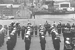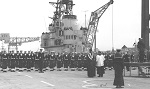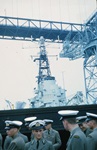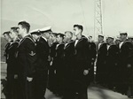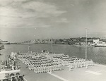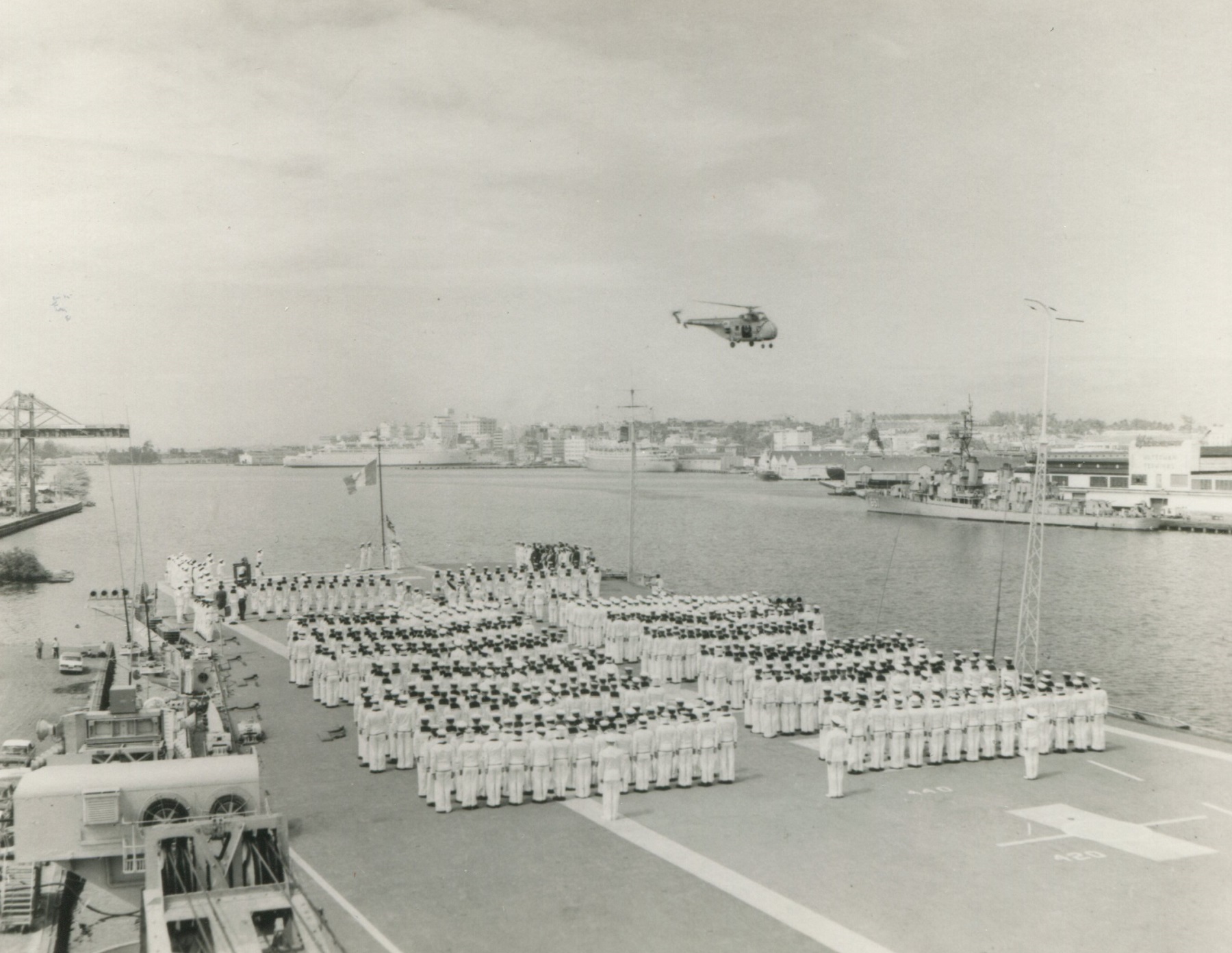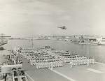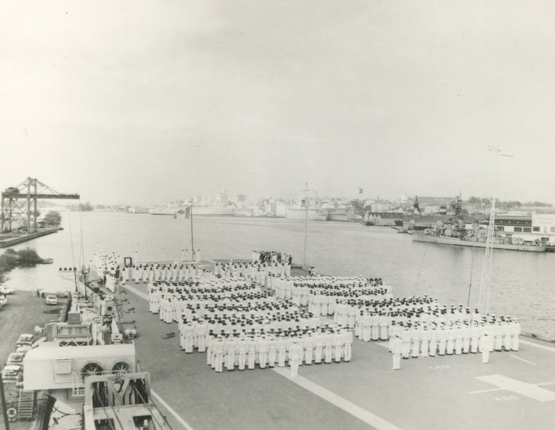 Ship's company of HMCS BONAVENTURE fallen in for the ceremony changing the ship's ensign from the White Ensign to the Canadian flag on 15 Feb 1965 in San Juan harbor.