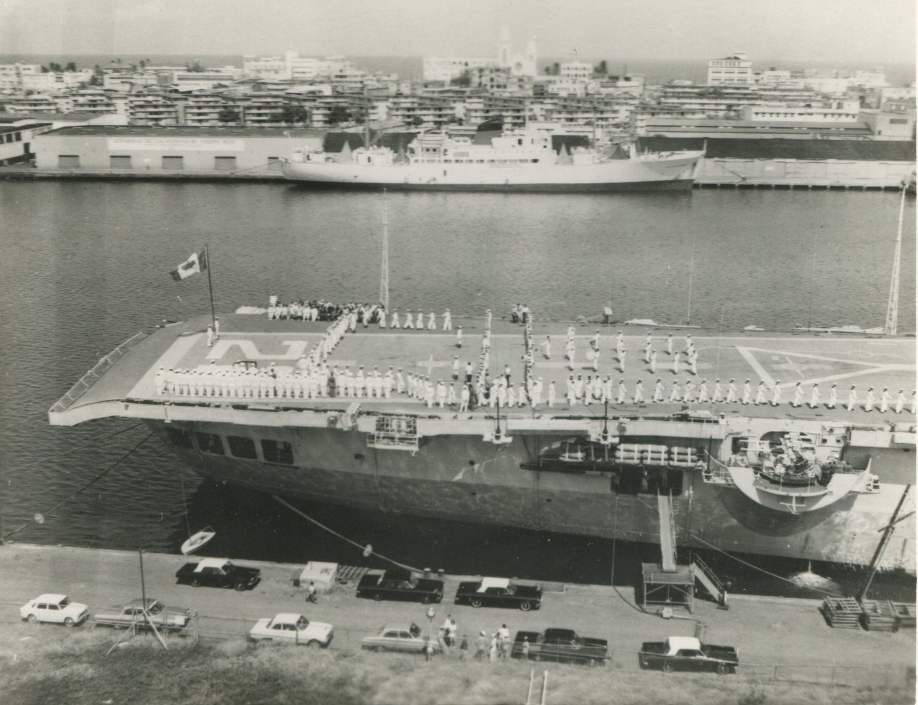On January 12th, Bonaventure departed Halifax as the flagship of the largest Canadian task group ever to sail for South America. Under the Command of Commodore J.C. O’Brien was the fleet replenishment ship Provider; the mobile repair ship Cape Scott; destroyers Nipigon, Saguenay, Kootenay, Skeena, Annapolis and Restigouche and the RN submarine Acheron. On the 21st they were joined by four West Coasters, the destroyer escort St. Croix; frigates Antigonish and Stettler; and submarine Grilse.