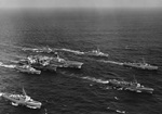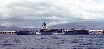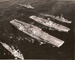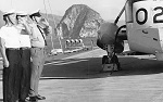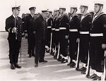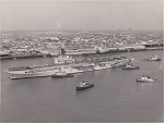 (BVN017) HMCS BONAVENTURE 1961 // USN photo - public domain (BVN018) Banshees flying past HMCS BONAVENTURE (BVN019) Sunday Divisions on HMCS BONAVENTURE circa 1961 // "Capt. Fred Frewer inspecting Engineering Division I was an OSEM at time. LSER Danny MacDonld is the sailor that Capt. Frewer is speaking with." // Courtesy of David Bakody (BVN020) Carrier Group - Jun 1961 // Top to bottom - USS THE SULLIVANS 537, USS JONAS INGRAM 938, HMCS BONAVENTURE, USS ESSEX and HMCS ATHABASKAN 219 // Courtesy of Eric Ruff // From Al Snowie's "The Bonnie" page 138 - Bonnie, Sioux and AthaB (Plane guard) joined Essex and 5 USN destroyers in June 1961 for an ASWEX against 2 USN submarines. Bonnie's 12 Trackers flew as many hours as Essex's 36 Trackers! ( BVN021) LS Charles Wilkins is greeted by his family in Halifax after being rescued after a Tracker crash