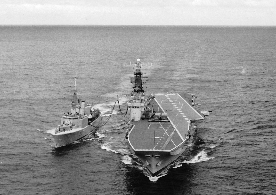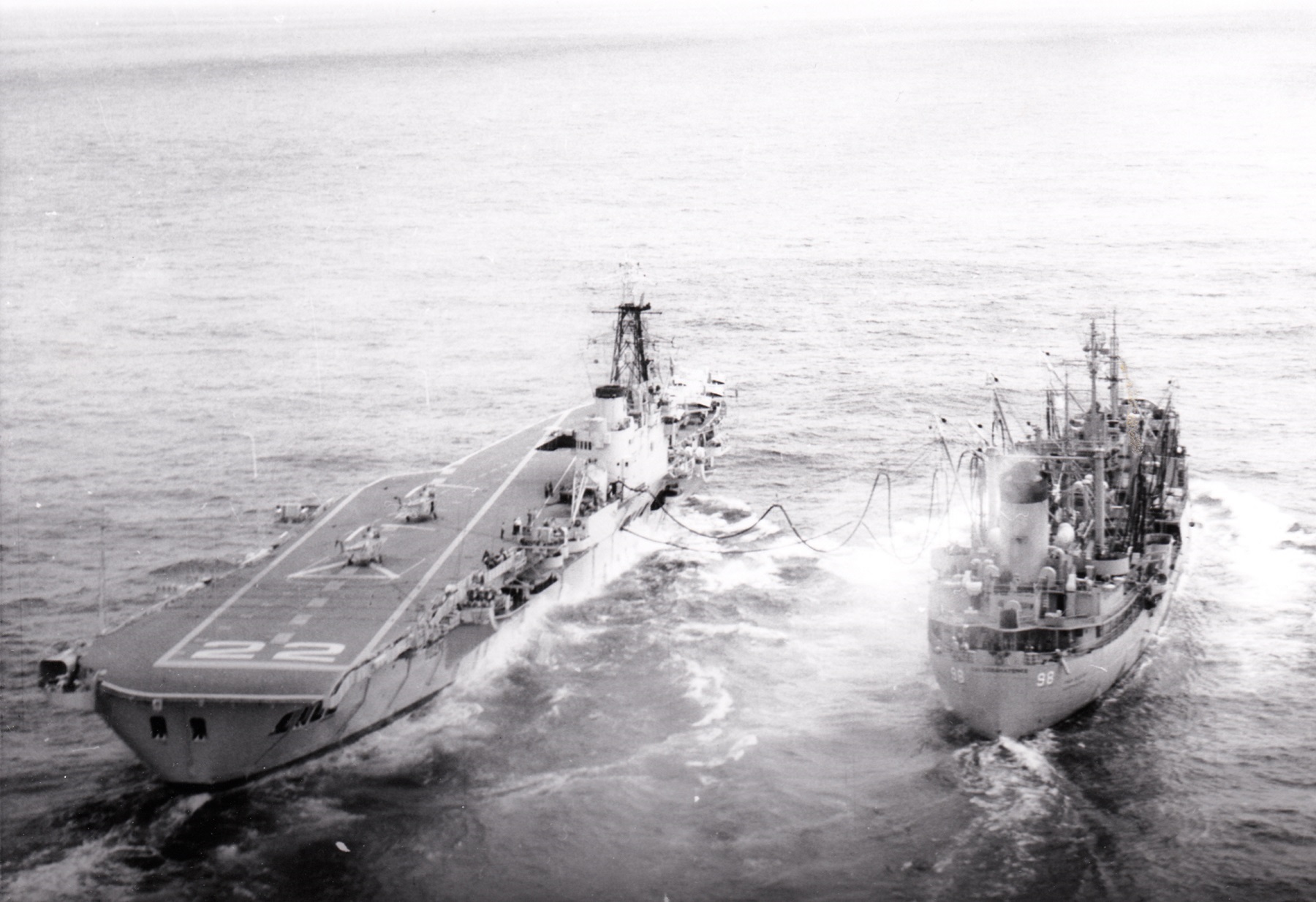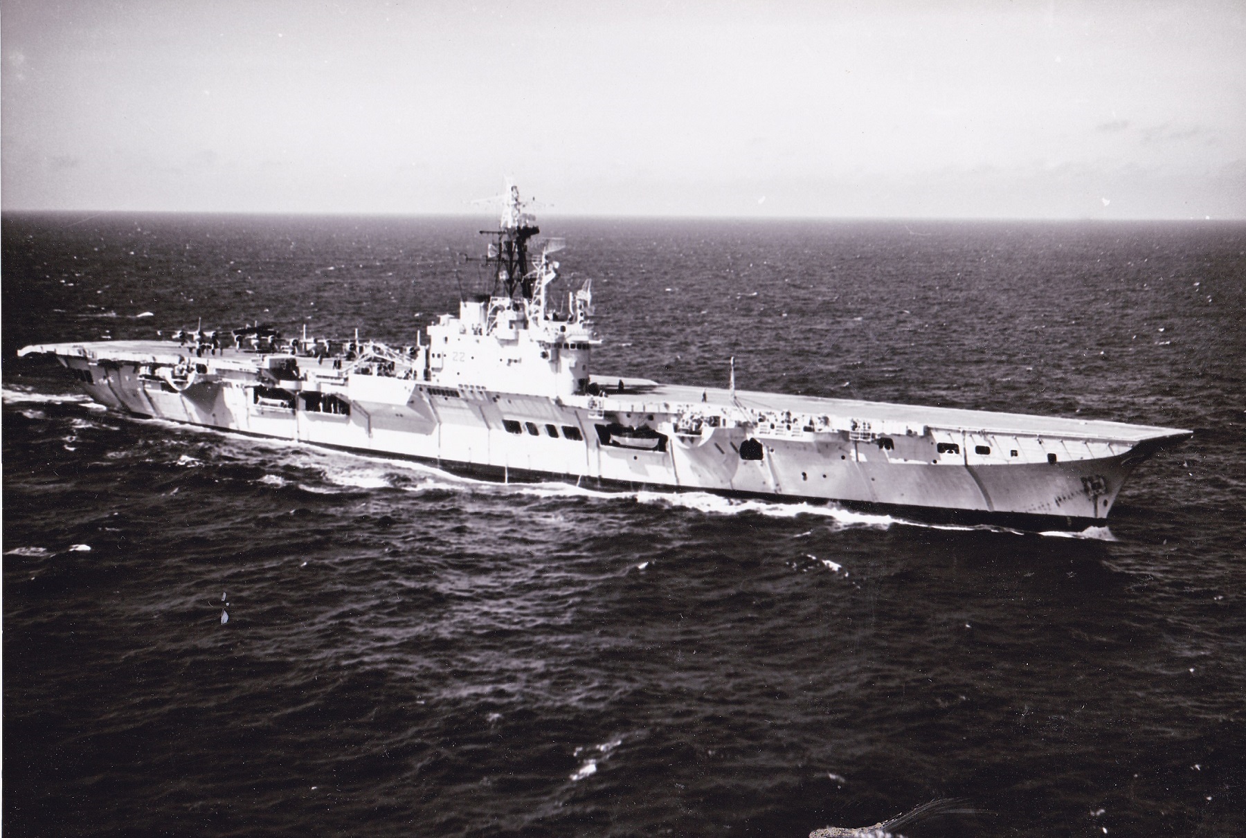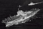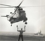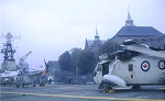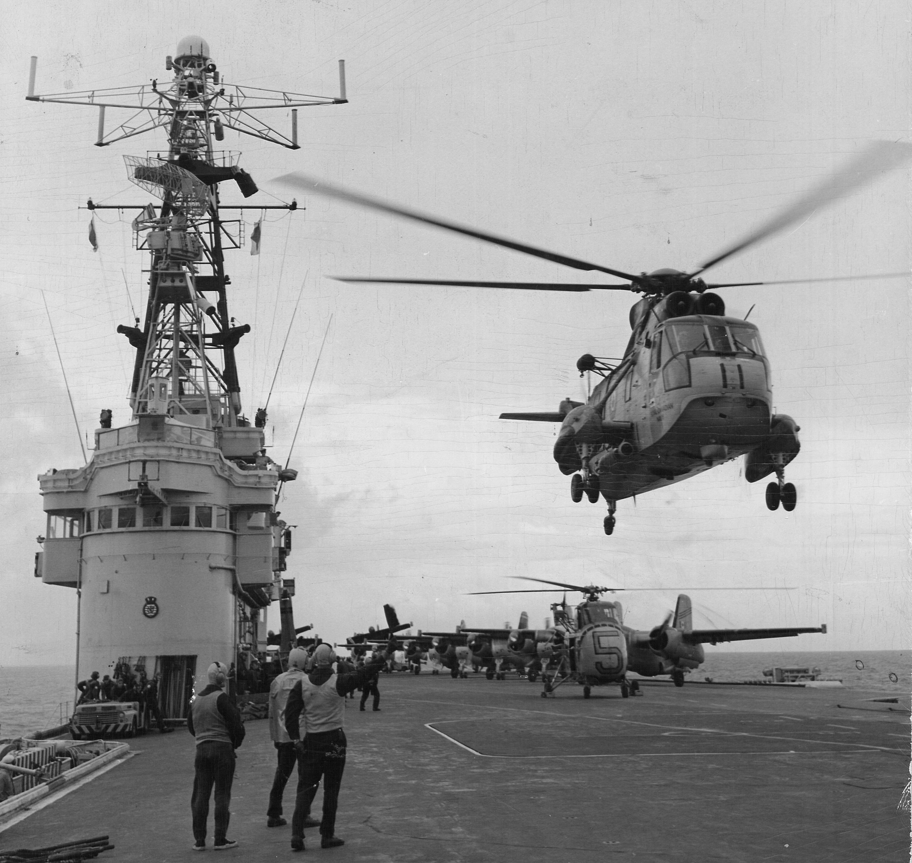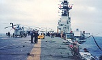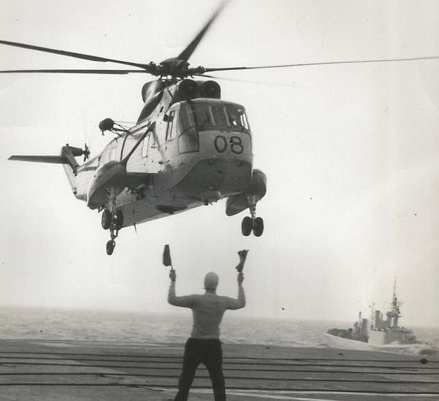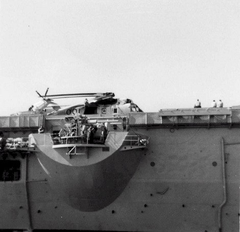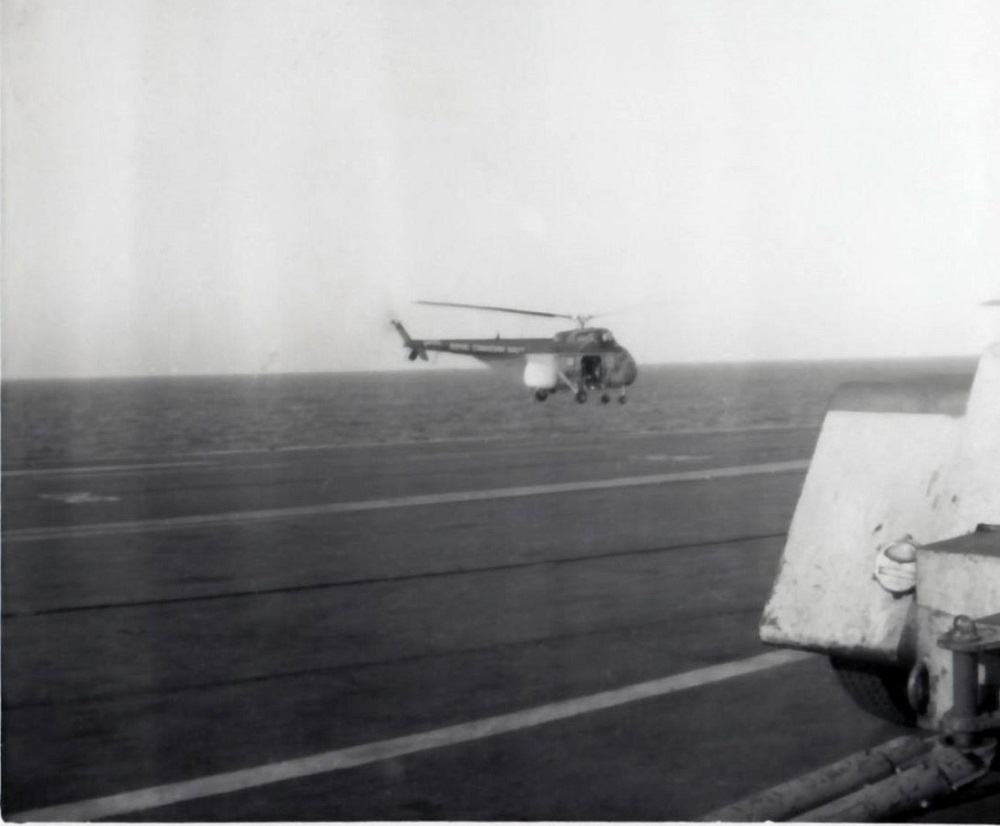 On 23 Oct 1969, while operating in European waters off England, HMCS BONAVENTURE'S crew came to the aid of HMCS KOOTENAY which has suffered a catastrophic gear box failure and explosion - flying over fire fighters, medical staff, equipment and evacuating casualties.