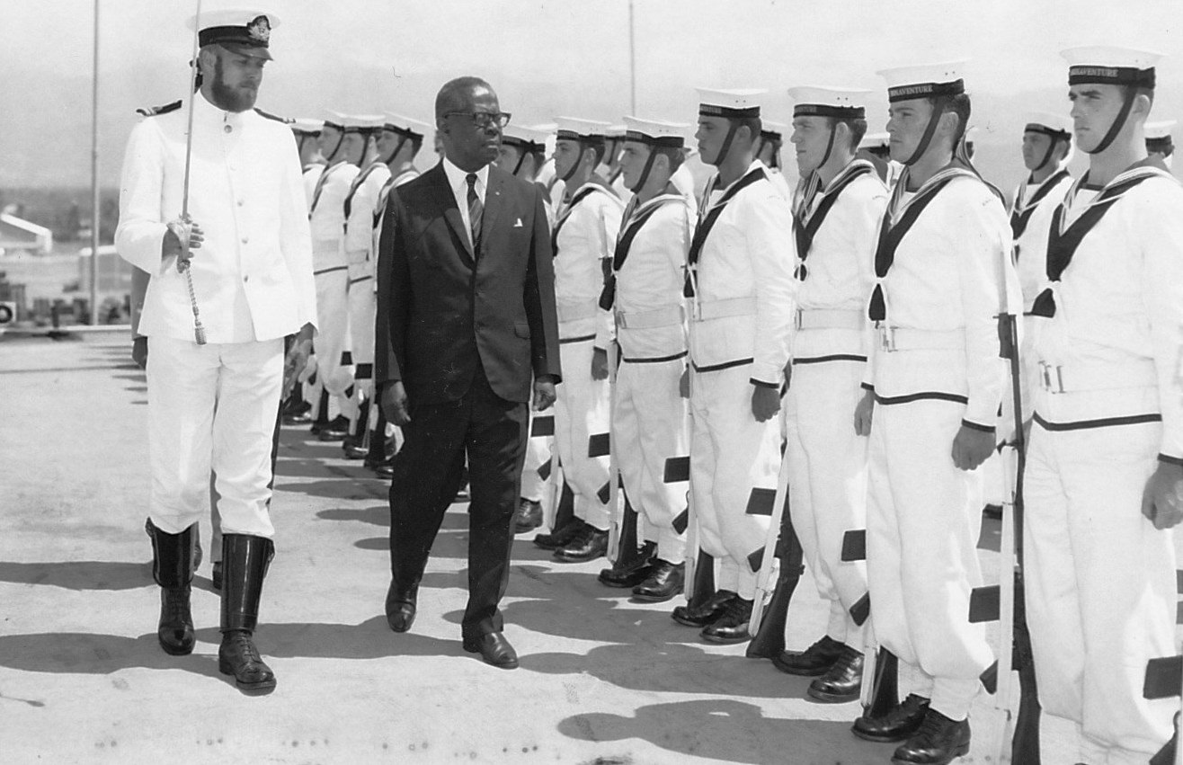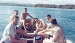 (HG51) Day off in Roosevelt Road, Puerto Rico. Clockwise from left: Phil Kenny, Jerry Tannous, Rich Neveu, Dennis Jackson, John Anderson, Bill Colls (HG52) HMCS BONAVENTURE"S final departure San Juan. Taken from El Morro Castle by the ship's photographer (who rejoined by helo) - 27 Feb 1970 (HG53) HMCS BONAVENTURE alongside in Kingston, Jamaica - 06-08 Mar 1970 (HG54) Governor General of Jamaica, Sir Hugh Campbell, inspects the crew of HMCS BONAVENTURE - 06 Mar 1970 (HG55) HMCS SKEENA 207 fueling from HMCS BONAVENTURE during Exercise Maple Spring 1970