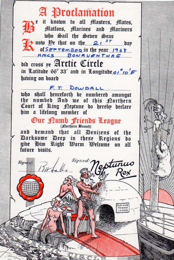 (RB01-RB02) Article on Bonnie Crossing the Arctic Circle. Pers in both articles: Lt Bingham, 1st Queen's Own Rifles of Canada (being initiated); Trusty Seals: AB R. Bramwell, AB Ouelette, and LS S. Wiscombe (RB03) Original photo used in the articles (RB04) Another initiate from the Queen's Own (name unknown) (RB05) Vice Admiral J.C. O’Brien inspecting Guard on HMCS BONAVENTURE // DND / RCN photo - Negative # BV-69-405 From the collection of Robert Bramwell Courtesy of Brian Lapierre
