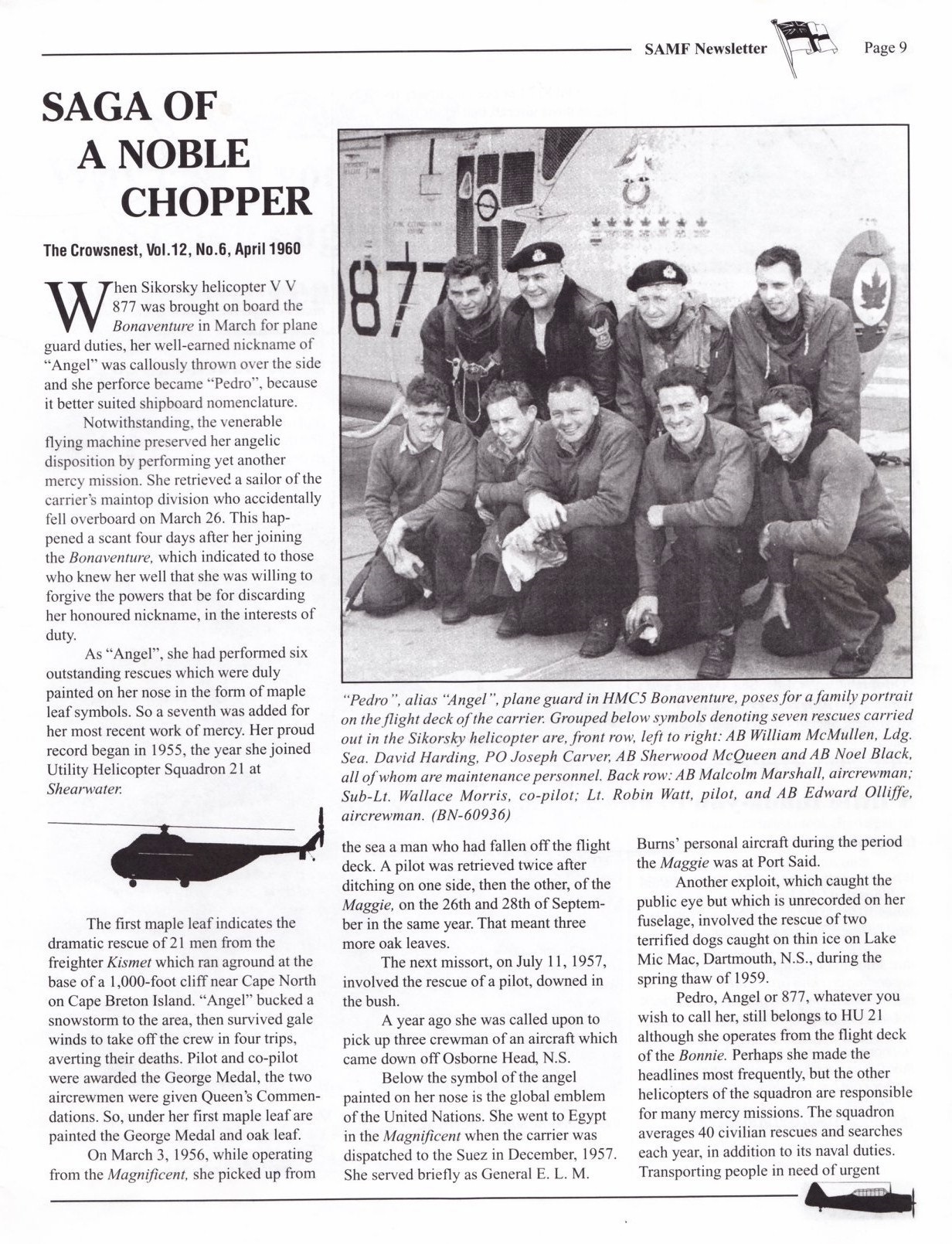 (SM06) Unknown sailor by a helo on HMCS BONAVENTURE - 1963 (SM07 Hangar deck HMCS BONAVENTURE ?? // SHEARWATER ?? (SM08-SM09) Article from the Trident magazine on "Angel" also known as "Pedro" // photo from the article - Front (L-R) AB William McMullen, LS David Harding, PO Joseph Carver, AB Sherwood McQueen, AB Noel Black // Back (L-R) AB Malcolm Marshall, Slt Wallace Morris, Lt Robin Watt, AB Edward Olliffe From the collection of Sherwood McQueen, PO2, Naval Air Courtesy of Robin McQueen