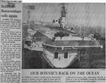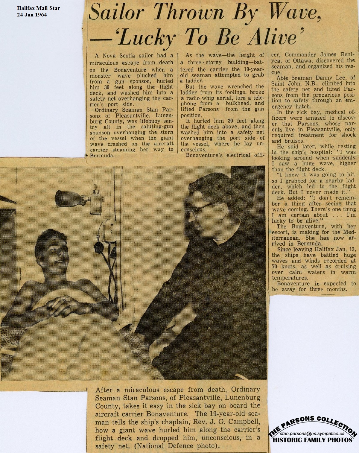 (BVN030) Article on Seaman Stan Parsons who survived being thrown by a wave on HMCS BONAVENTURE // Halifax Mail-Star 24 Jan 1964 // Source: Facebook page - Friends of BONAVENTURE (BVN031) HMCS Provider conducting a RAS with HMCS BONAVENTURE and HMCS Cap de la Madeleine - Spring 1965 // Courtesy of Robert Norris (BVN032) UNTDs take the aircraft elevator down to the hangar deck during a tour of the Bonnie - summer 1965 // Courtesy of Gary Medford (BVN033) HMCS BONAVENTURE, Halifax, summer 1965 - Royal Navy Amphion class submarine in the foreground // Courtesy of Gary Medford