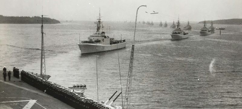 (BVN034) HMCS BONAVENTURE leading the Atlantic Fleet into Halifax for the 50th Anniversary of the RCN Courtesy of John Gabel