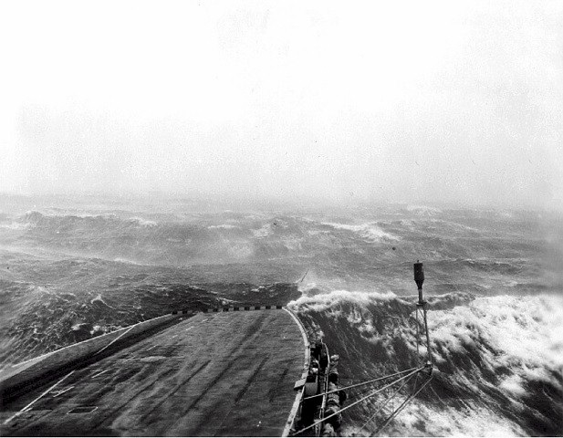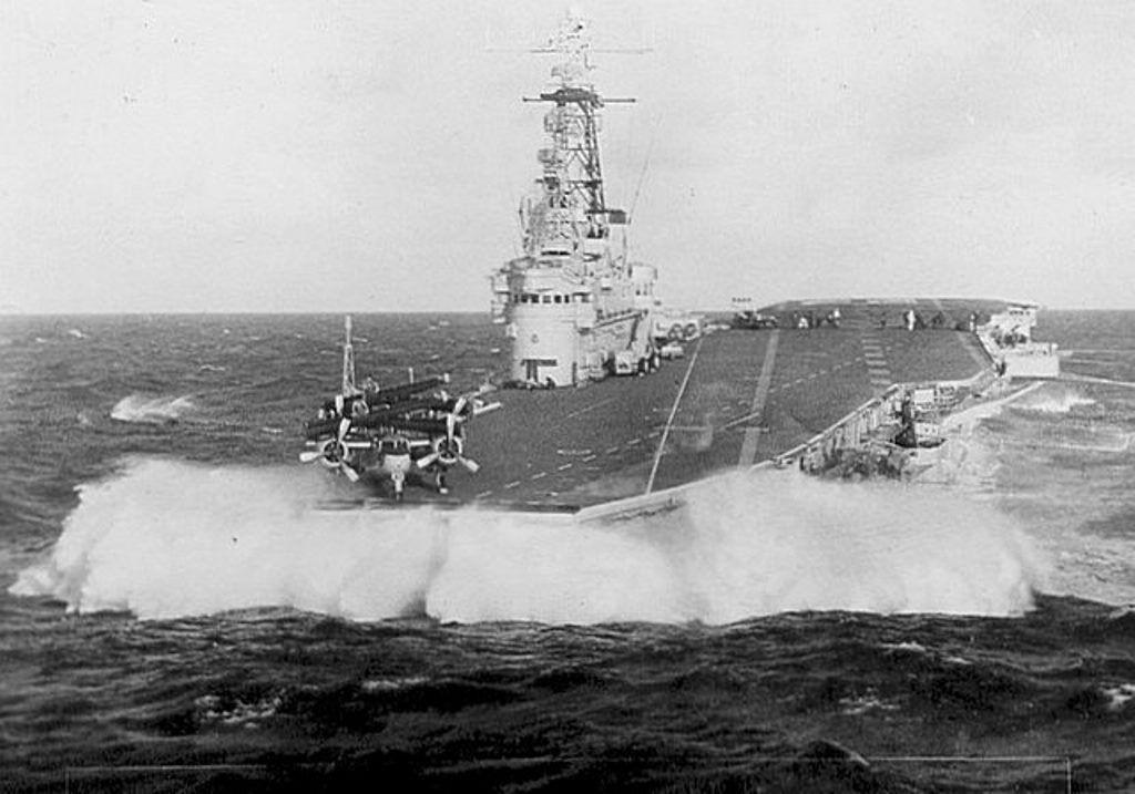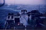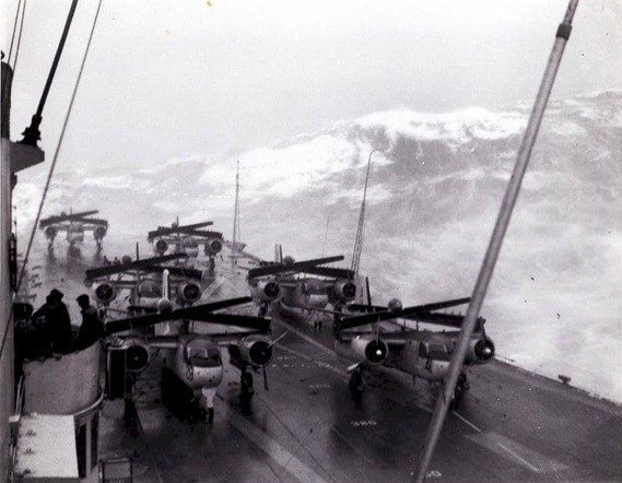 In Nov/Dec 1959, during a 6-week deployment that included a NATO Exercise, HMCS BONAVENTURE, in company with HMCS ALGONQUIN, HMCS IROQUOIS, HMCS SIOUX and HMCS ATHABASKAN encounter a major storm that battered the squadron on their return to Halifax. One day out of Halifax, a tracker crashed into the sea shortly after take-off with a loss of all 4 crew. During the storm the elevator got pushed down by a wave. Personnel were sent to the hanger to push water towards the drains with anything they could get their hands on.