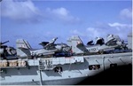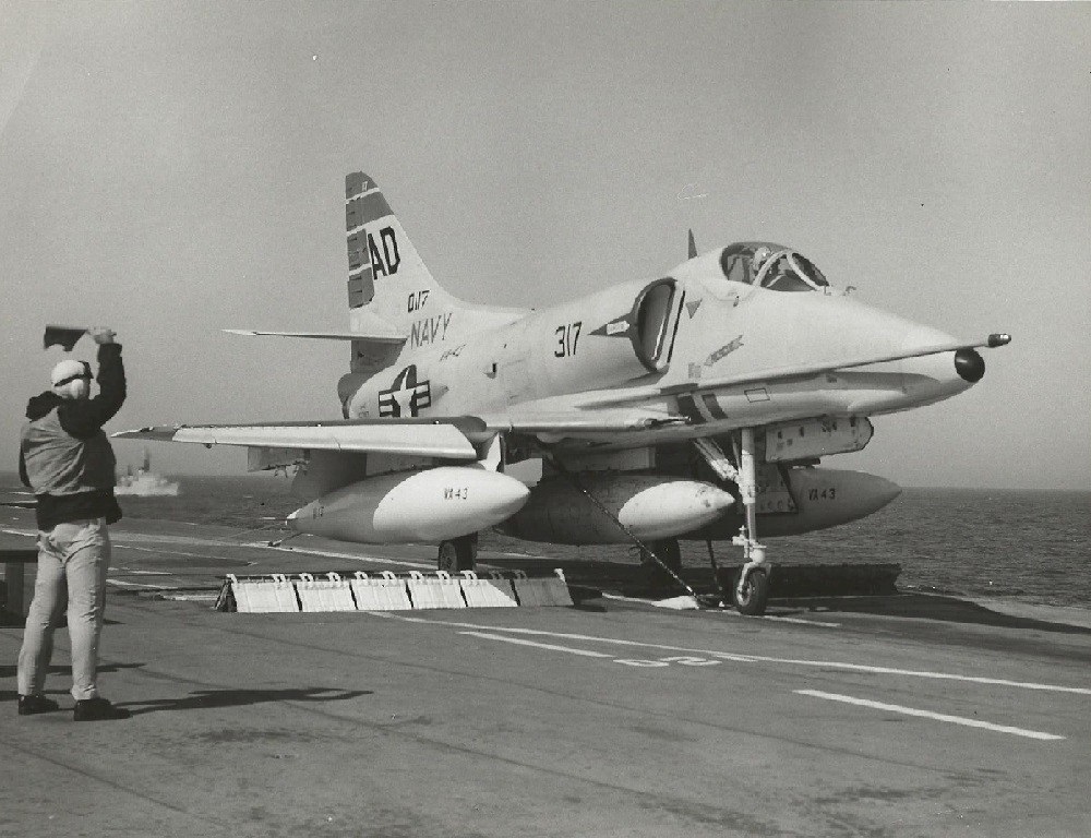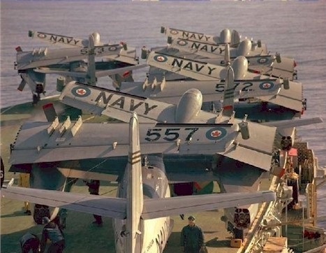 (TP05) US Navy jet on HMCS BONAVENTURE (TP06) USN jet on HMCS BONAVENTURE ready for launching // Loaded with weapons, bridle gear hooked up for shot of deck, destroyer in back ground as plane guard, one of the few times ever had jet on deck Courtesy of Tom Price