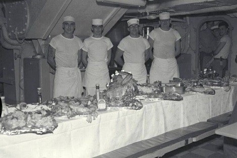 (BVN055) Christmas dinner on HMCS BONAVENTURE circa 1968 // (L-R) LS George Haigh, LS Jimmy Westlake, LS Bob O'Hara , LS Harold Penny // Courtesy of Ronald Henry (BVN056) How the Bonnie cooks relaxed after long days at sea - on the beach in Trinidad (I think) 1969. Paul Wheeler, Shaky Eddy, myself (Ronald Henry) and Earl Sweeny (first army cook to go to sea). I see we are all having a wet or two: proud diplomats we are // Courtesy of Ronald Henry (BVN057) Newspaper article on HMCS BONAVENTURE coming out of refit // Courtesy of Mike Reynolds (BVN058) HMCS BONAVENTURE Arctic Circle Crossing the Line Certificate for Francis Dowdall - 21 Sep 1968 // Courtesy of Francis Dowdall (BVN059) HMCS BONAVENTURE undergoing inclination trials // Courtesy of the CFB Esquimalt Naval and Military Museum