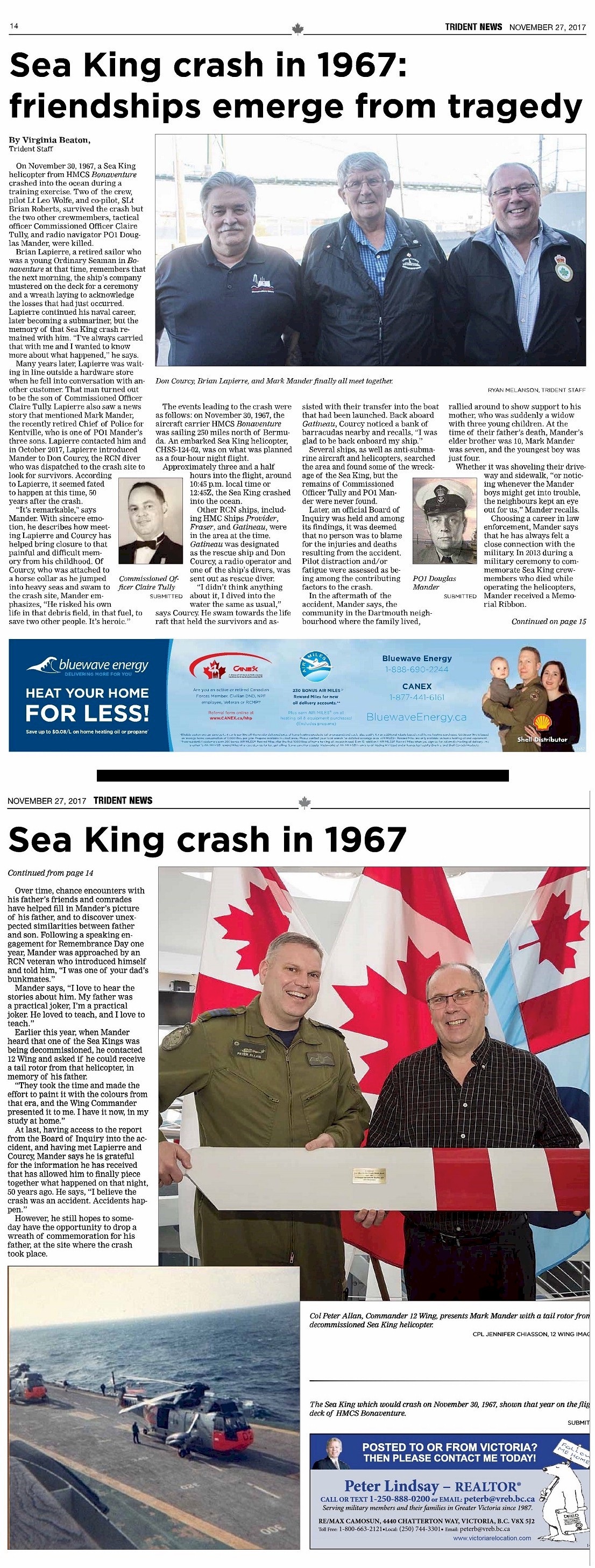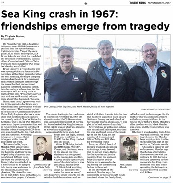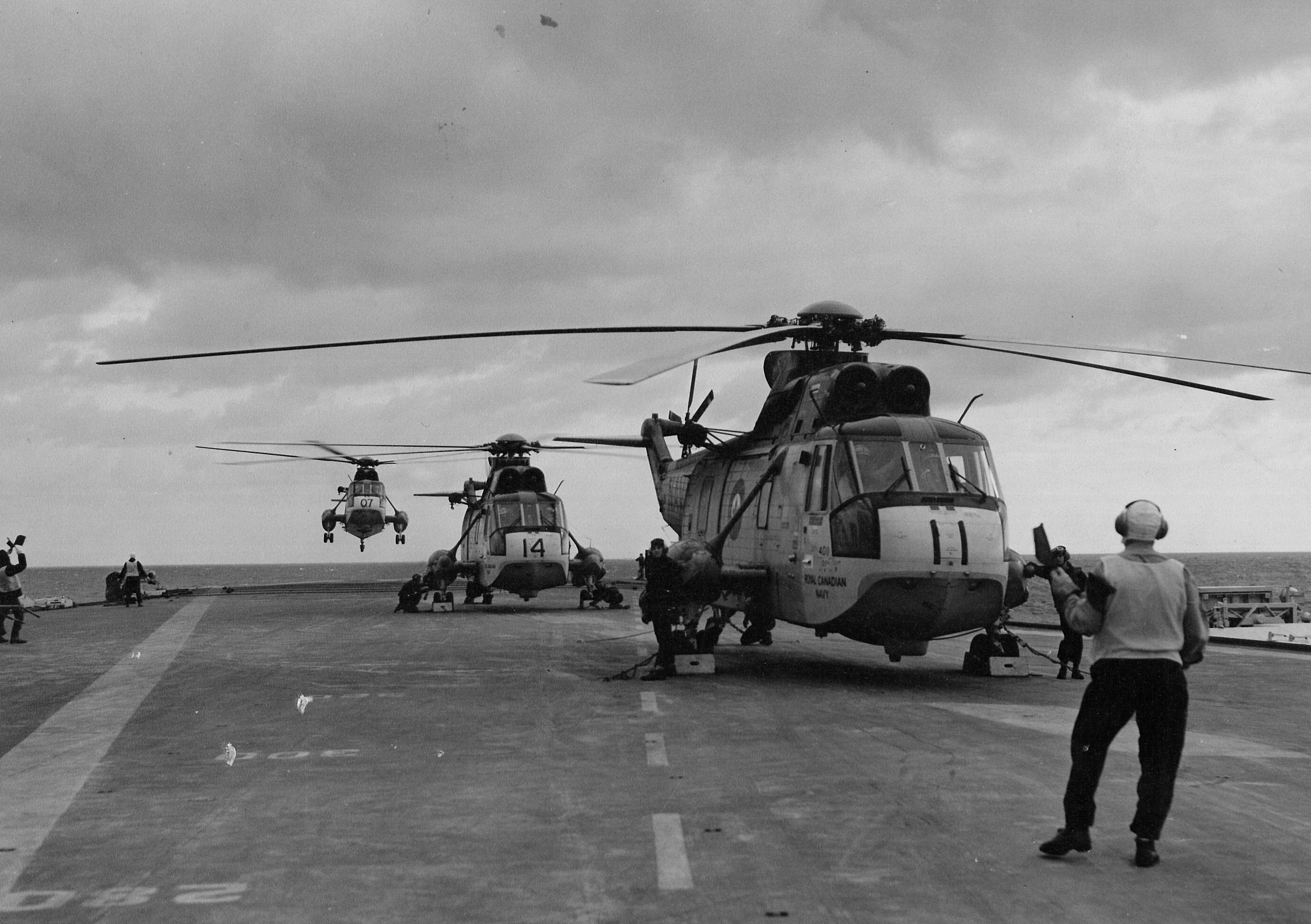 On Thursday, 30 Nov 1967, while operating in the North Atlantic, Sea King 402 off HMCS BONAVENTURE, crashed into the Atlantic. While the two pilots were ejected on impact and survived, 2 air crew died. Click here to read more on the crash of Sea King CHSS-12402