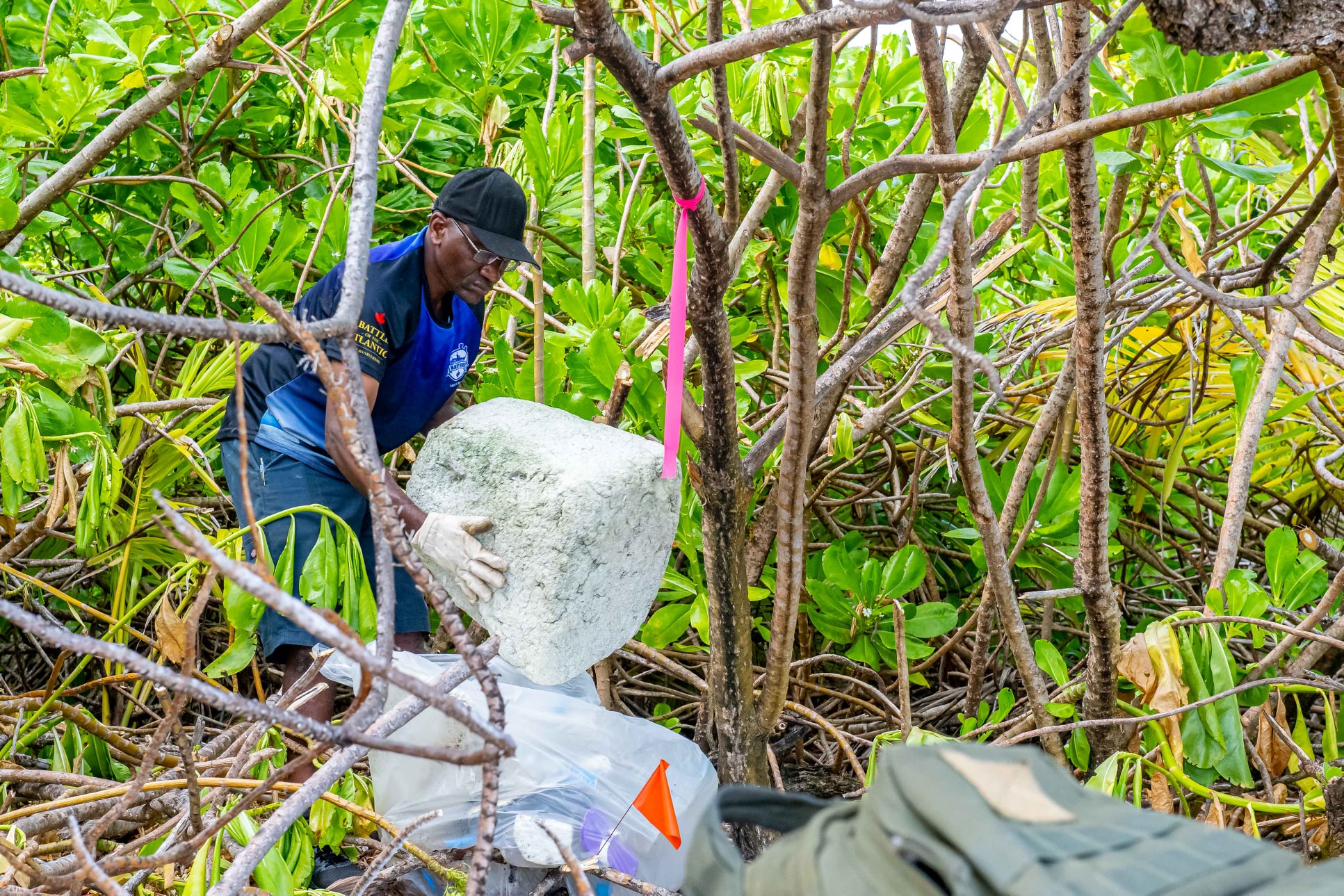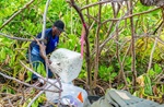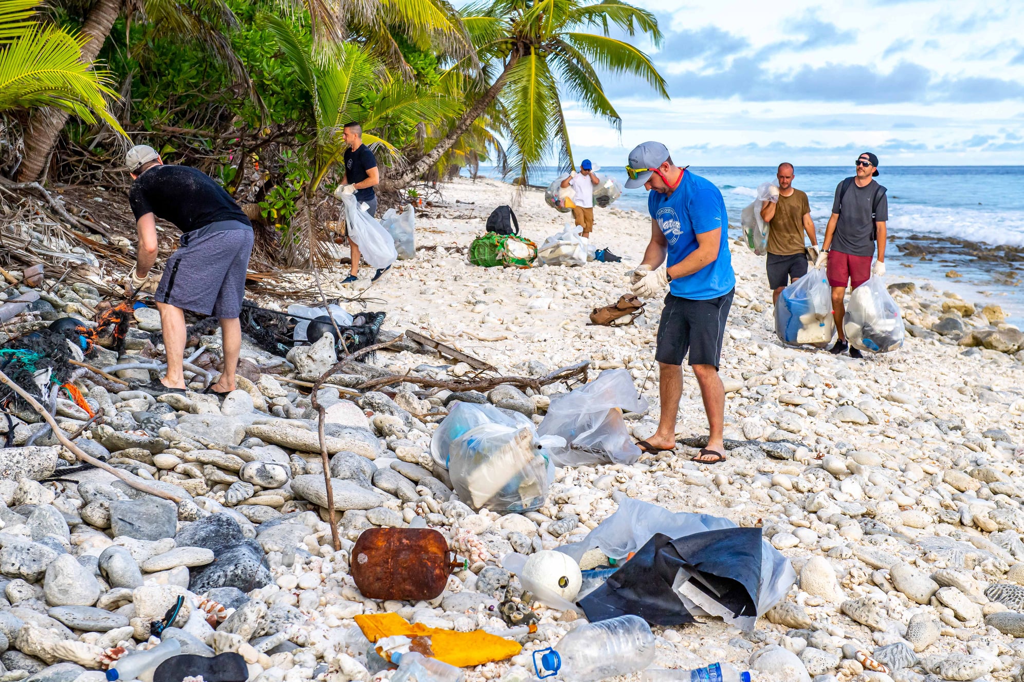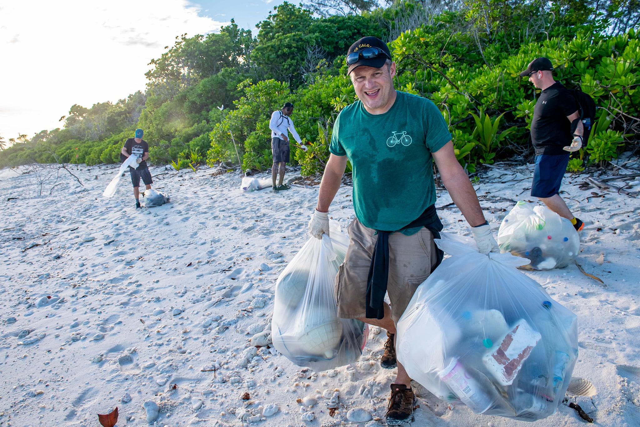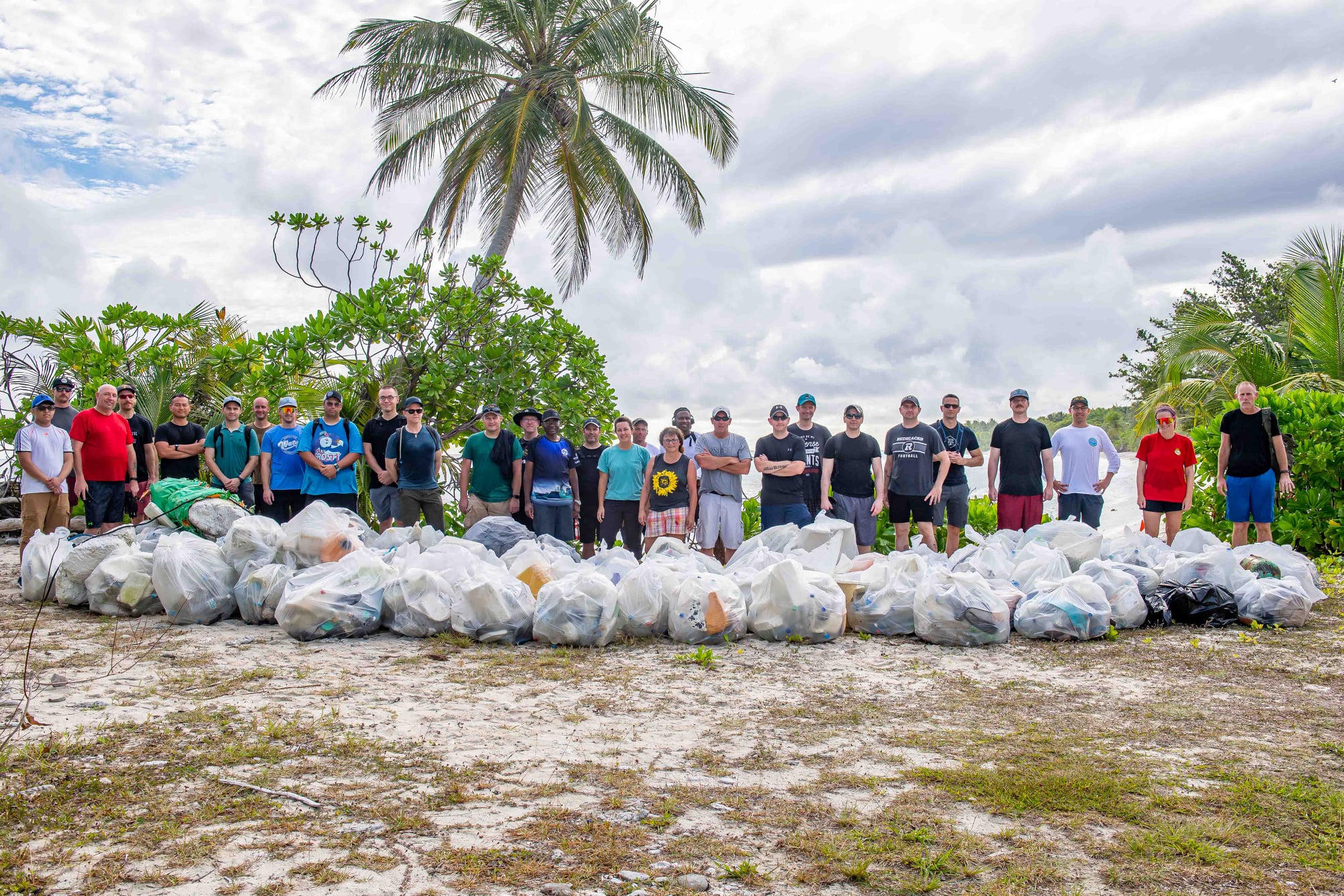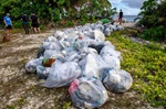 (CGY006-CGY009) HMCS CALGARY clear debris from a 1 km stretch of a beach on the island of Diega Garcia. 80 bags of trash were collected - Jul 2021 // Photographer: Cpl Lynette Ai Dang