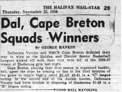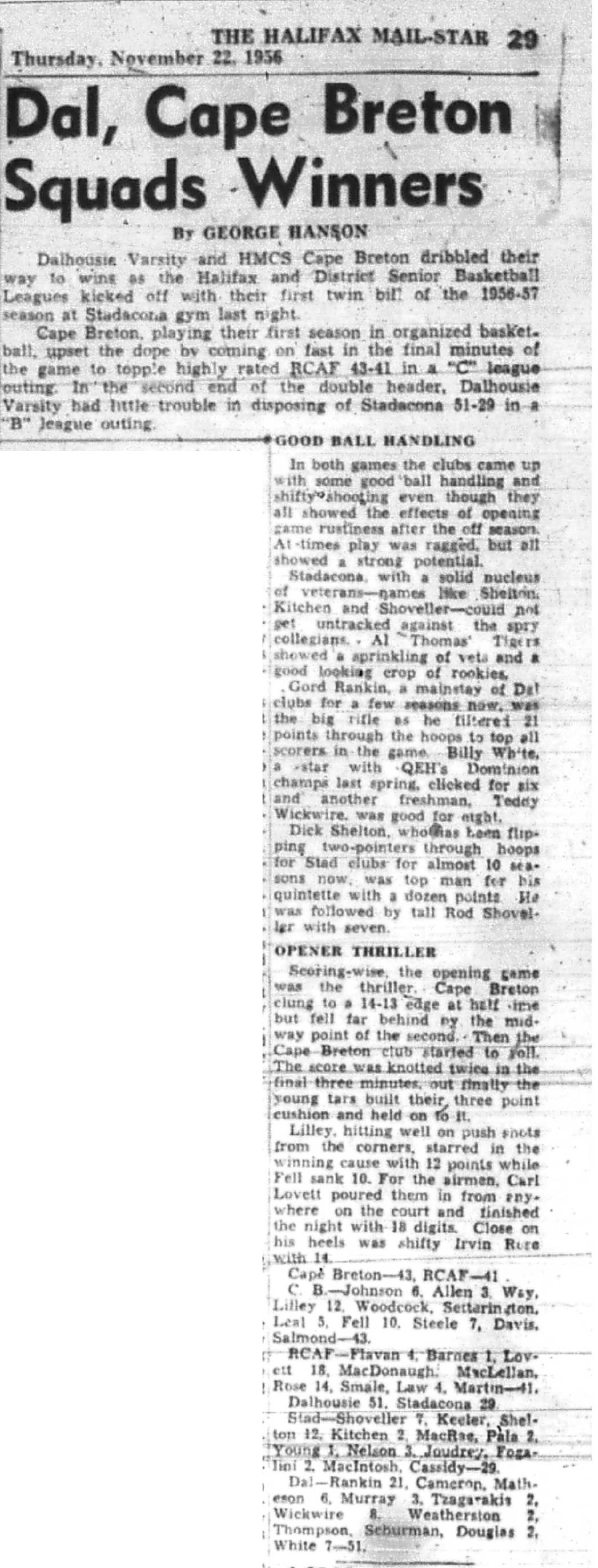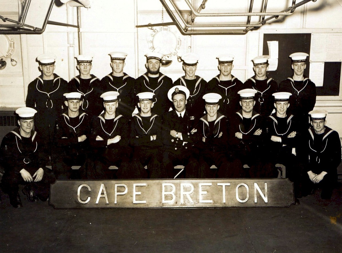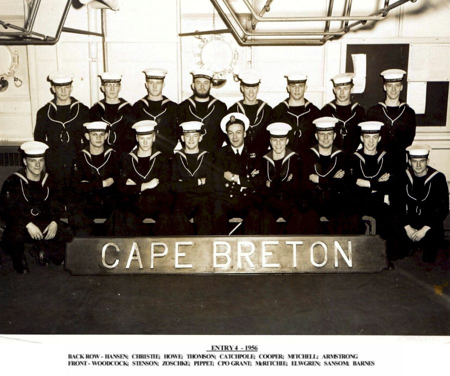 (CBN001) HMCS CAPE BRETON 100 - mid-1950s // Courtesy of Hugh Muir (CBN002) HMCS CAPE BRETON 100 - undated (CBN003) Newspaper article on HMCS CAPE BRETON's basketball victory - The Halifax Mail-Star 22 Nov 1956 (CBN004) HMCS CAPE BRETON Naval Engineering Apprentice program - Entry 4 - 1956 (with names) // Front: Woodcock, Stenson, Zoschke, Pippet, CPO Grant, McRitchie, Elwgren, Sanom, Barnes // Rear: Hansen, Christie, Howe, Thomson, Catchpole, Cooper, Mitchell, Armstrong // Click here to see Entry 4 course members at their 50th Reunion