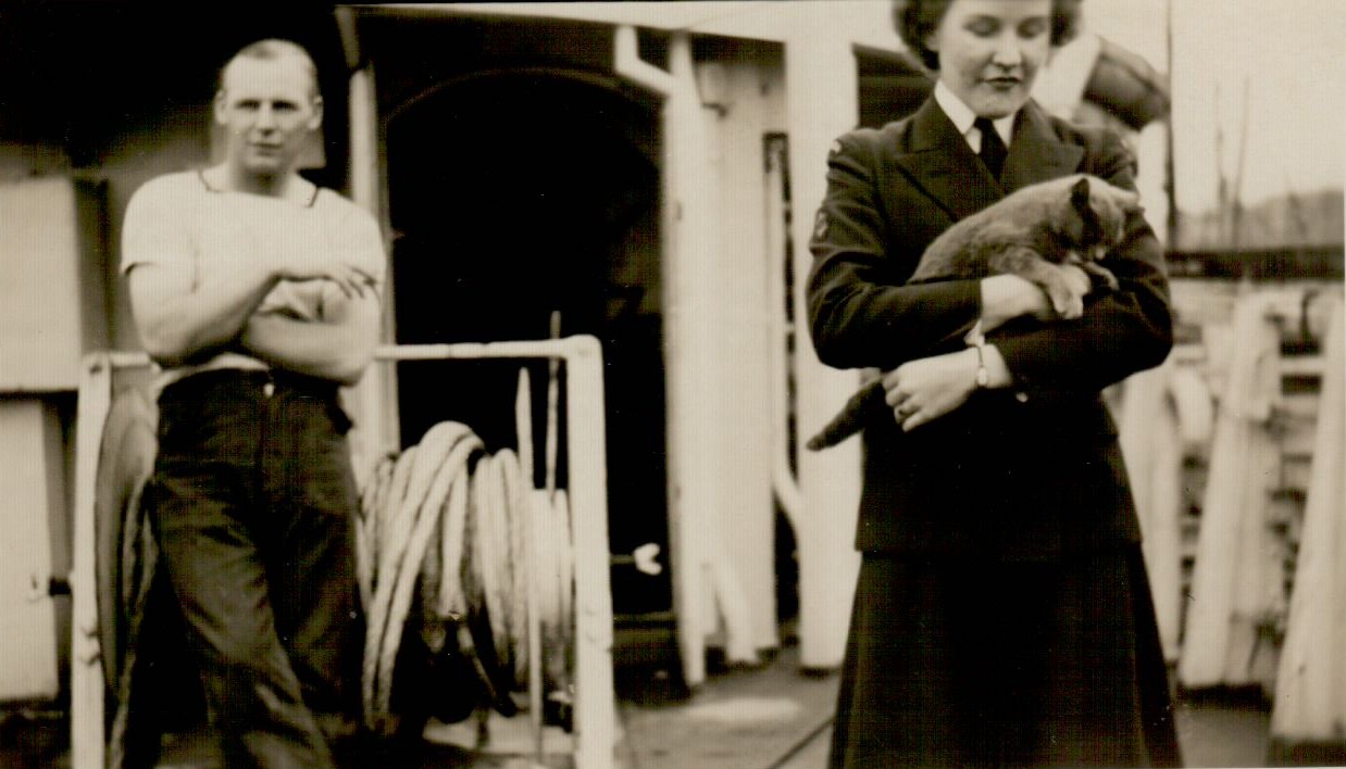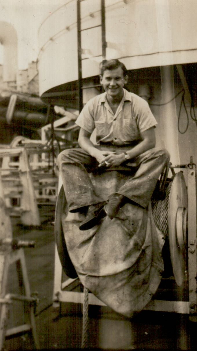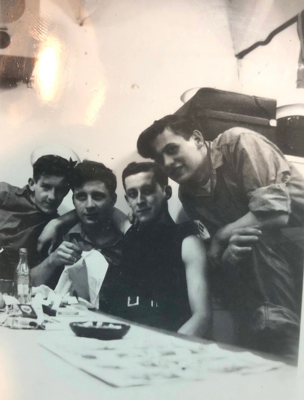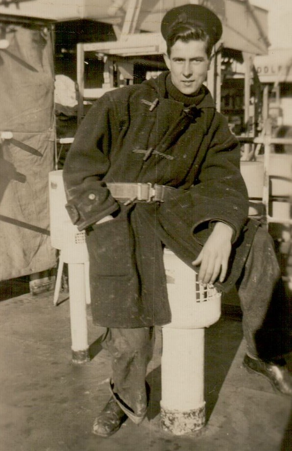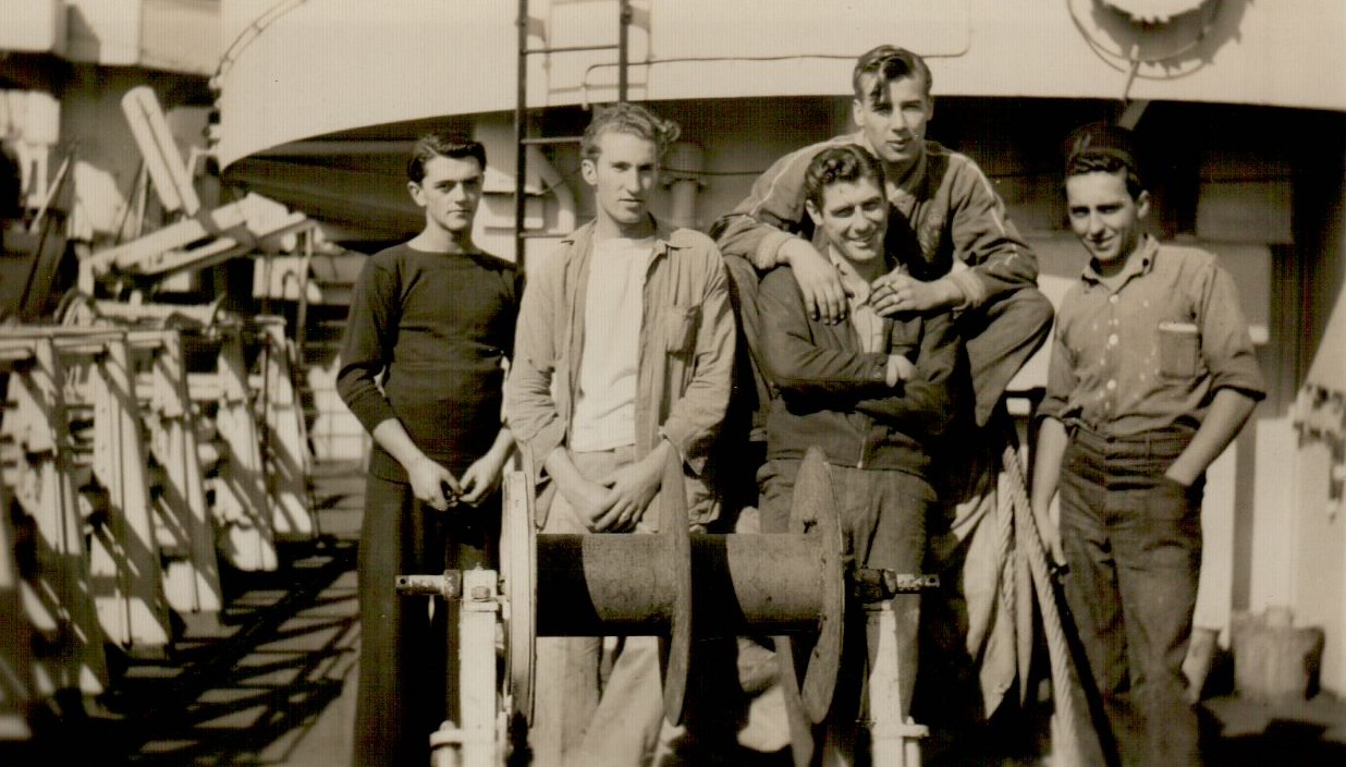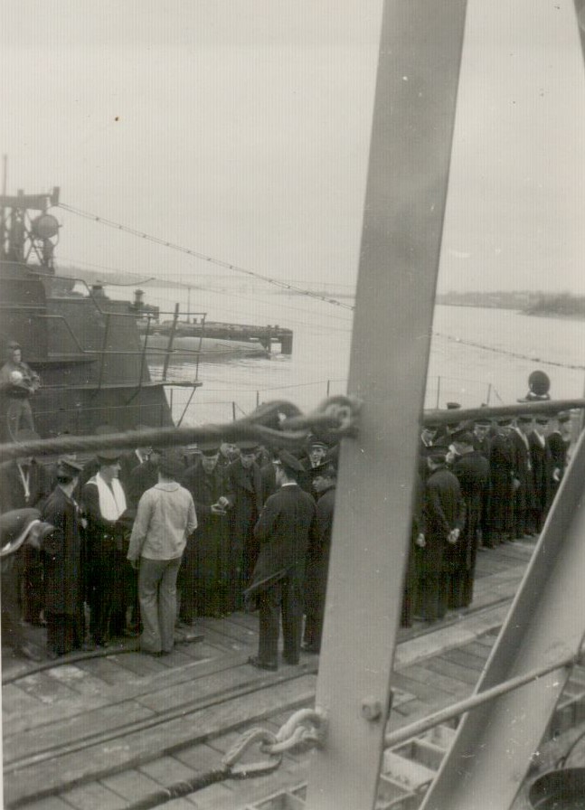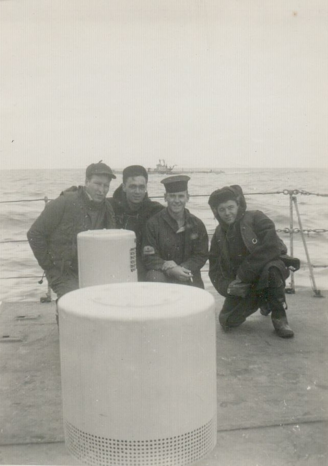 (RJS020) Charlie Thwaites on HMCS CARLPLACE K664 (RJS021) Charlie Thwaites on the right with unknown shipmate on HMCS CARLPLACE K664 (RJS022) L-R: LTO Pete Lowery, ST John Mursa, SD Charles Thwaites, ST Bob Monk on HMCS CARLPLACE K664 with Royal Navy submarine P229 HMS/m SPORTSMAN the background. The SPORTSMAN was escorted by HMCS CARLPLACE from Groton, New London, Conneticut, USA to Holy Loch, Scotland, Apr 1945 (RJS023) Unknown sailors on the quarterdeck of HMCS CARLPLACE K664 (RJS024) Unknown sailors in the after gun tub on HMCS CARLPLACE K664