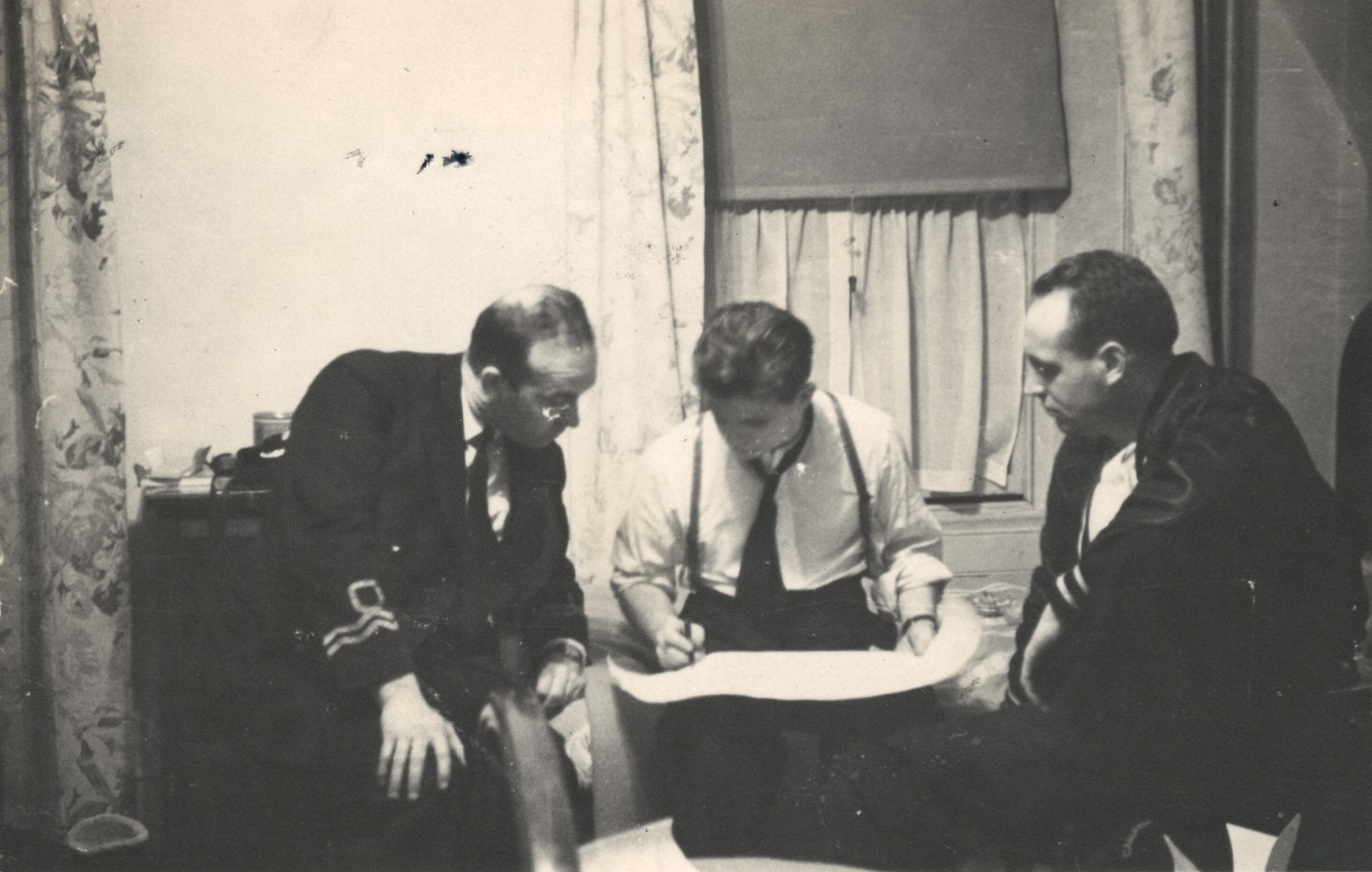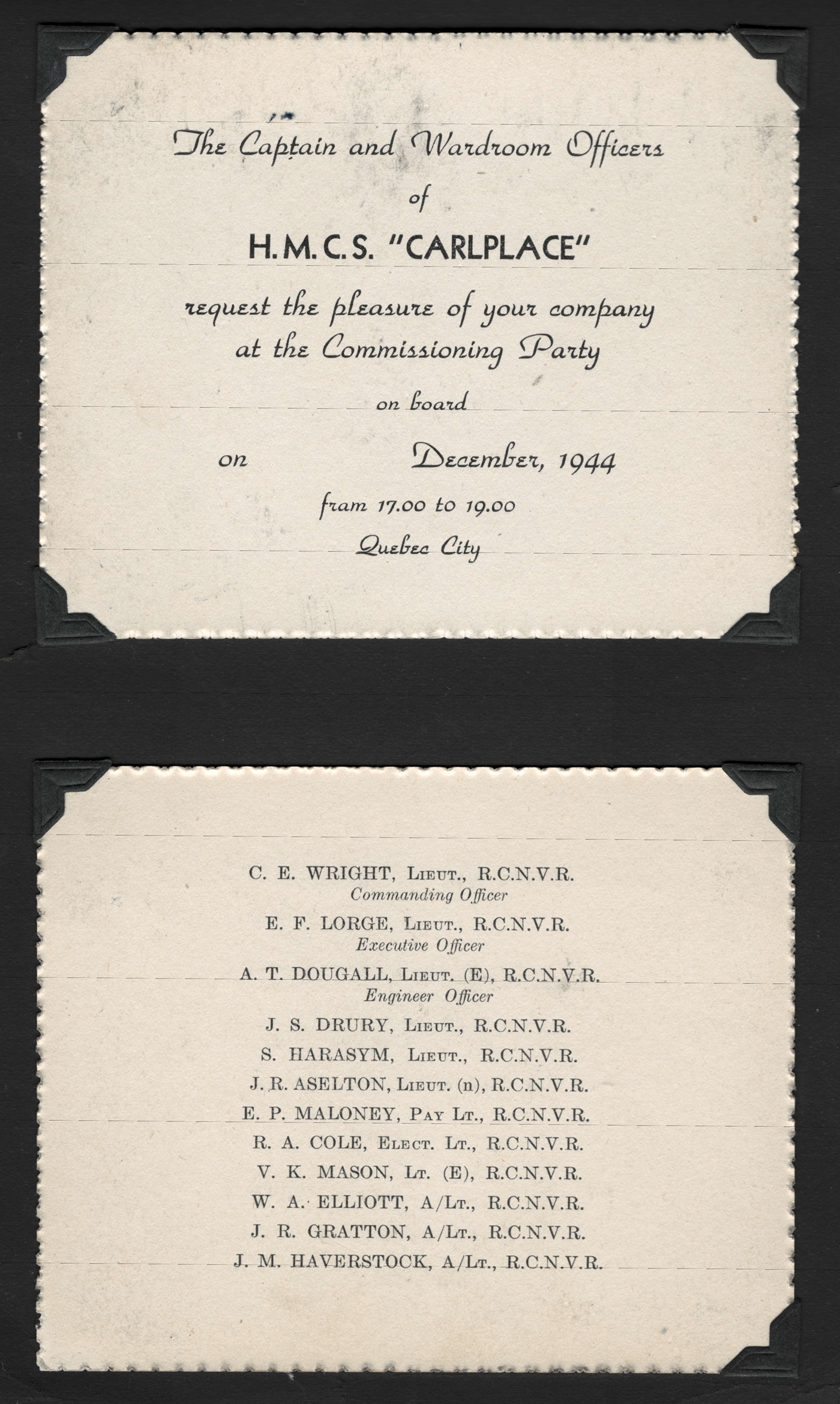 (AD56) Invitation to the Commissioning Party of HMCS CARLPLACE K664 (AD57) Somewhere in Quebec City (AD58) LCdr Charles Wright Commanding Officer, Lt Allan T. Dougall EO and Ellsworth F. Large 1st Lt on HMCS CARLPLACE K664 - Dec 1944 (AD59) Lt Ellsworth F. Large and Lt (E) Allan T. Dougall on HMCS CARLPLACE K664 - Dec 1944