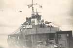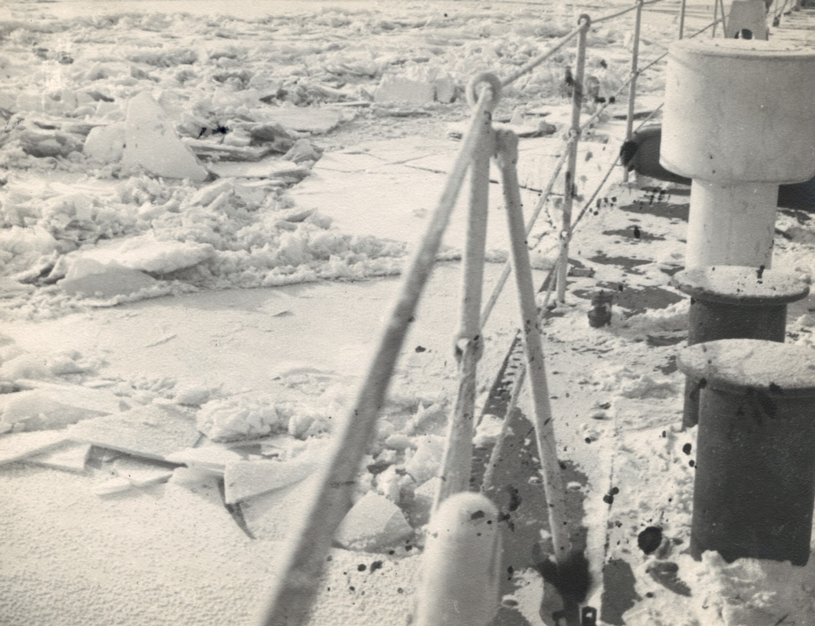 HMCS CARLPLACE K664 transiting the St Lawrence to Halifax forcing passage through heavy ice - Dec 1944 (AD65) From the quarterdeck looking forward towards the bridge (AD66) Still pushing through ice (AD67) The ice is starting to thin (AD68) Clear waters ahead