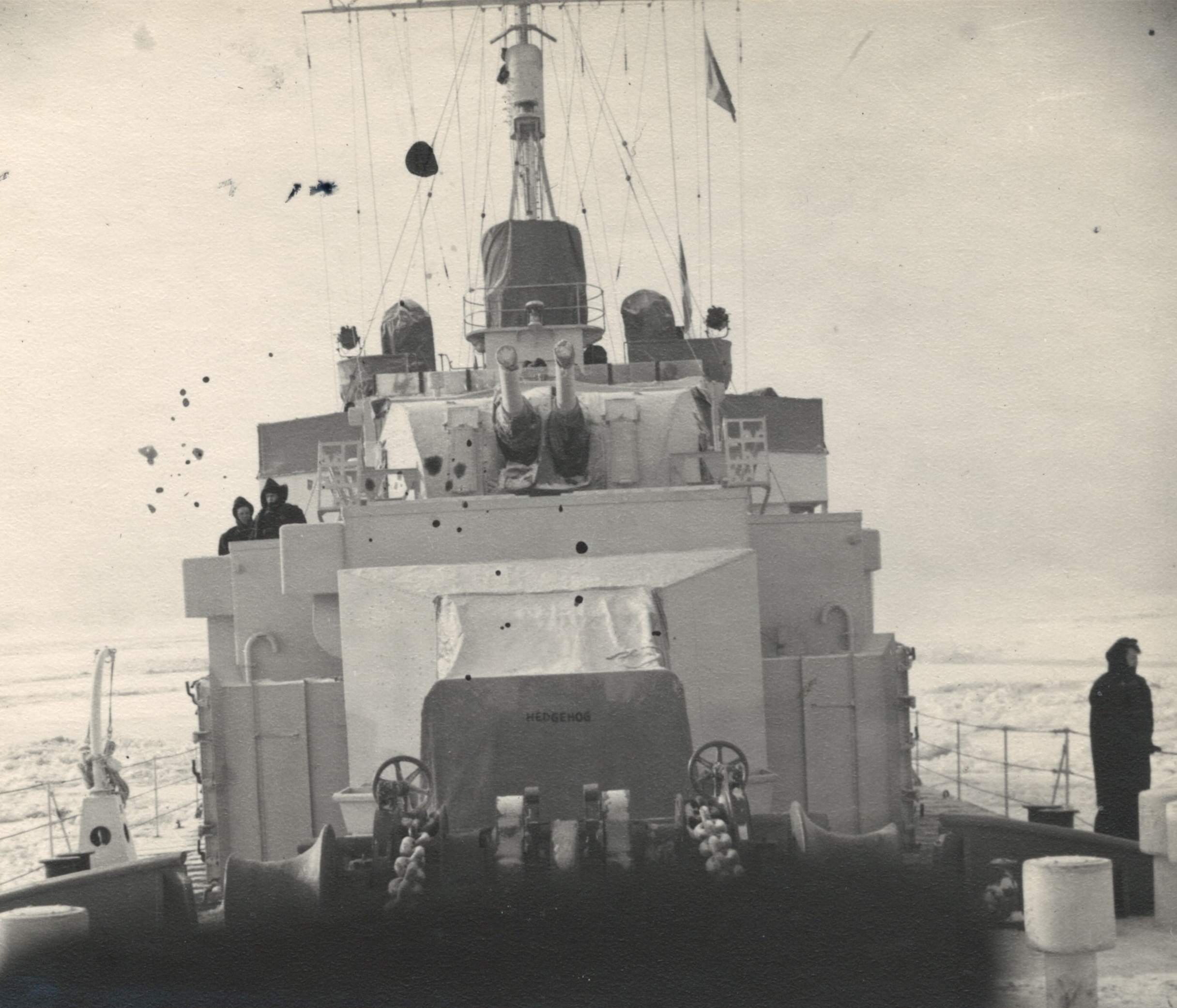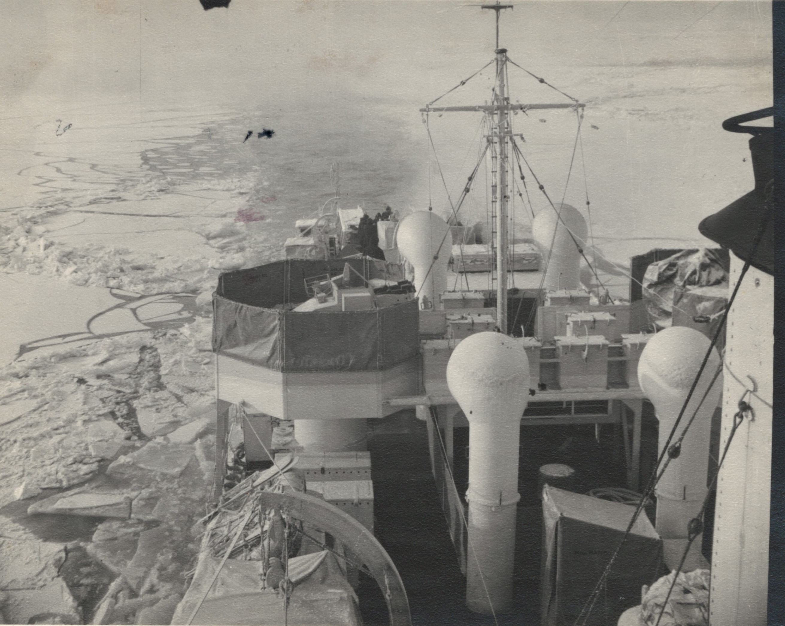 HMCS CARLPLACE K664 transiting the St Lawrence to Halifax forcing passage through heavy ice - Dec 1944 (AD60) Barely making headway (AD61) Looking and the bridge and gun mount from the fo'c's'le (AD62-AD63) Looking aft from the bridge (AD64) Heavy ice field ahead