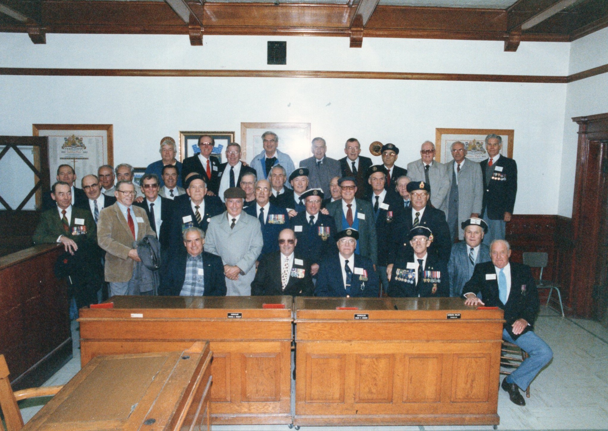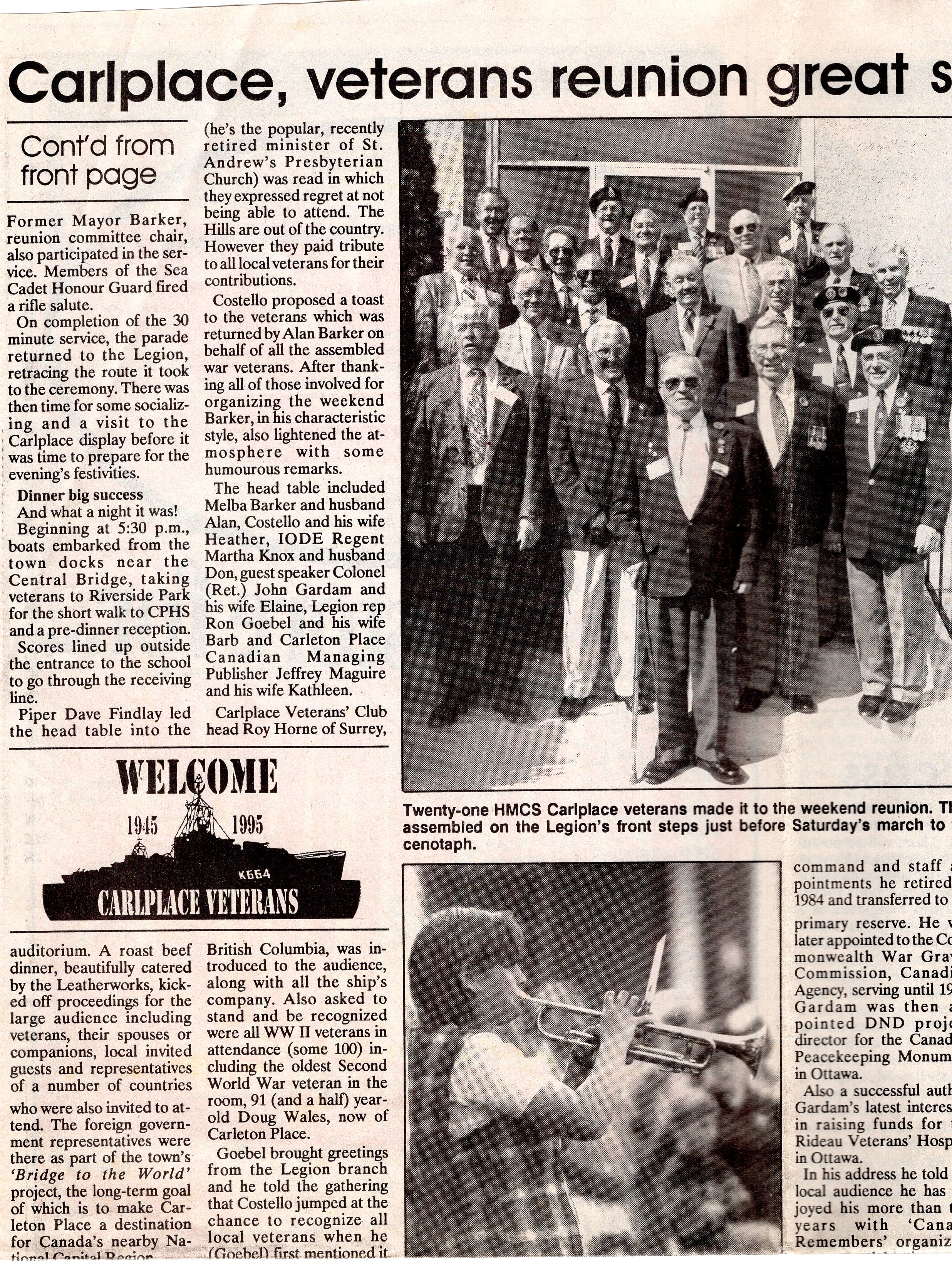 HMCS CARLPLACE K664 1995 former crew reunion (RJS037) HMCS CARLPLACE former crew members at the reunion (RJS038) Names of former crew in the reunion photo (RJS039) HMCS CARLPLACE crew reunion - spouses (RJS040) HMCS CARLPLACE reunion attendees marching to the cenotaph along with Legion members (RJS041) Partial article on the HMCS CARLPLACE former crew members reunion From the collection of Reginald Seabrook, RCNVR Courtesy of Heather