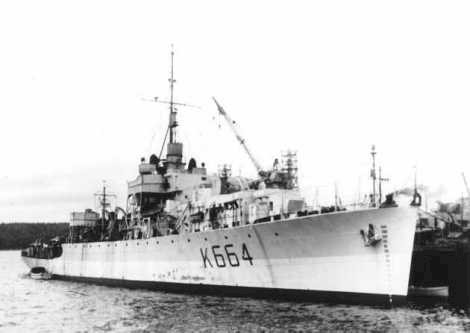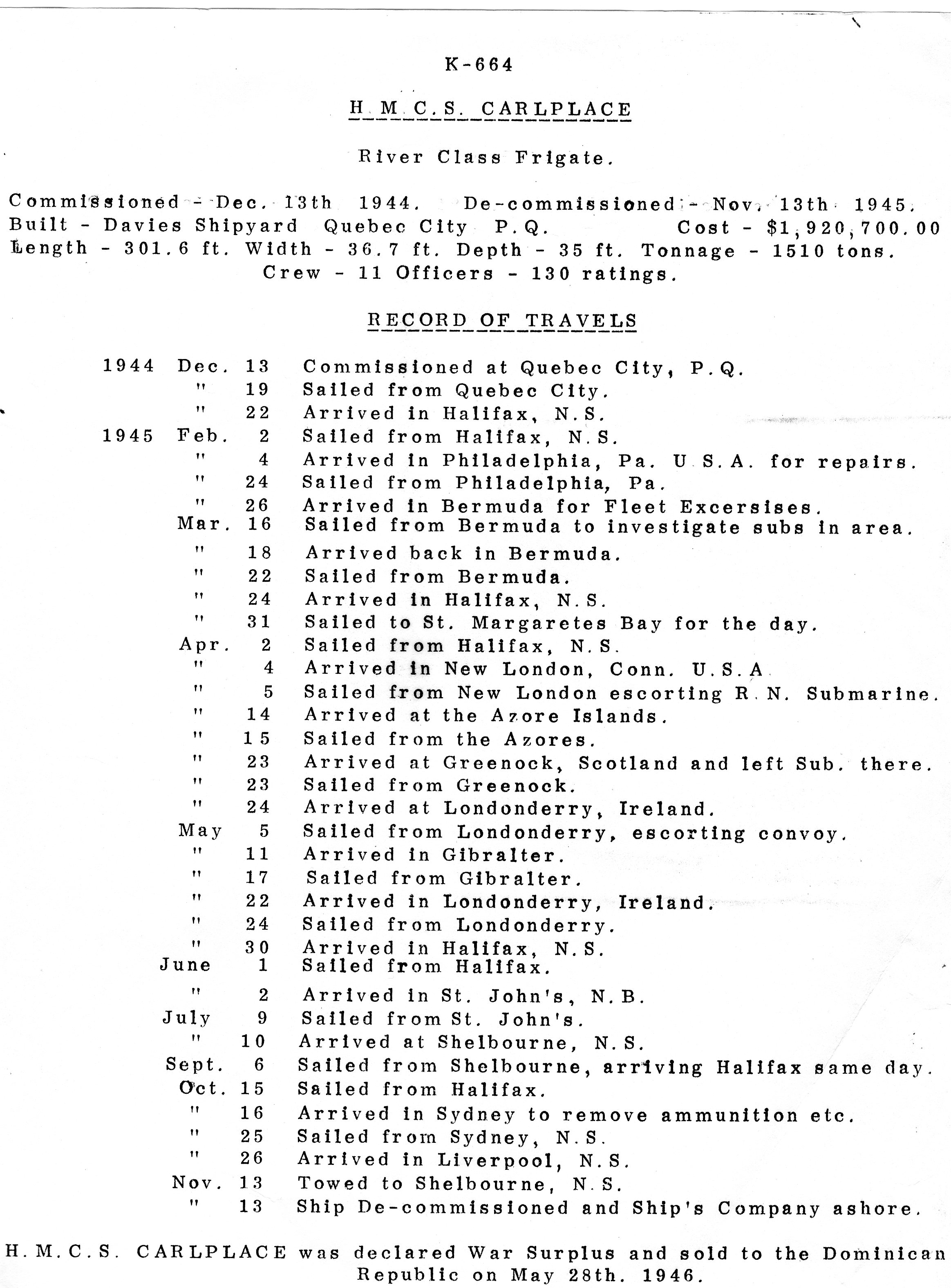CARLPLACE was commissioned on 13 Dec 1944, at Quebec City, the last RCN frigate to enter service. En route to Halifax, she suffered serious ice damage to her hull, necessitating several weeks' repairs at Halifax and Philadelphia. She then proceeded to Bermuda to work up, returning to Halifax on 24 Mar 1945. In Apr 1945 she was allocated to EG 16, Londonderry, and sailed for the Clyde via the Azores (the only time she had a port visit to the Azores), escorting and RN submarine homeward bound from refit in the U.S. She finally arrived at Londonderry on 23 Apr 1945 and left on 05 May 1945 to escort convoys to and from Gibraltar. Late that month she returned to Canada from tropicalization refit at Saint John, N.B. Begun on 02 Jun 1945 and continued at Shelburne, N.S., on 10 Jul 1945. The work was called off on 20 Aug 1945, and on 13 Nov 1945, the ship was paid off at Halifax and laid up at Shelburne. Sold to the Dominican Republic in 1946 for conversion to a presidential yacht, she was renamed Presidente Trujillo after the President of the Dominican Republic. In 1962 after the family Trujillo lost there grip of power on the country, she was renamed Mella and used as a yacht-training vessel by the navy of the Dominican Republic. Armed with 1x76.2mm, 2x40mm and 4x20mm guns, she was also fitted out with American radar equipment, she was based at Santo Domingo. In 2003 she was offered free of charge by the Dominican Republic to Carleton Place, but they had to bring the vessel on their own account to Canada. But she was in a bad shape and not much was left of the original vessel and the offer was not accepted. Her final disposition is unknown.