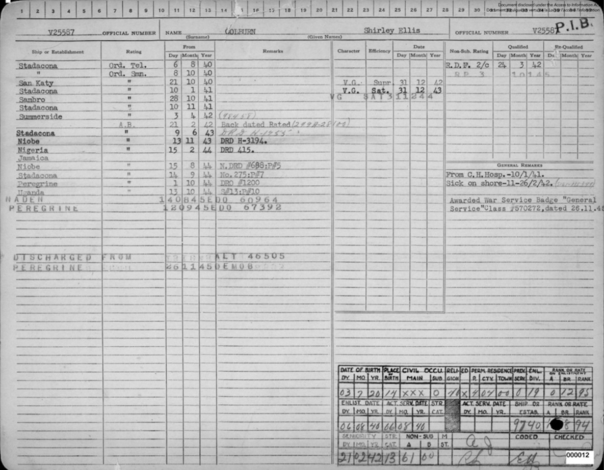 Record of Arrivals and Departures for HMCS CARLPLACE K664 13 Dec 1944 - 13 Nov 1945