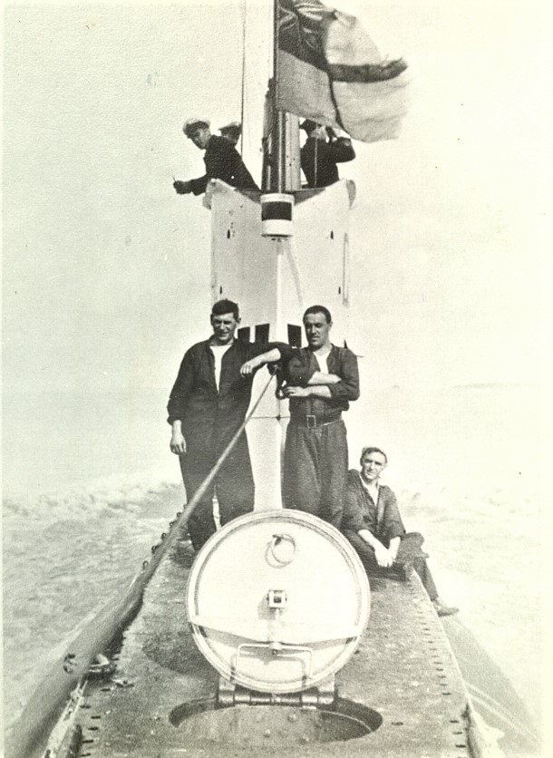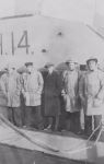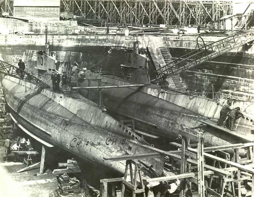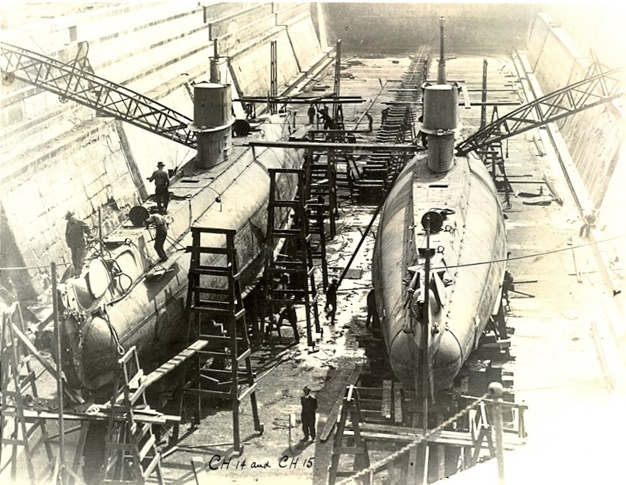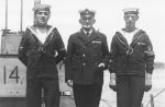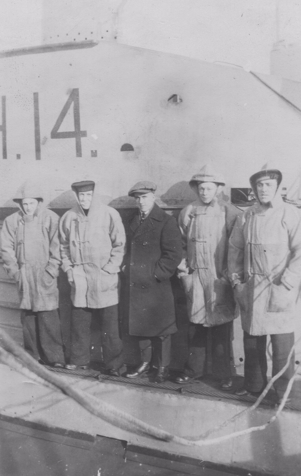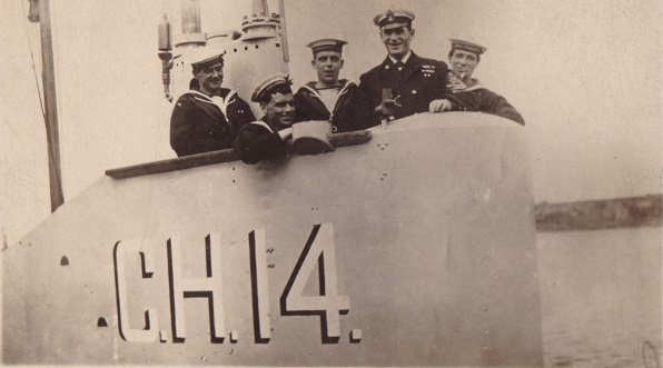 (CH14-001) Submarines CH14 and CH15 - Britain transferred these "H" class submarines to Canada to replace the worn out First World War submarines CC-1 and CC-2. Arriving in Halifax from Bermuda in 1919, the two submarines were refitted and entered Canadian service in 1921. Although these two boats were American-built, Canadian Vickers' Montreal shipyard had built similar submarines for Britain. Taken out of service in June 1922 because of budget cuts, CH-14 and CH-15 lay rusting in Halifax's Northwest Arm alongside the paid off light cruiser HMCS Aurora until 1927, when all three vessels were sold for scrap // George Metcalf Archival Collection // CWM 19910109-187 // Courtesy of the Canadian War Museum (CH14-002) Crew members of CH-14 - names unknown // Written on back of photo - Tom ? Temple // Courtesy of Donna Grayson (CH14-003) Stoker Amedee Gagnon (left) with two unidentified sailors in front of CH-14 // Date and location unknown // From the collection of Amedee Gagnon // Courtesy of Ian McDonald (CH14-004) Stoker Amedee Gagnon (1st on right) - other 4 pers unidentified - in front of CH-14 - circa 1920 // From the collection of Amedee Gagnon // Courtesy of Ian McDonald