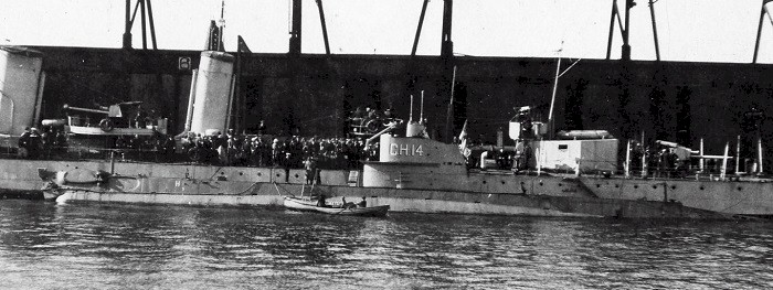 H-14 was launched in 1917, her specifications were: Length: 150 ft, Beam: 12 ft, Draught: 12 ft, Speed: 13/11 kts, Complement: 4 officers, 18 men, Armament: 4-18in TT. She saw service with the Royal Navy in Bermuda. On 15 Apr 1918, H-14 departed Bermuda for the Azores in a group that consisted of some 40 Allied ships led by USS Salem. Shortly after leaving port, H-14 collided with the oiler ARETHUSA, necessitating a return to Bermuda. H-14 was towed back to Bermuda by CONESTOGA on 18 Apr 1918. In Feb 1919 the Royal Navy presented H-14 and her sister ship, H-15 to the Royal Canadian Navy where they were re-named HMCS CH-14 and CH-15, respectively. Scarcely used, they were paid off on 30 Jun 1922 and placed in the hands of caretakers at Halifax. They were sold for scrap five years later.