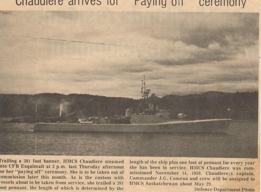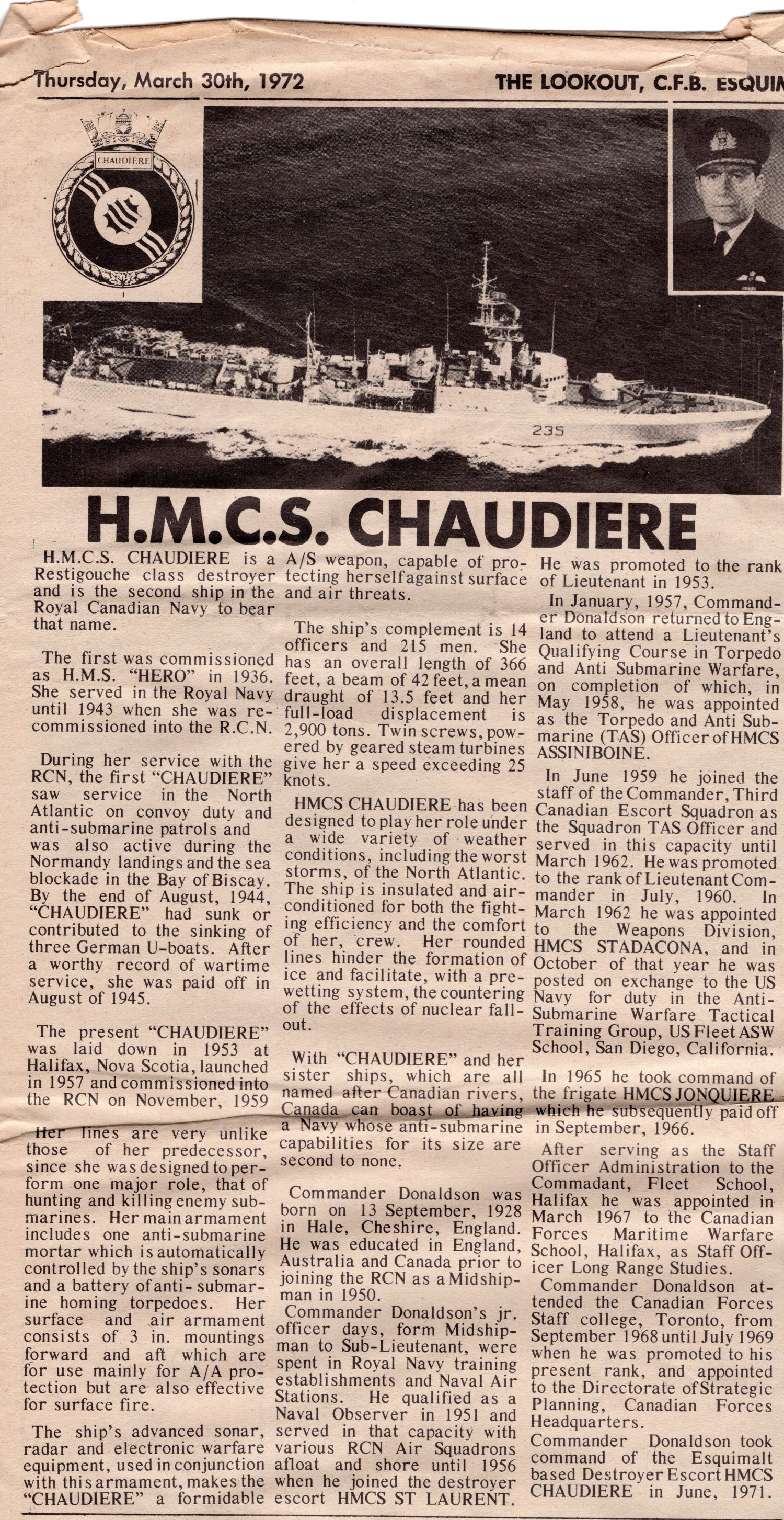 Article on HMCS CHAUDIERE from "The Lookout", CFB Esquimalt 30 Mar