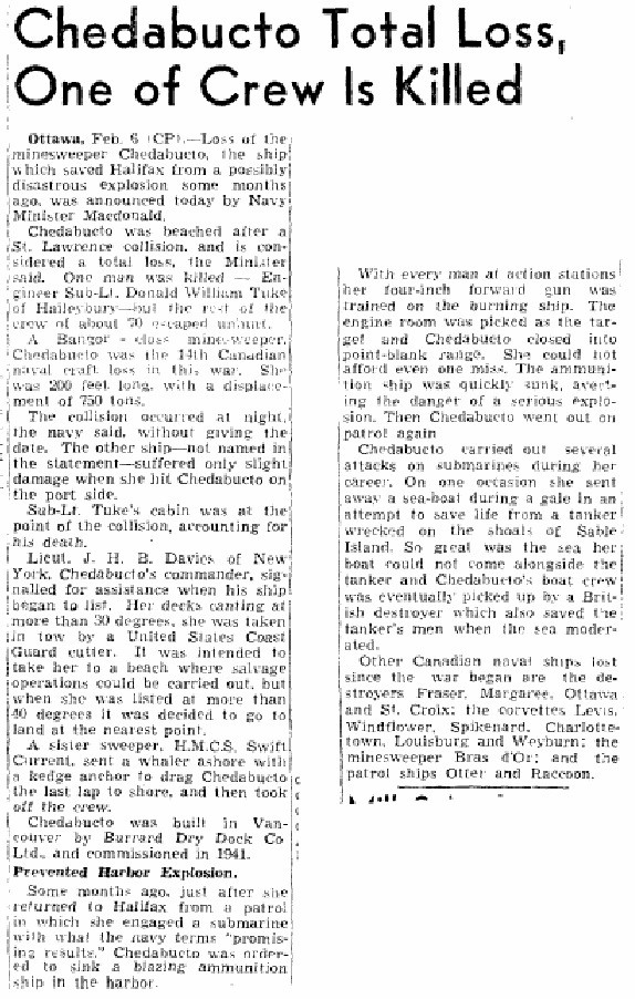 (CDB001) HMCS CHEDABUCTO J168 // From the collection of Douglas Allan Jamieson // Courtesy of David Jamieson (CBD002) SS TRONGATE - Date and location unknown. Source: Wrecksite.Eu (CDB003) HMCS CHEDABUCTO after collision with cable ship SS Lord Kelvin. A tow rope had been attached in an attempt to save the CHEDABUCTO // Source: The Legion Magazine 22 Oct 2010 (CDB004) Newspaper article on the loss of the CHEDABUCTO // Source: Canada's Virtual War Memorial (CDB005) Minesweeper CHEDABUCTO Rammed - Is Total Loss // From the collection of J. Vincent Wesley, CPO, RCNVR // Courtesy of Marilynn Taylor