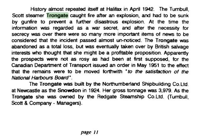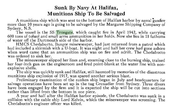 Halifax - British Salvage experts are writing the sequel to a Halifax Harbor drama of the second world War on which the Navy rang Down the curtain. It was at 1.50 on 10 April to 1942, that a naval Shell Tore through the burning holds of the explosives Laden freighter Trongate and harbour water snuffed out the towering flames that had yellowed the sky. Probably less than 15 minutes were needed to sink the 7,000-ton merchantman in la fathoms of water. Salvaging her steel plates will take three divers more than a year. In wartime the convoy with Trongate began that Spring Day 13 years ago in Bedford Basin at the North end of the Harbor where all through the War convoys were marshalled to move across the Atlantic. The freighter s holds bulged with mixed cargo ??500 tons of TNT. Several Hundred tons of Small arms ammunition Wood pulp paper and tobacco. Late in the afternoon fire flickered below decks. Who first spotted it or exactly when is not known. Neither is the cause. Wartime censorship and time itself have obscured much of the Trongate's last hours. Convoy masters decided to winch the vessel out of the crowded basin and down the harbour to the open sea ??? miles away. Shortly before 2 a.m. as the Trongate stood about midway between the Dartmouth and Halifax shorelines in the centre of the harbor flames sheeted skyward from the deck. Rifle and machine gun bullets began going off and the plates glowed against an ominous backdrop of Oil storage tanks on the Dartmouth Side. The Navy held a hurried conference with port officials. It was decided to sink the ship with gunfire before the flames ate into the volatile TNT. Two Canadian and three United states warships turned their guns on the floating furnace. The bark of 4.7-Inch guns crashed through the general din. One Shell skated off the deck of the freighter whizzed across open water crunched through the Wall of a building in Paddy Flemmings spar Yard on lower water Street and thudded into a beam in Flemmings office. It didn't explode. Paddy wanted to keep it for a souvenir but a harassed Navy cleanup squad took it away. A hhell found its mark and the Trongate with clouds of steam showering upwards slid beneath the surface. What was left of the cargo was taken off a few months later. Risdon Beasley Ltd., of Southampton started the current Salvage operations last March. The bulk will yield about 1,000 tons of scrap. More than 700 tons have been raided already by powerful 50-ton hoists aboard the Salvage vessel Topmast 16. 10-ton chunks are cut smaller and the scrap is hauled away. The divers had trouble getting used to the cold harbour bottom water but now don't mind the three hour stints (Page 31, 16 Nov 1955, Brandon Daily Sun, Brandon, Manitoba)