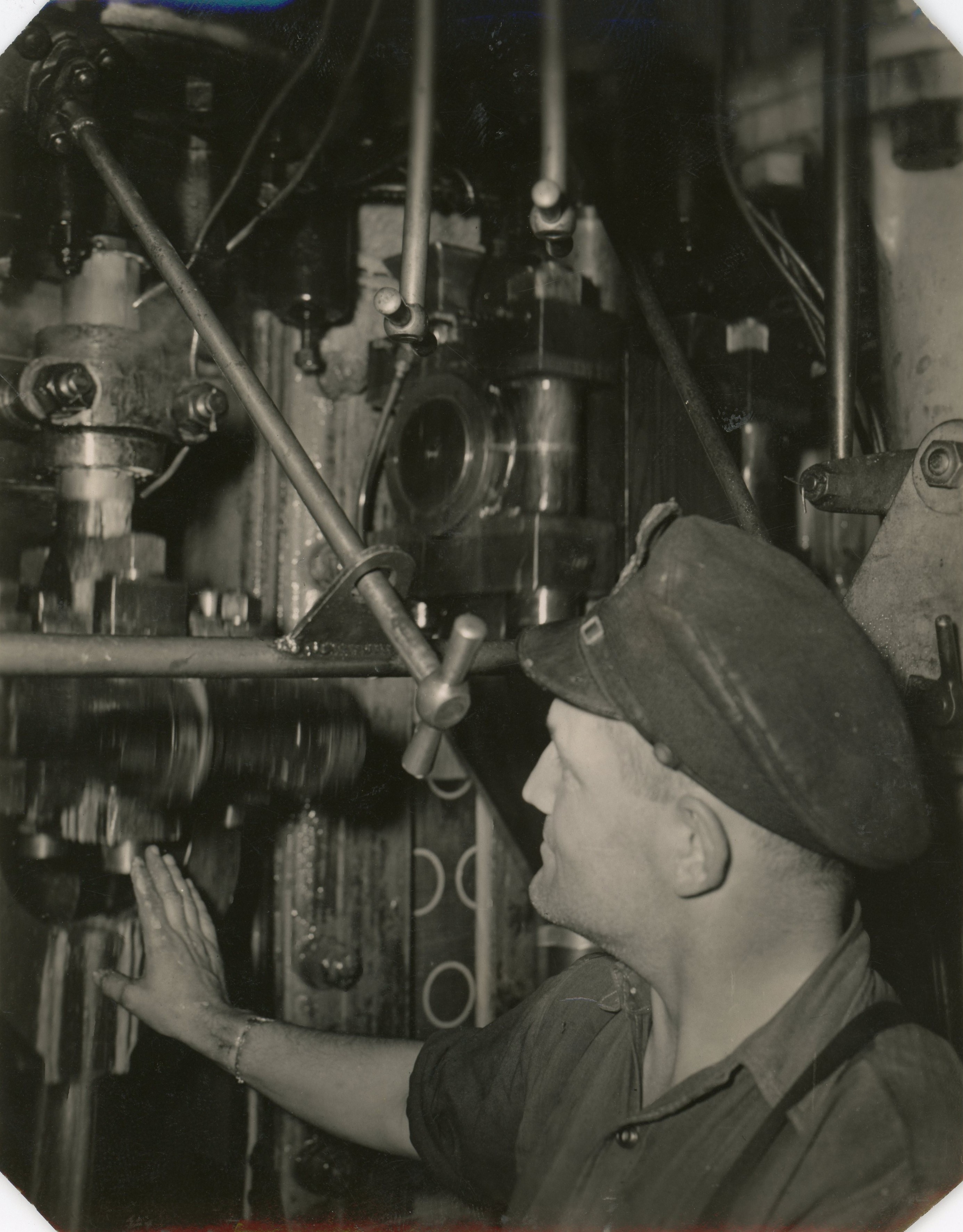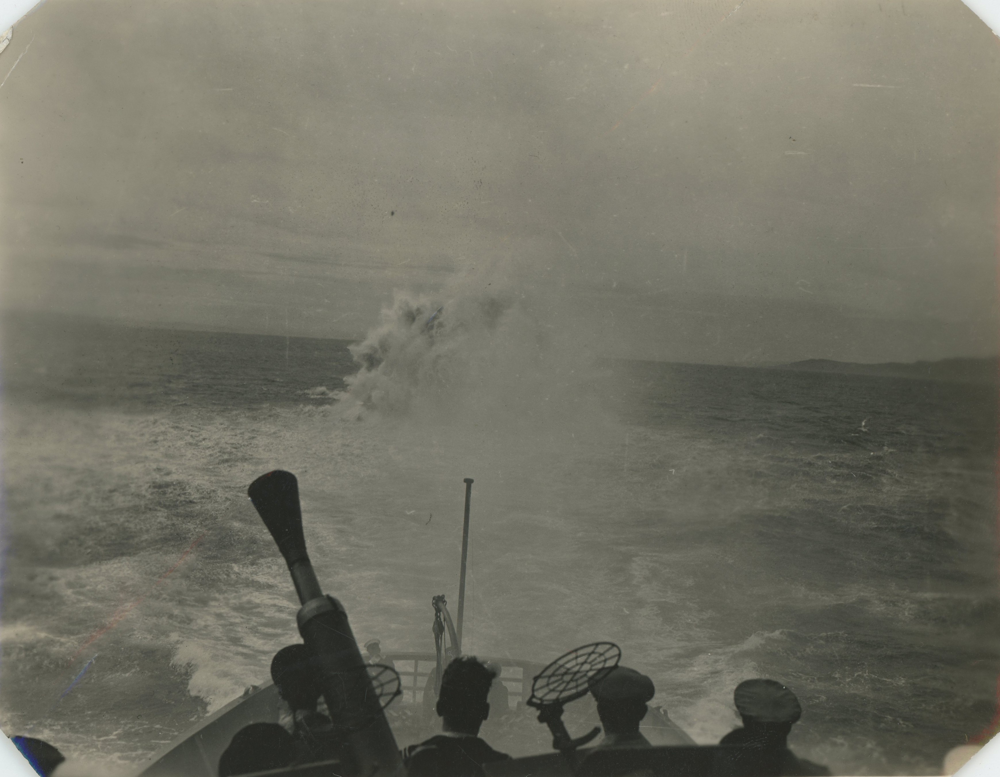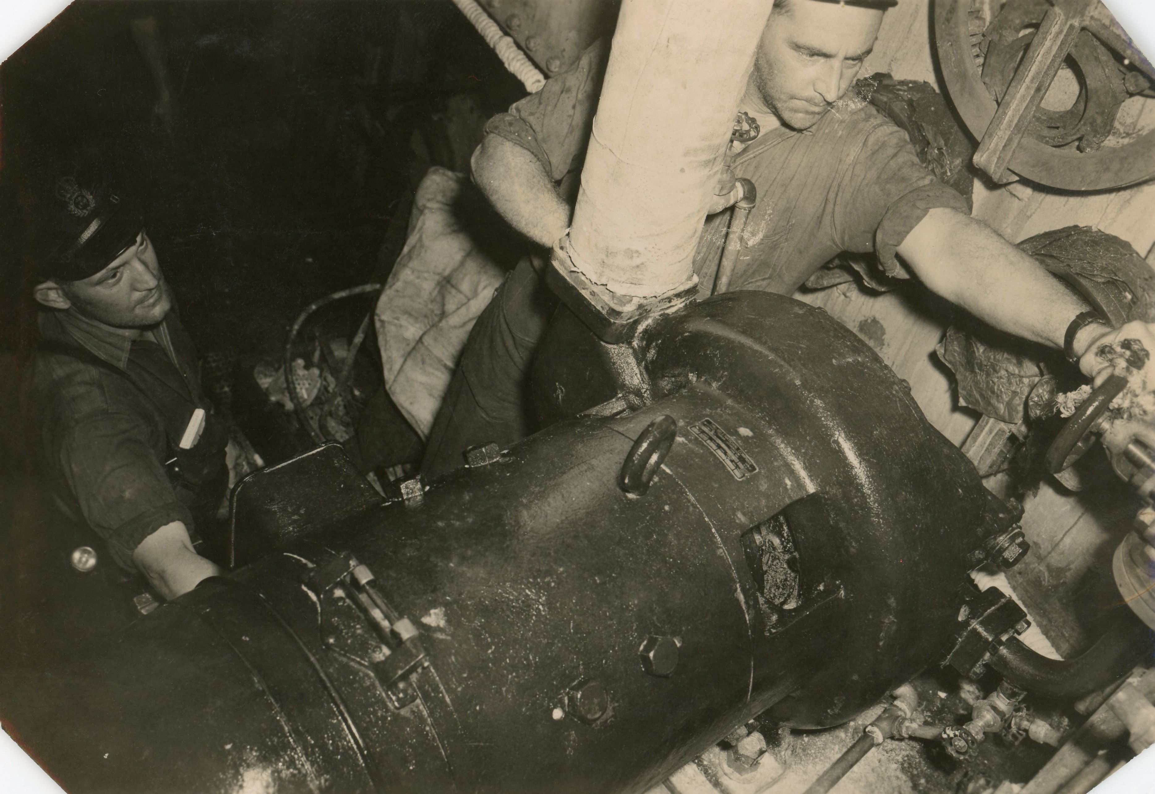 (RFG014 - RFG015) Officer supervising work on the anchor winch on HMCS CHICOUTIMI K156 (RFG016) A depth charge exploding astern of HMCS CHICOUTIMI K156 (RFG017 - FRG018) - Engineers at work on HMCS CHICOUTIMI K156 From the collection of Roy Goforth, Acting Leading Stoker, RCNVR Courtesy of Kevin Goforth